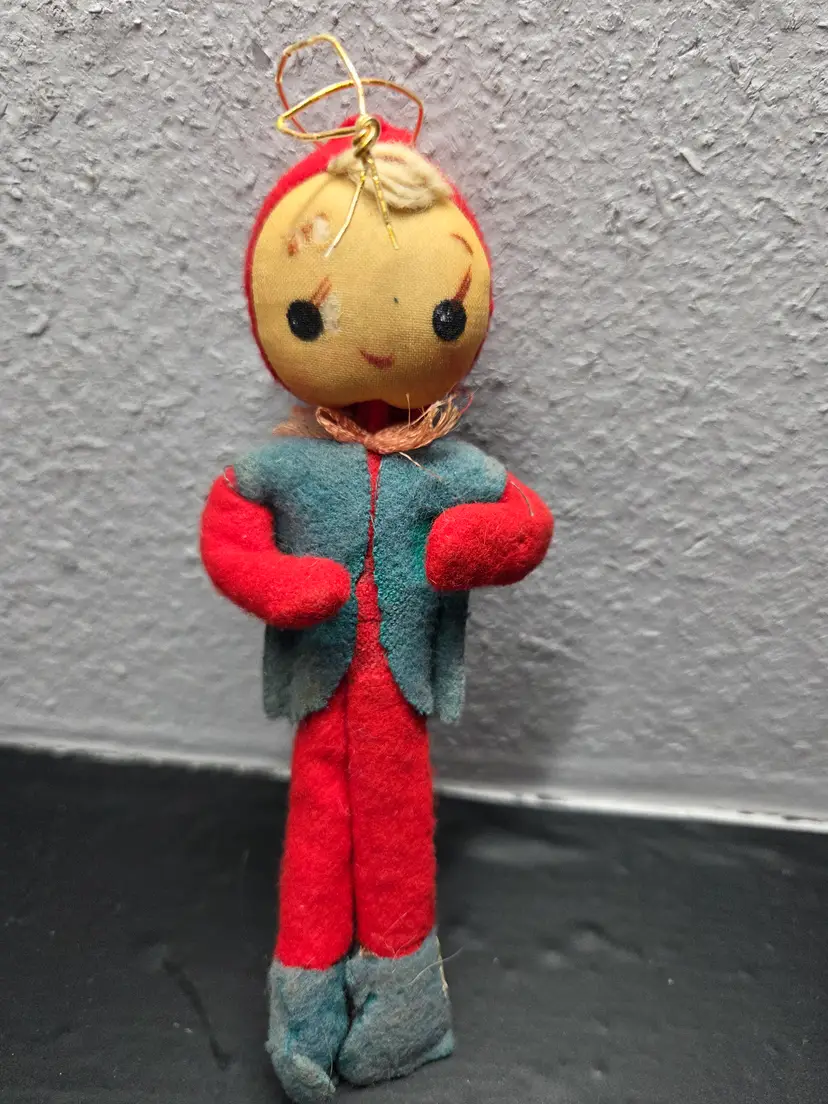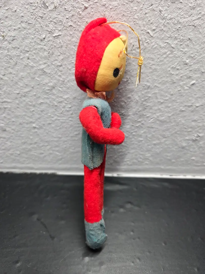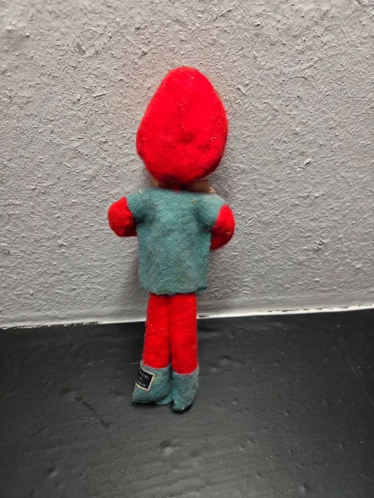 The Vintage Knee Hugger Elf is a 6" figurine with a cloth face, known as the Elf on a Shelf. Made in Japan, this collectible is a charming addition for holiday and seasonal decor. The unique design and craftsmanship of this vintage piece make it a special find for collectors or those looking to add a nostalgic touch to their home during the festive season. C1
