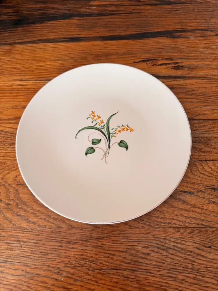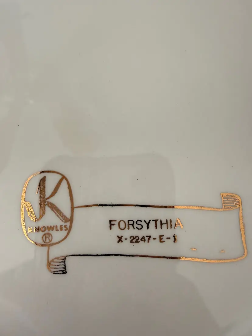 Details Maker: Knowles China Company Pattern: Forsythia Backstamp / Pattern Code: X-2247-E-1 Era: 1930s–1940s Diameter: approx. 10 inches Material: Vintage glazed china Color: Ivory / cream with yellow-orange florals and green leaves Quantity: 1 plate