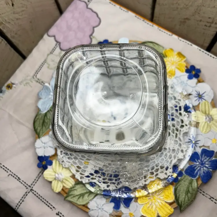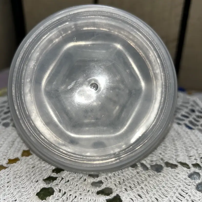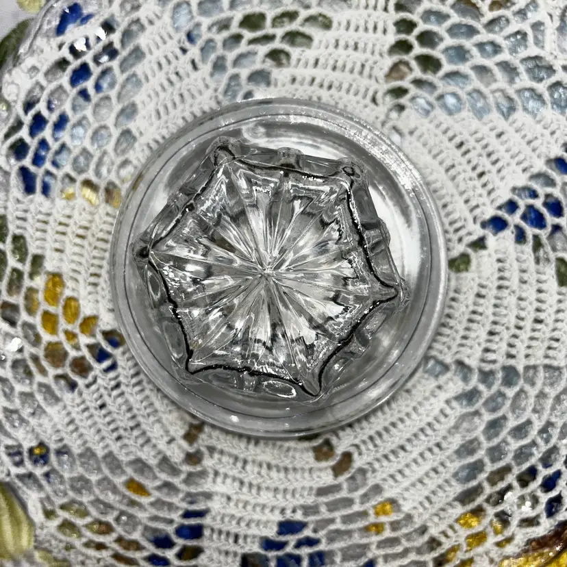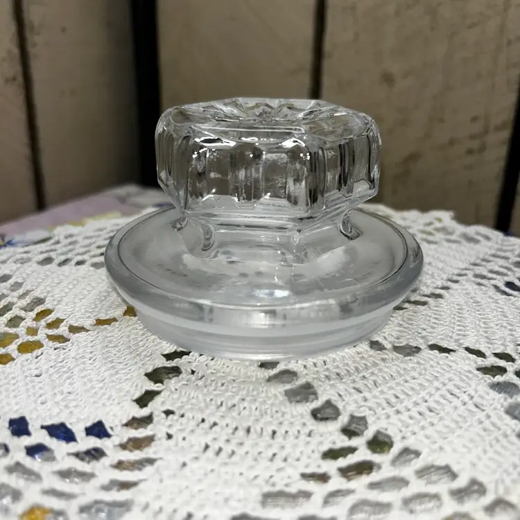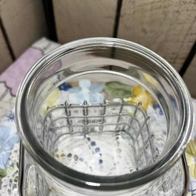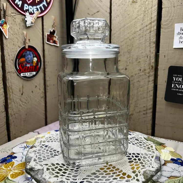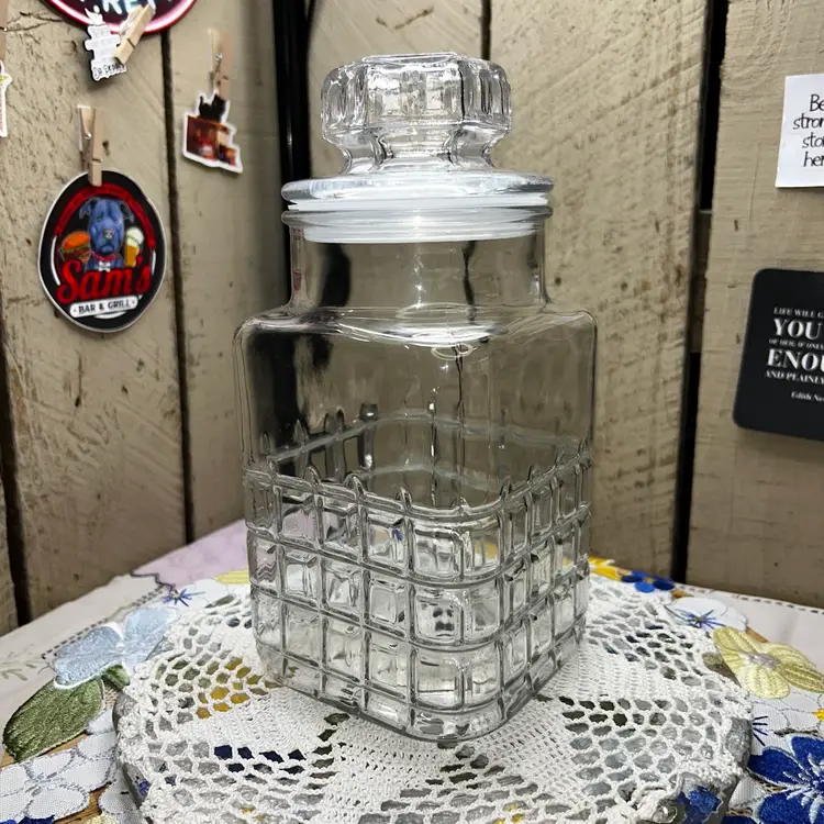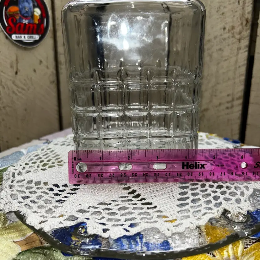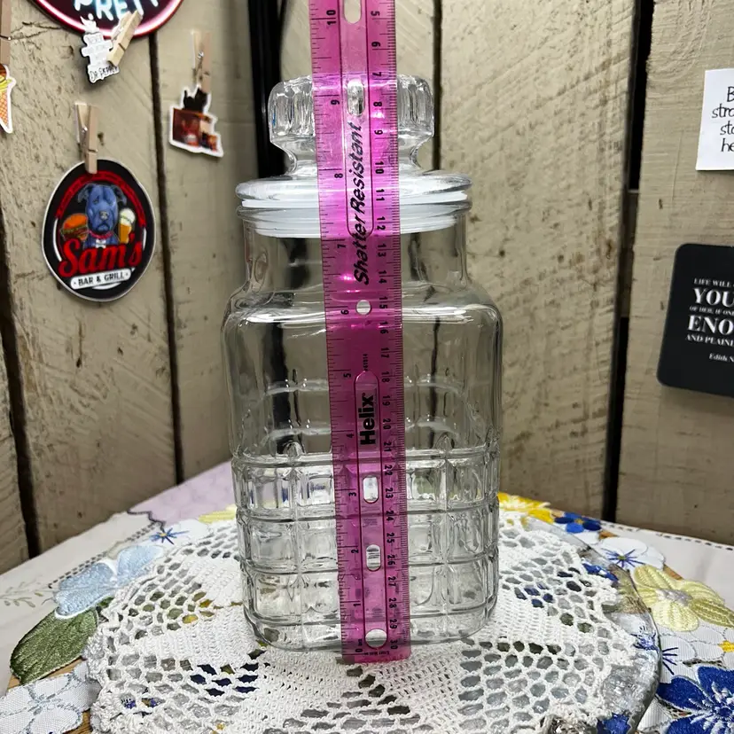 9.75” tall. Large size. Round lid with seal in excellent condition; knob is hexagon. Jar is in excellent condition. No chips or cracks.