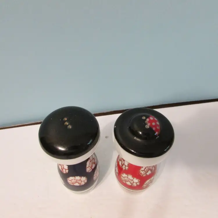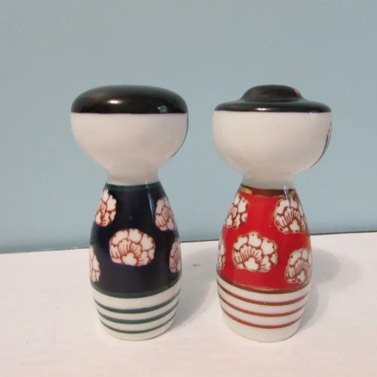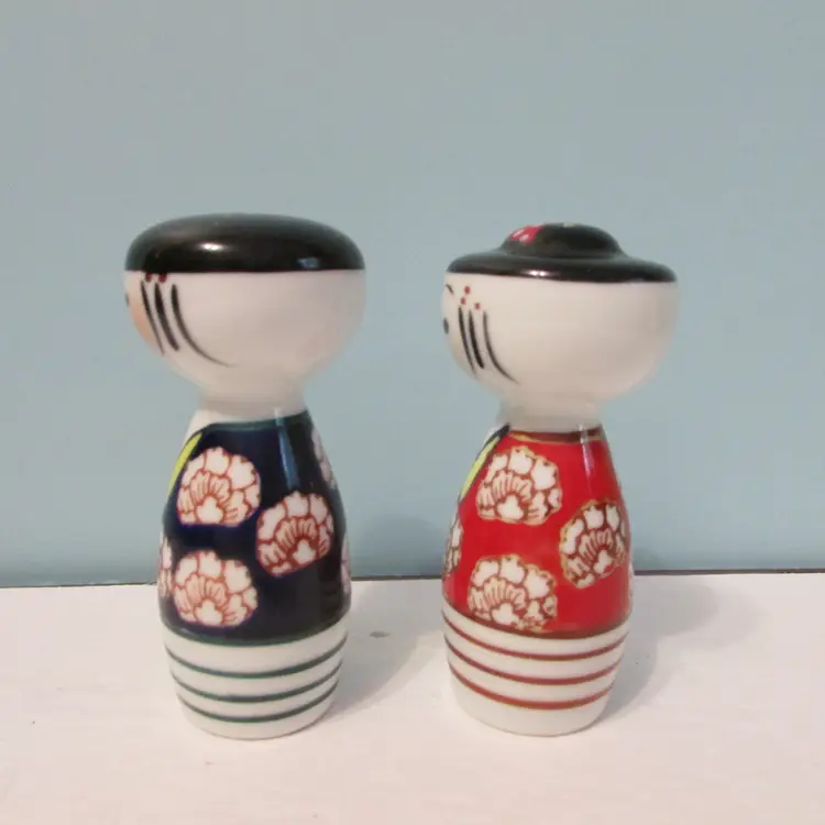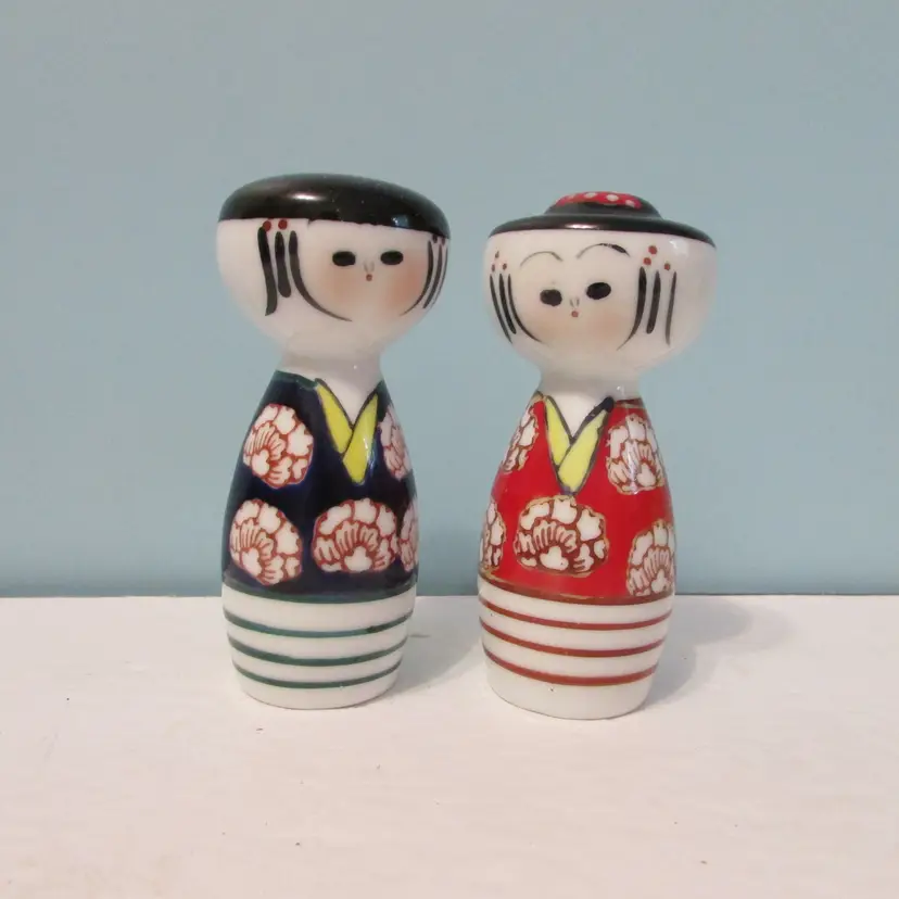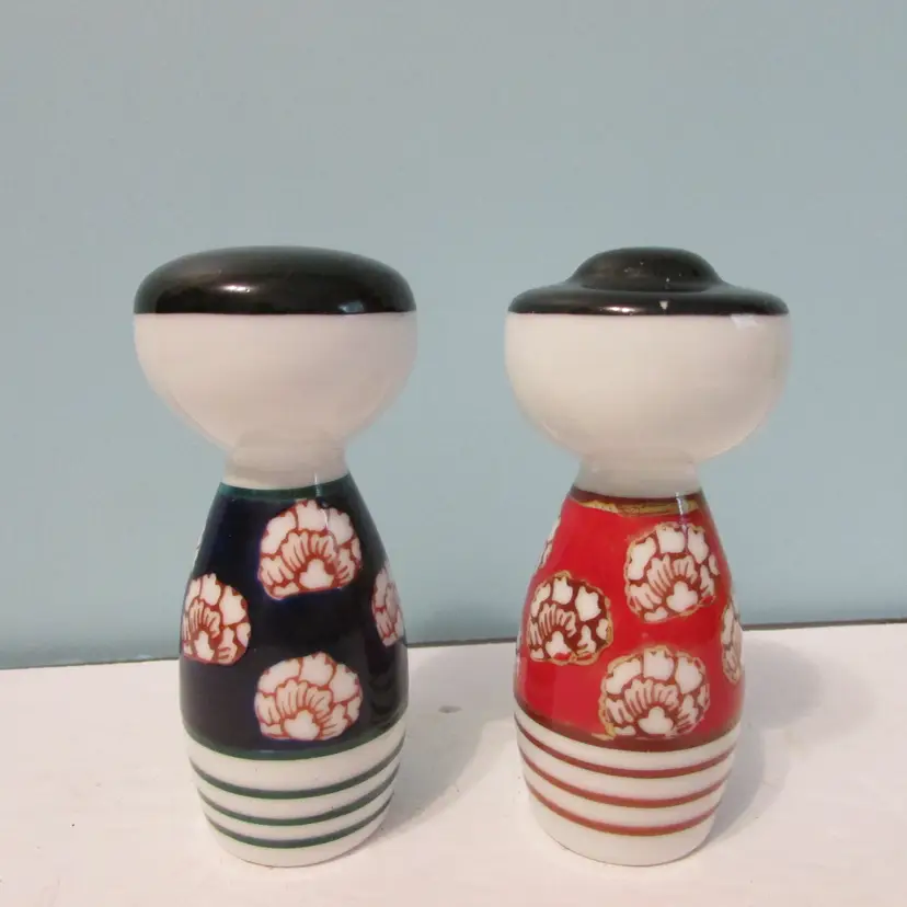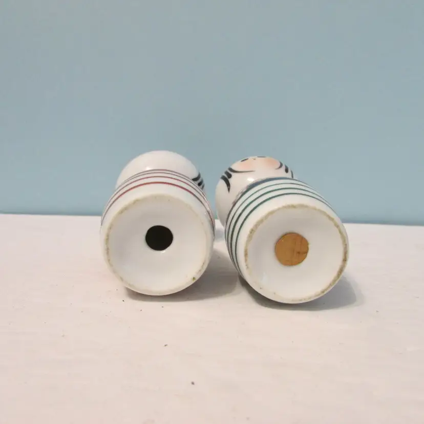 These are a nice set of shakers, the cork is stuck inside the woman shaker, might be able to get out or still a nice decorative piece. Each shaker is about 3 1/2" x 1 3/4". This is shipped from a smoke free home. Thanks for looking!