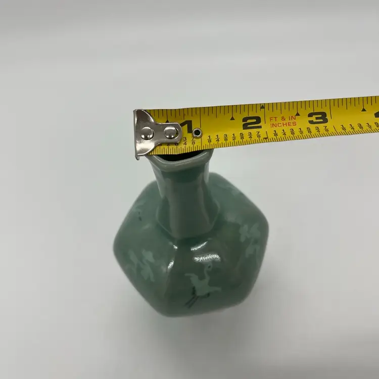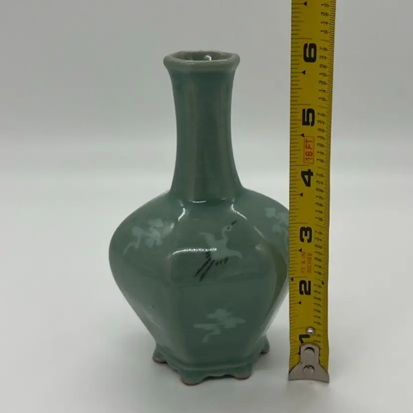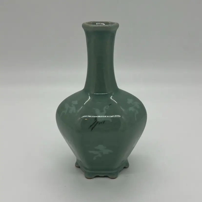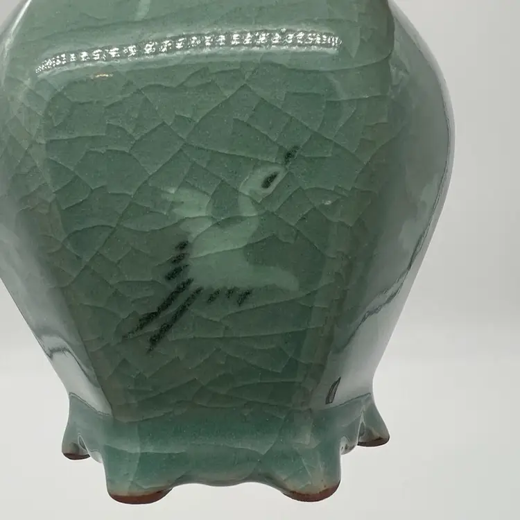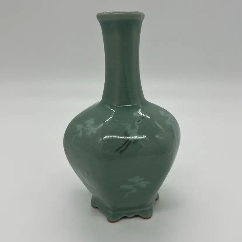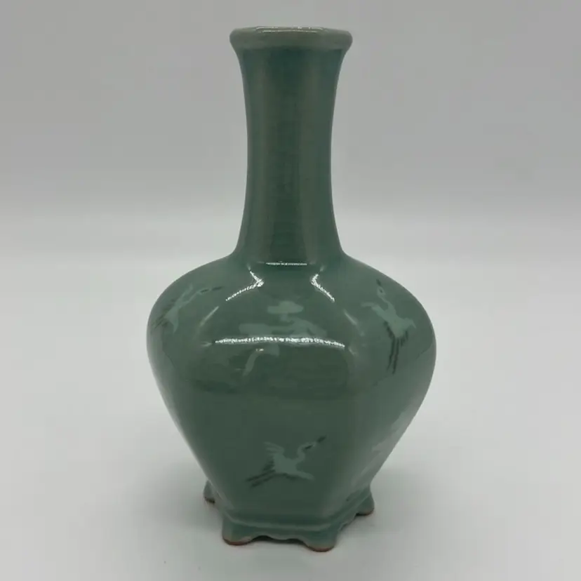 This beautiful bud vase has hand painted cranes in flight in an alternating pattern. This piece measures about 5 3/4” tall. The is crazing as pictured. No chips or cracks.