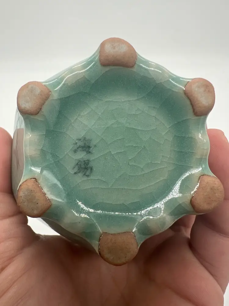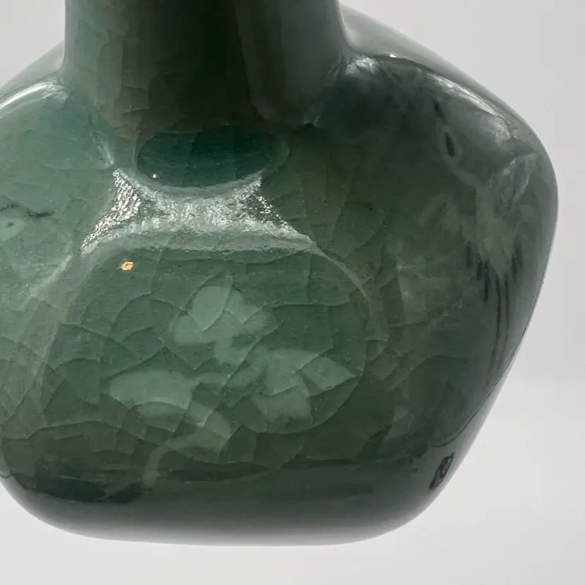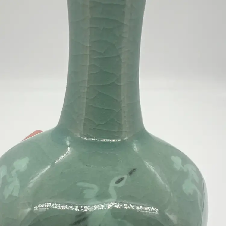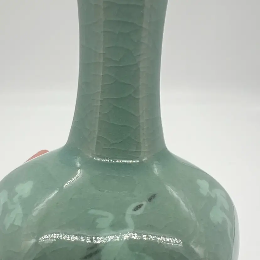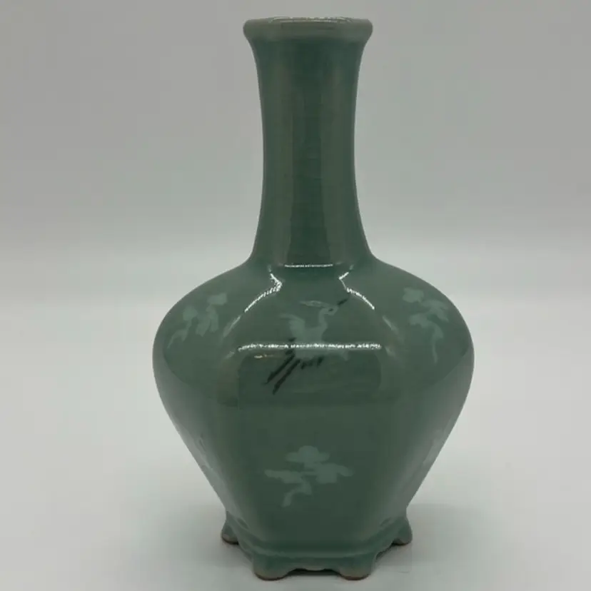 This beautiful bud vase has hand painted cranes in flight in an alternating pattern. This piece measures about 5 3/4” tall. The is crazing as pictured. No chips or cracks.