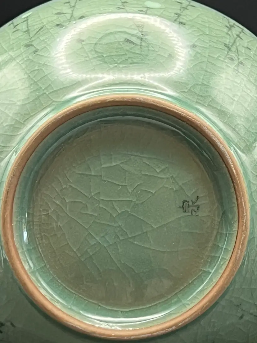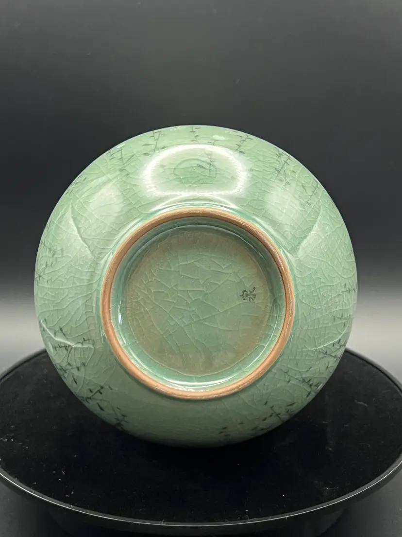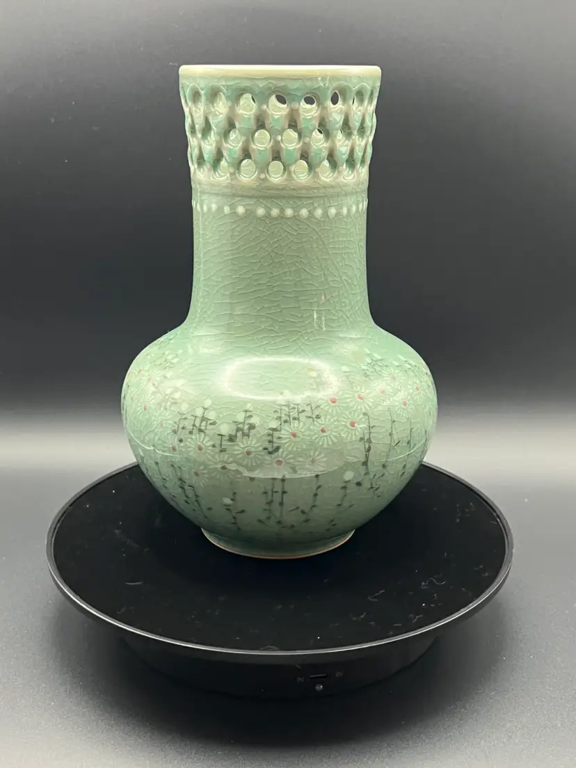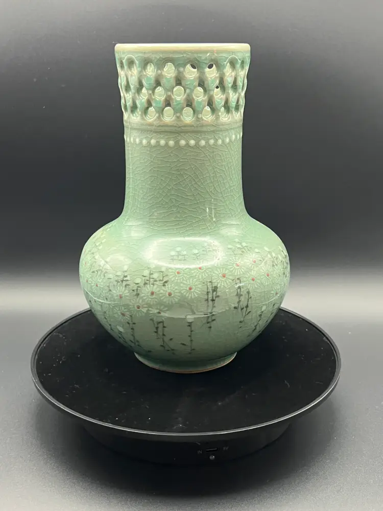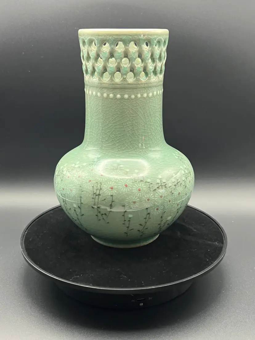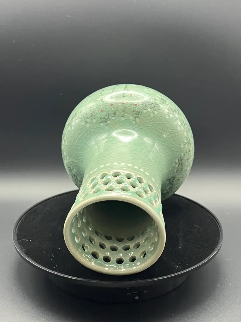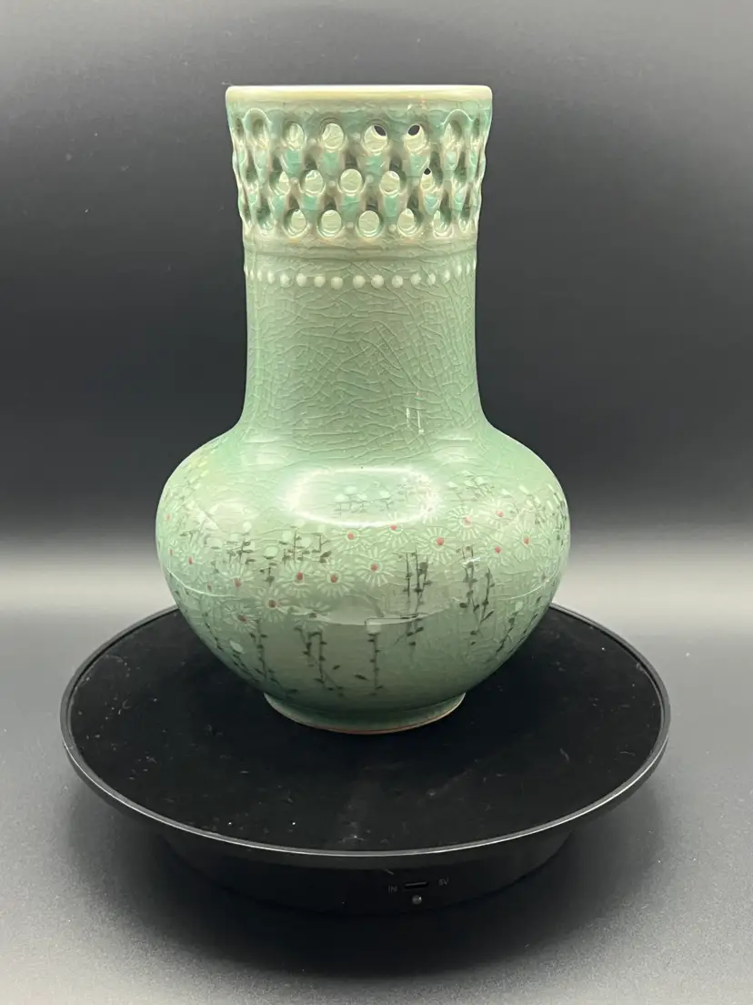This gorgeous celadon vase features a crackle glazed floral pattern. It has a pierced border around the top. It came with a piece of ephemera rolled inside that presumably relates to it's purchase by tits most recent owner, an art collector. It is marked on the bottom - but attempts to ID the mark are unsuccessful. The vase is 7.5" tall, 5.5" diameter. No chips or cracks. Please see all photos.
