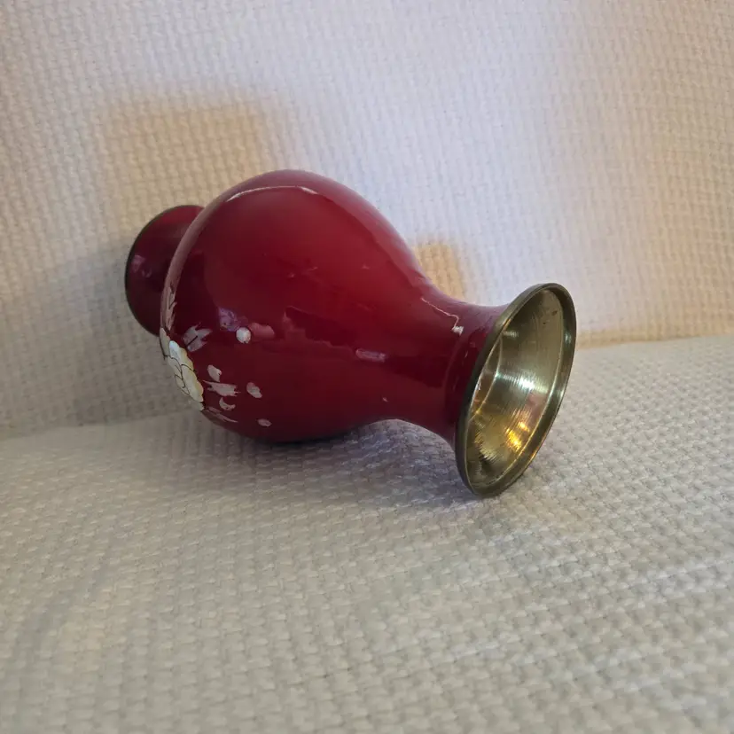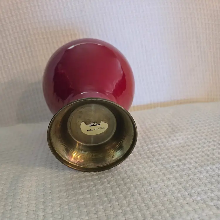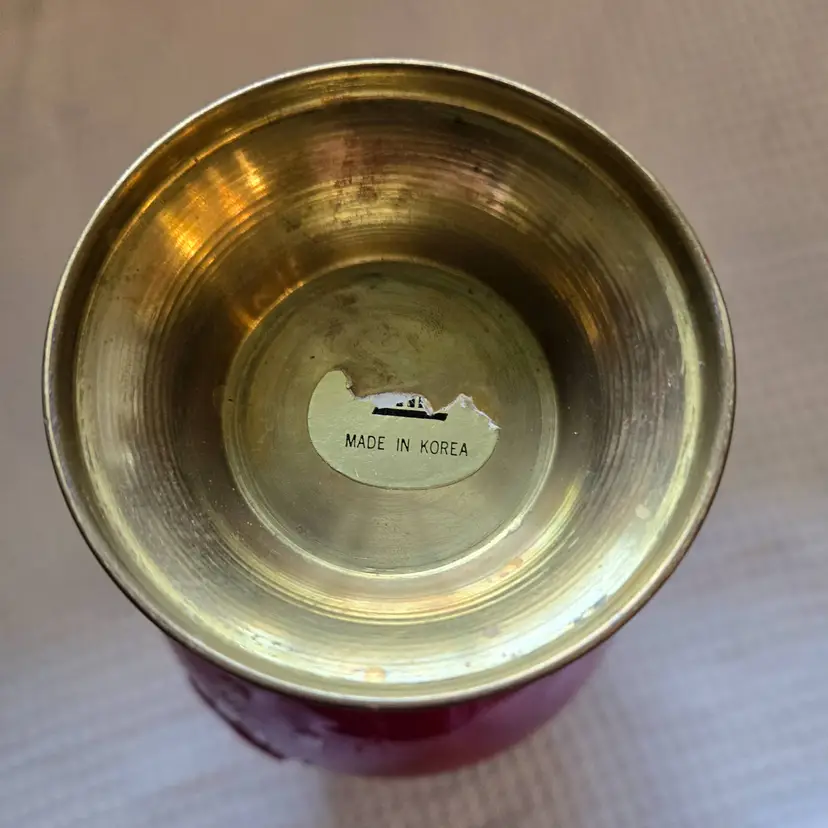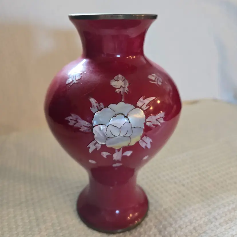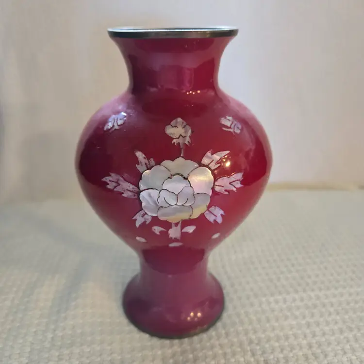 This is a vintage lacquer over brass vase with a mother of pearl floral designs. Made in Korea in the mid 20th century. Measures 7" tall and 4" at widest part. The opening is 2". In excellent condition. It has part of the original sticker on the bottom. A simple but elegant piece.
