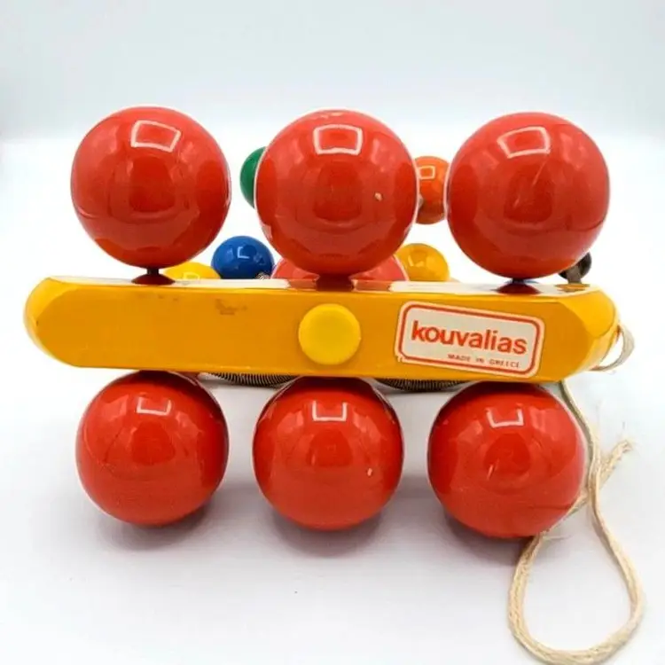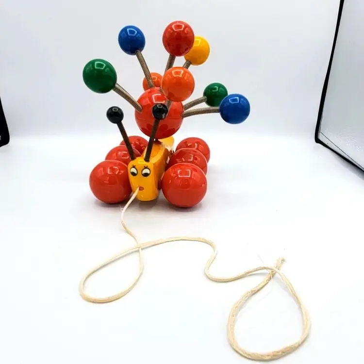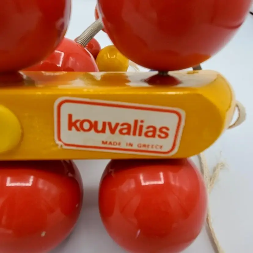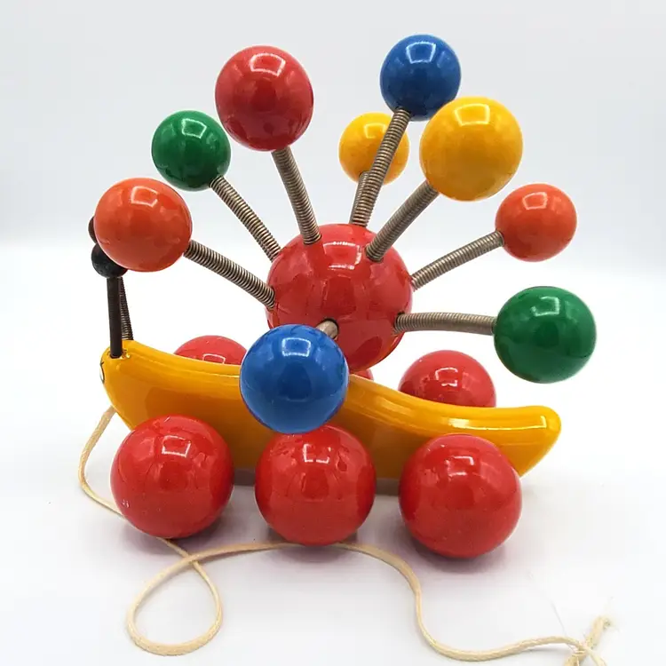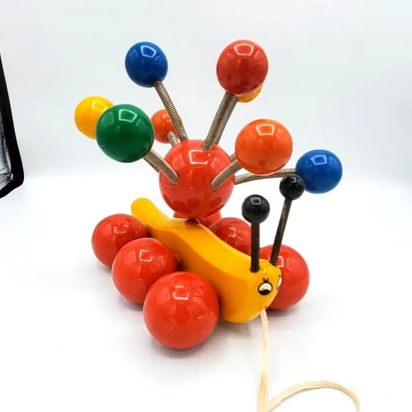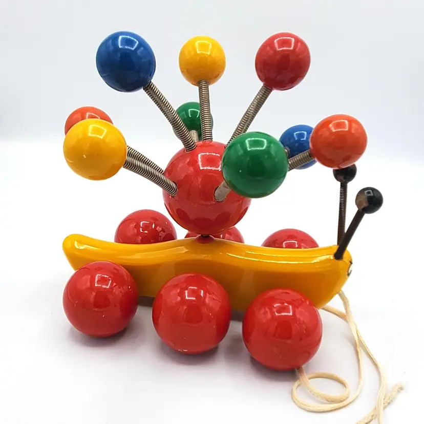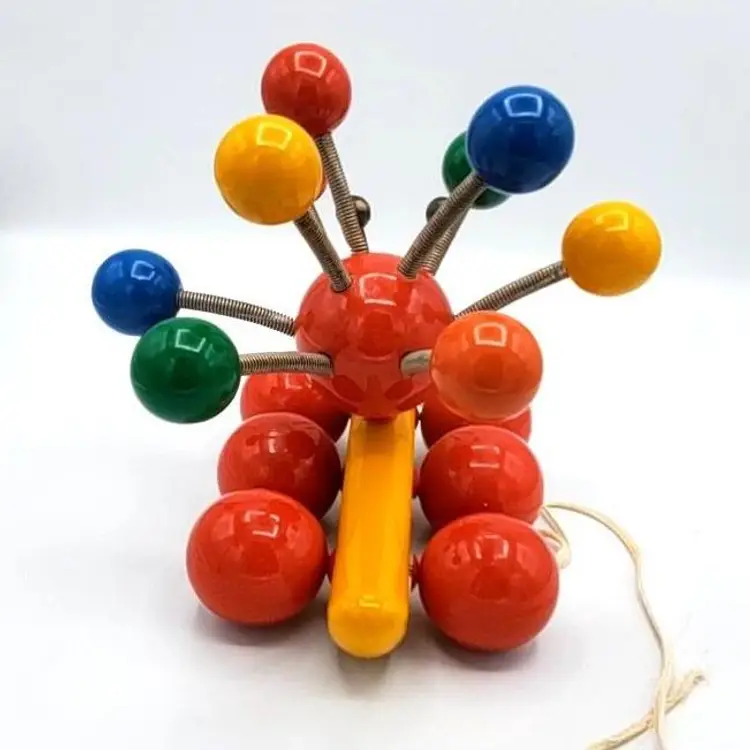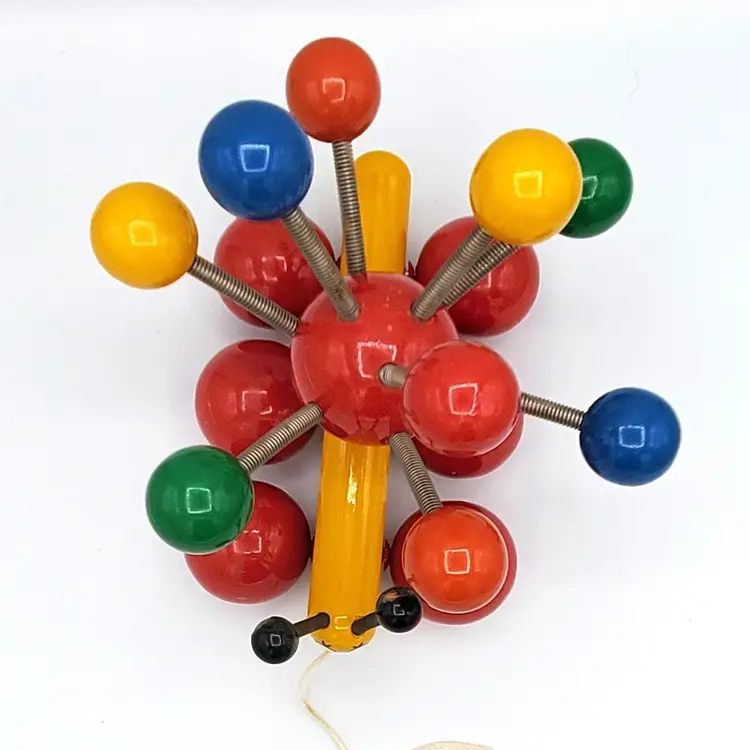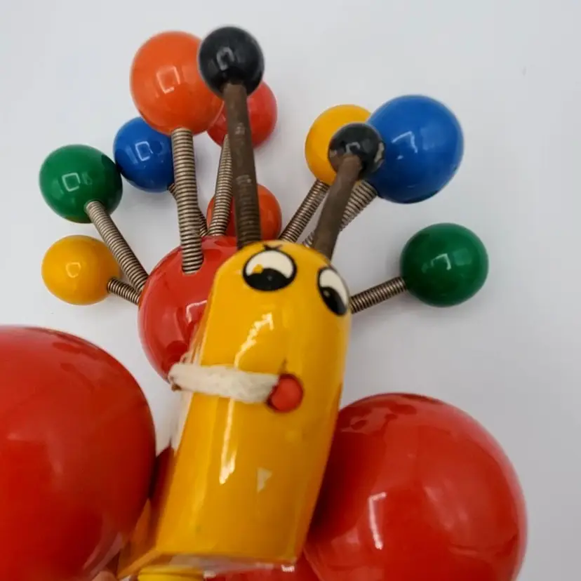 Such a sweet and colorful toy. It's so simple and yet even pleasing to the eye of an adult. He's about 7" in all directions. There is some scuffing from use but no real damage. The springs are still very springy. Thanks for looking!