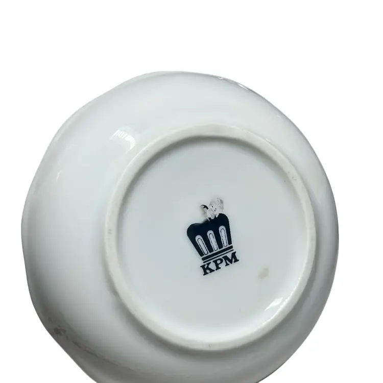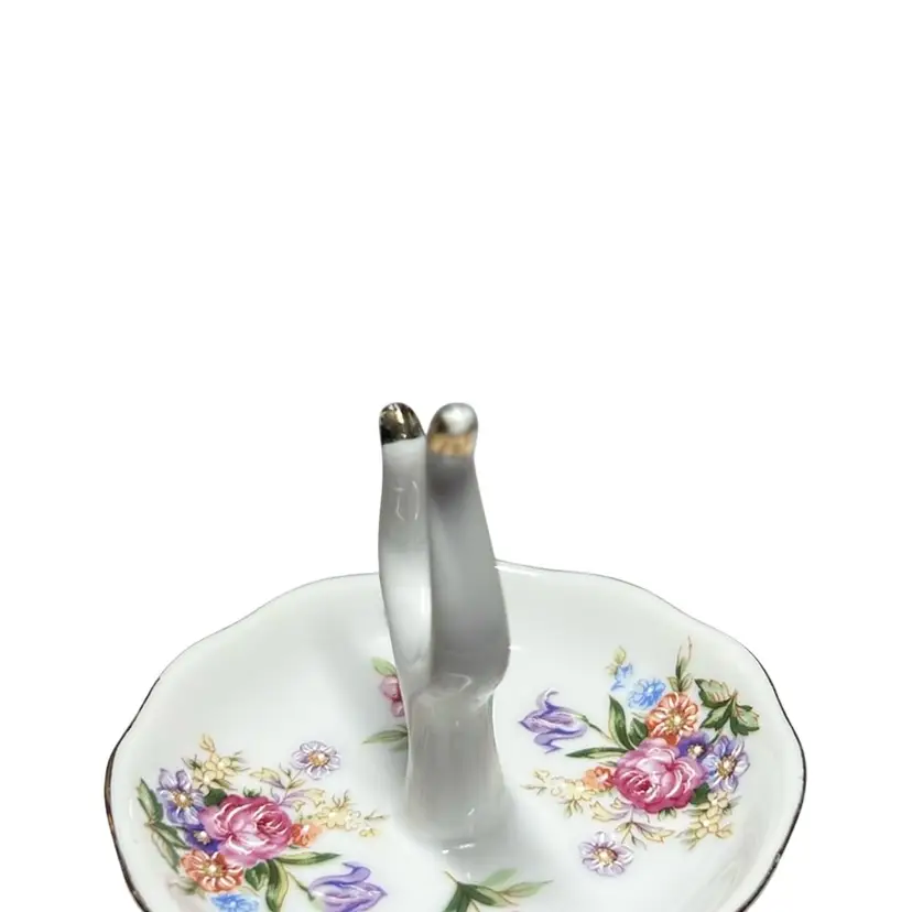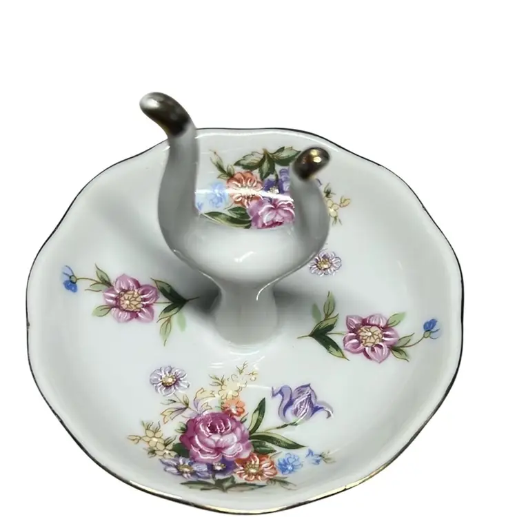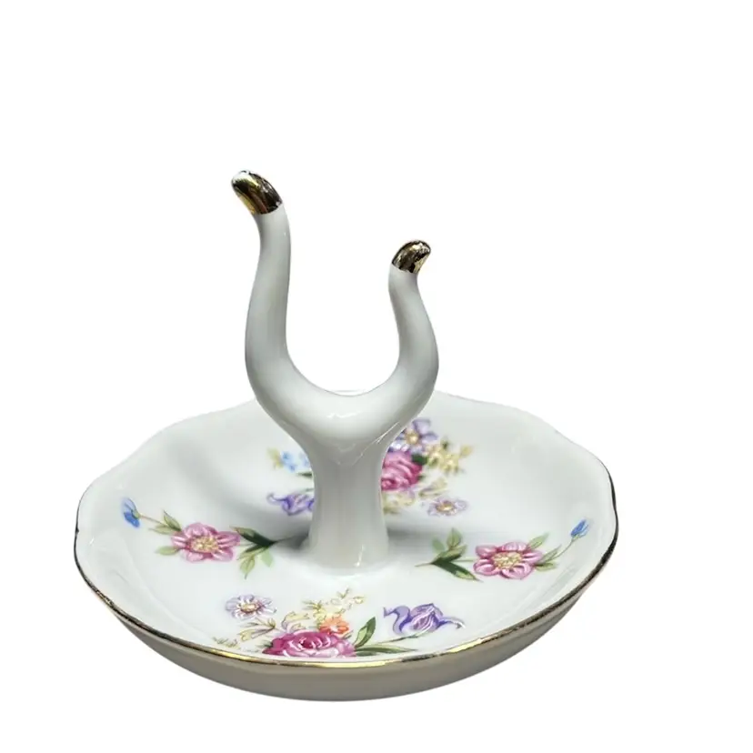 Holder is forked out at top to fit multiple rings. Has gold tone rim. One top post has gold paint wear. No damage and measures 3” tall & 3.5” wide