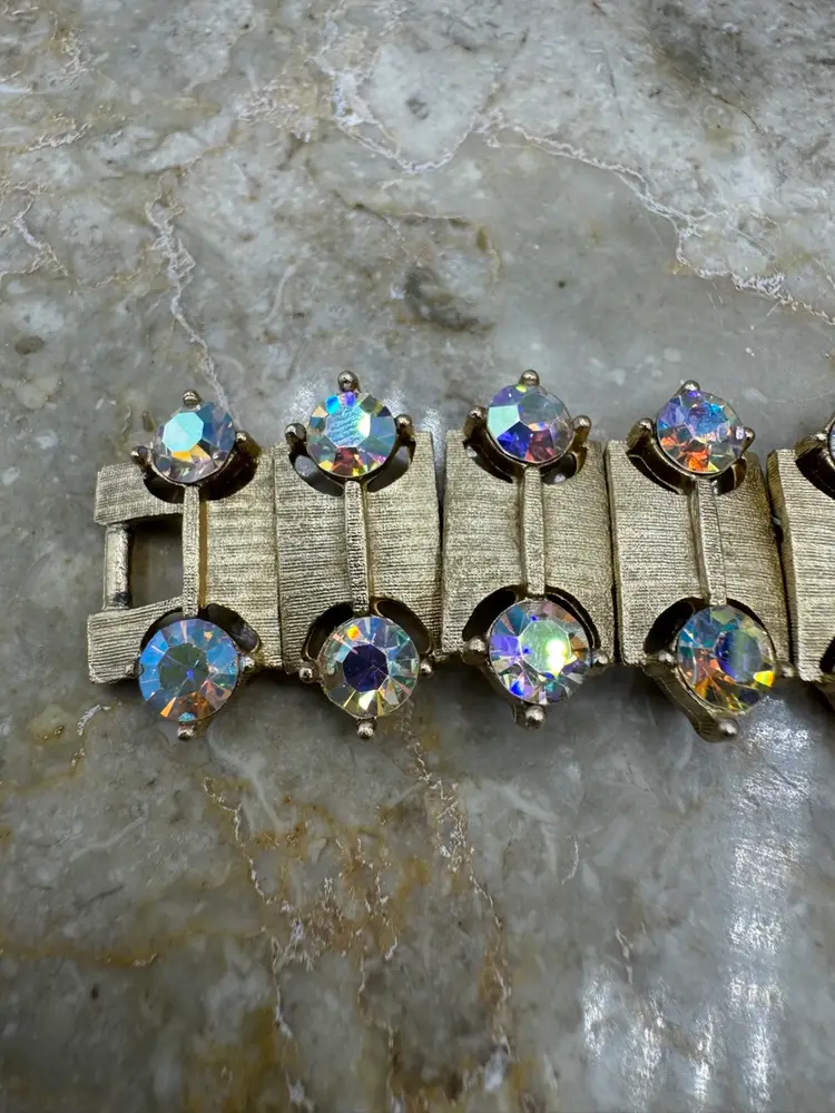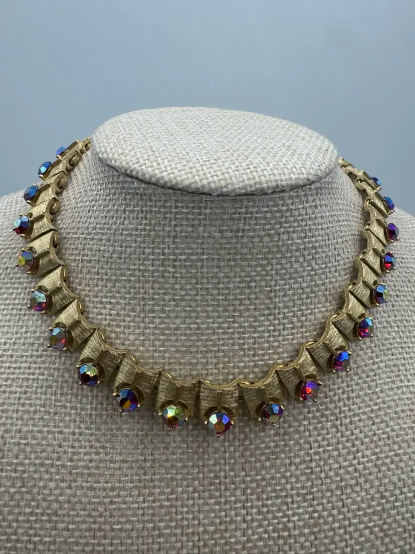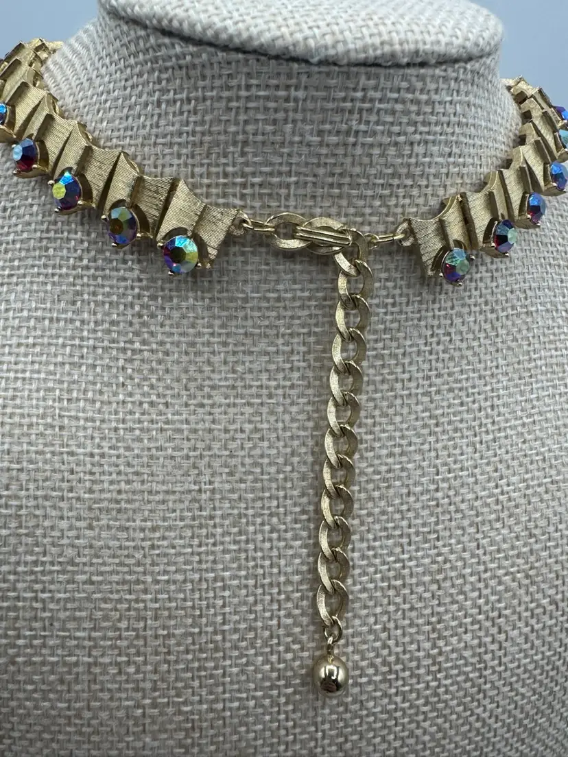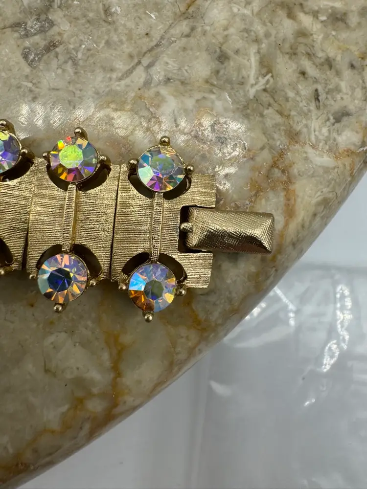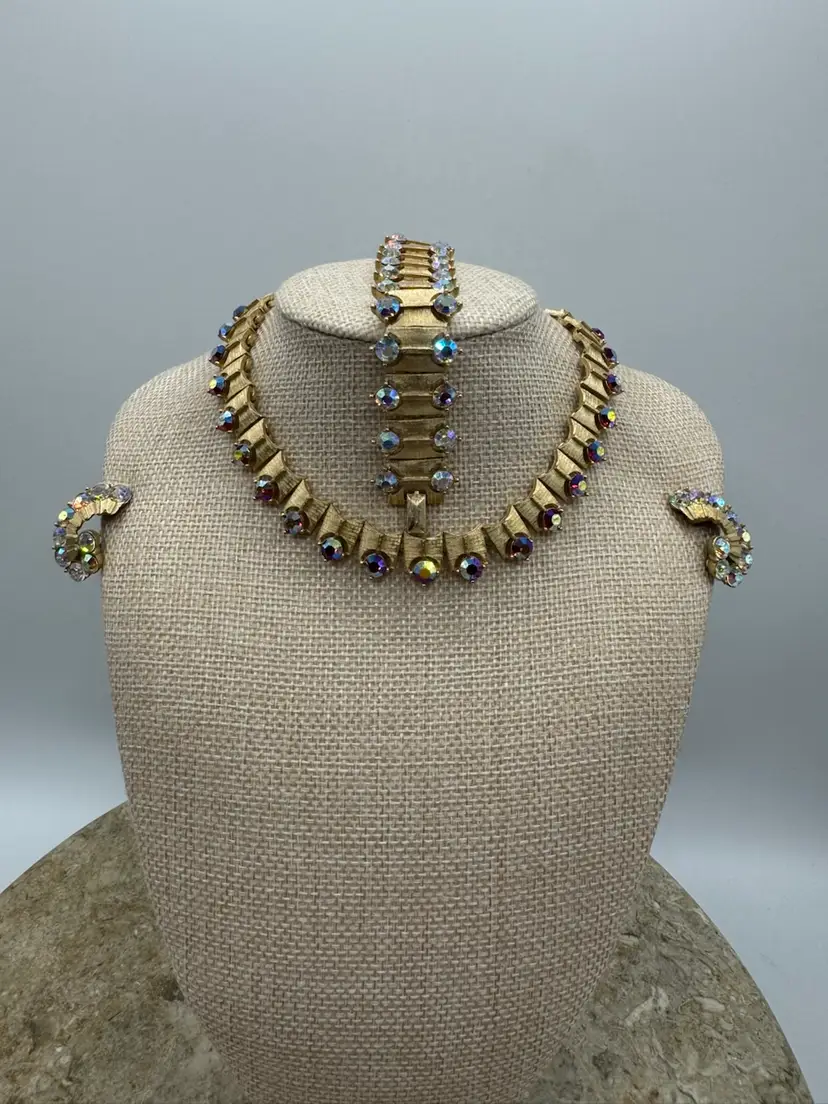 Vintage Kramer Gold Tone Aurora Borealis Necklace Bracelet & Clip Earring Set. This gorgeous set is in pristine condition. The pieces are signed Kramer. Bracelet 7” Necklace 13” with 3” extender Earrings 1 1/4” X 1/2