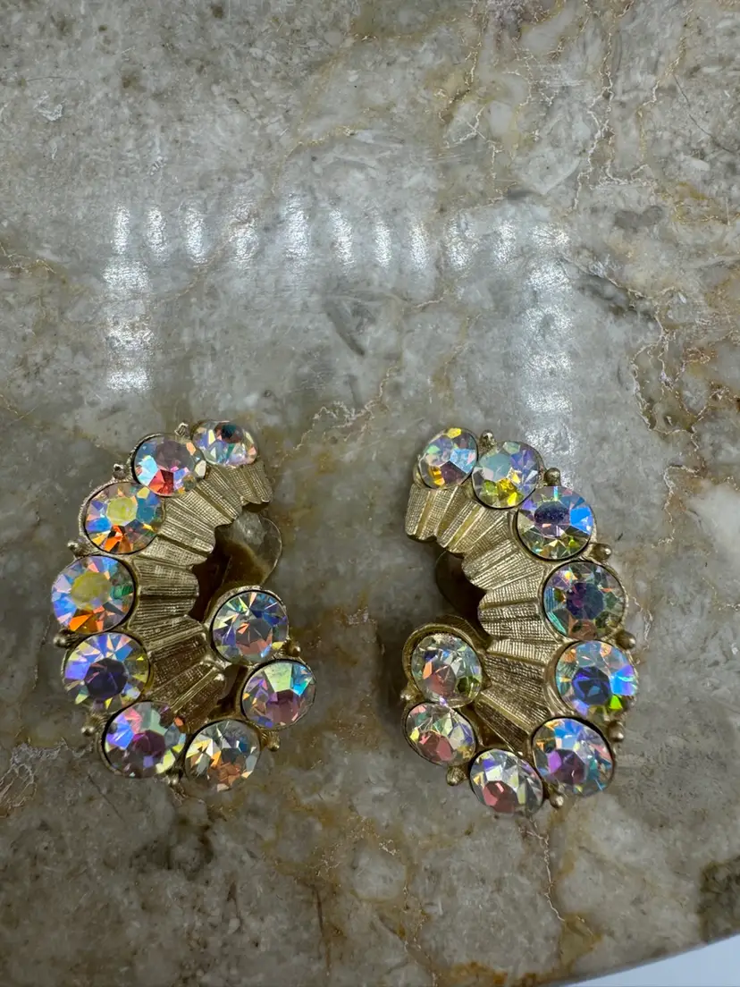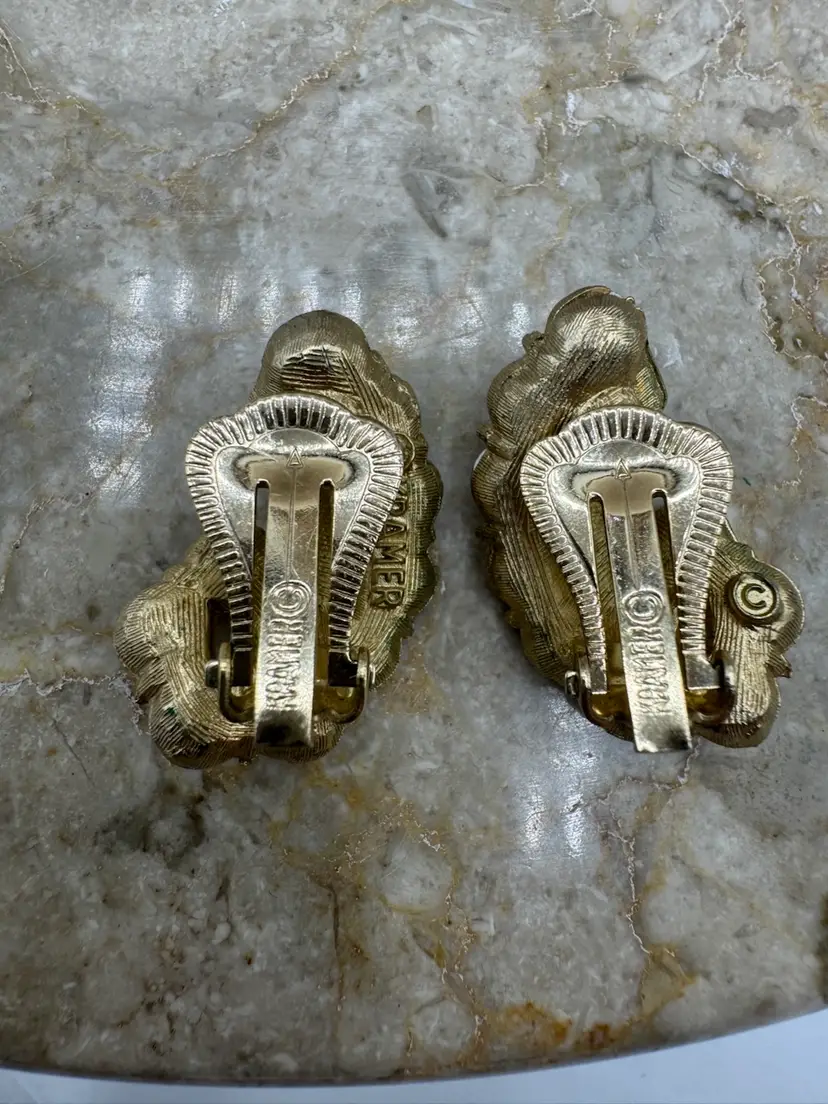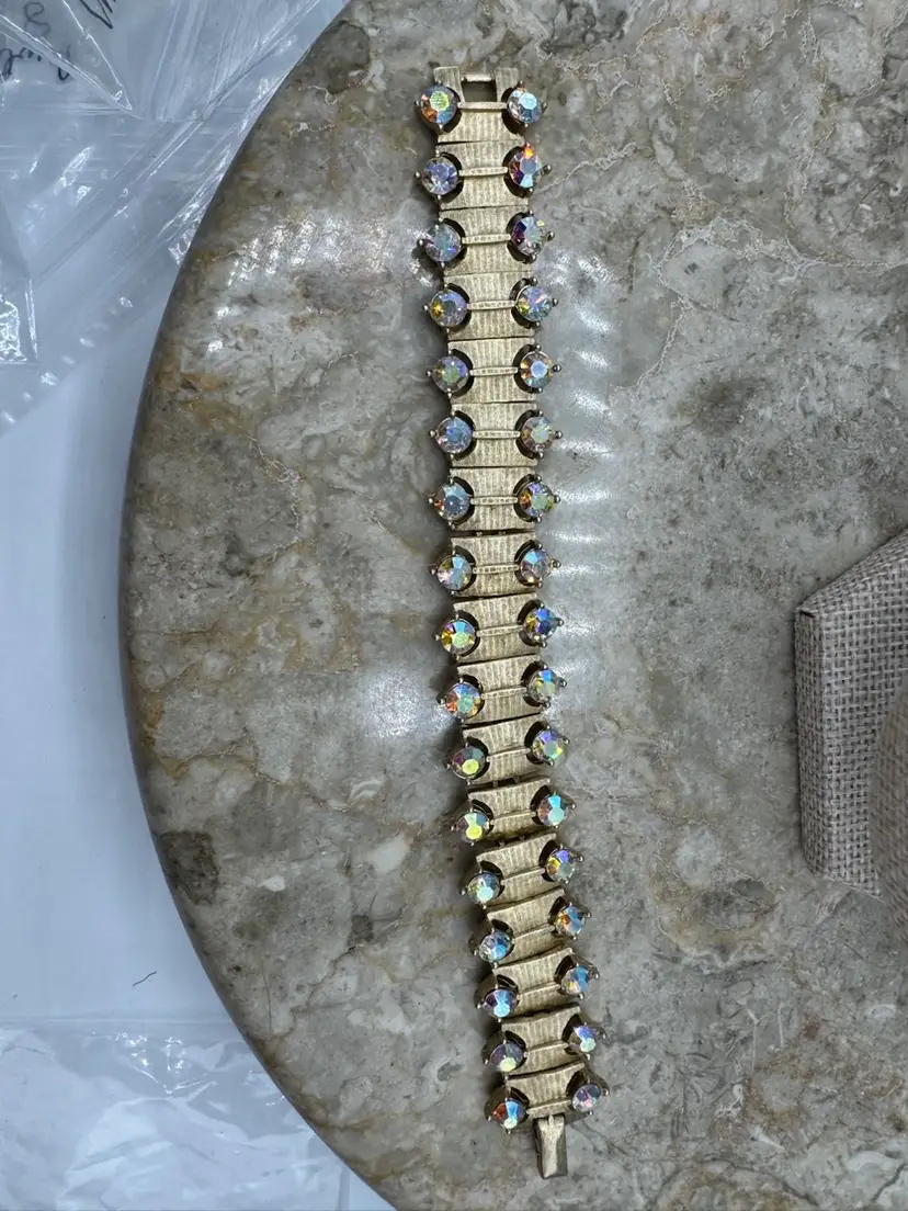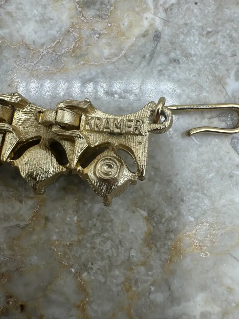Vintage Kramer Gold Tone Aurora Borealis Necklace Bracelet & Clip Earring Set. This gorgeous set is in pristine condition. The pieces are signed Kramer. Bracelet 7” Necklace 13” with 3” extender Earrings 1 1/4” X 1/2