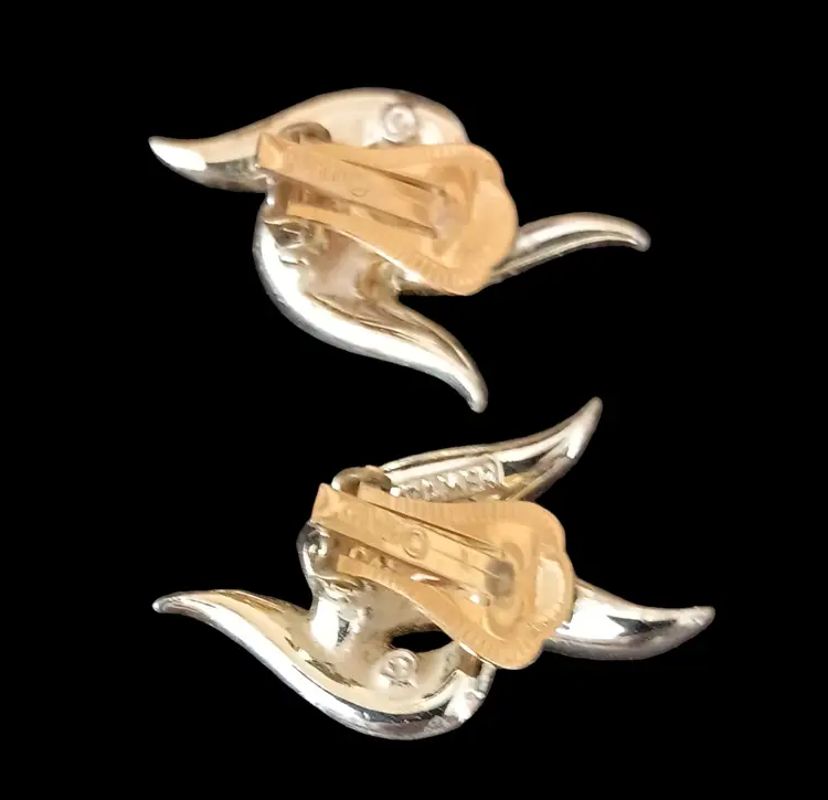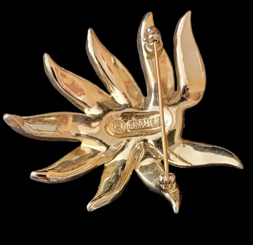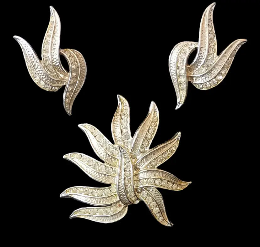 This is a rare vintage Kramer set featuring an elegant starburst brooch (2.5"x2") and matching clip-on earrings (1"x1.5") adorned with sparkling rhinestones. Perfect for adding a touch of vintage glamour to any outfit.