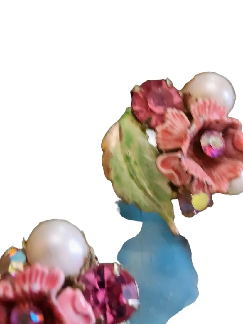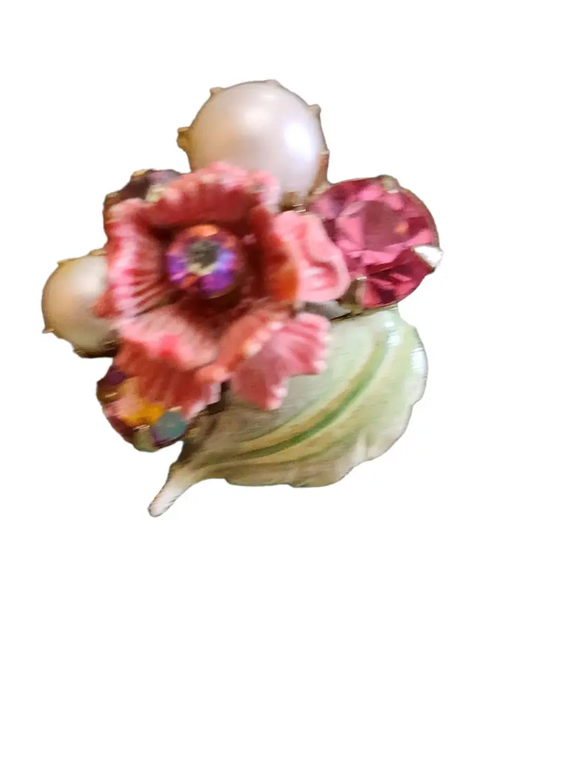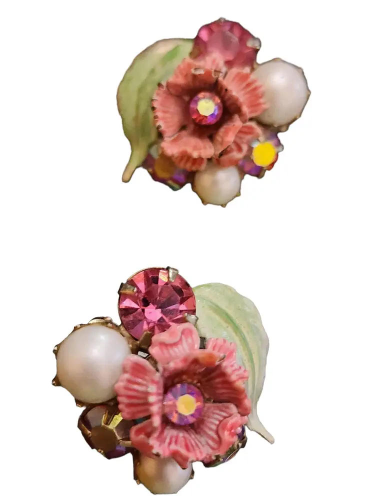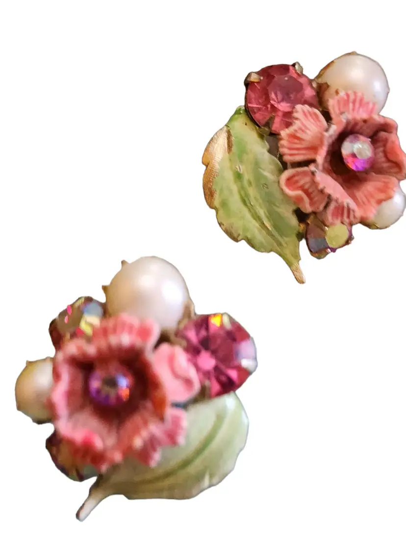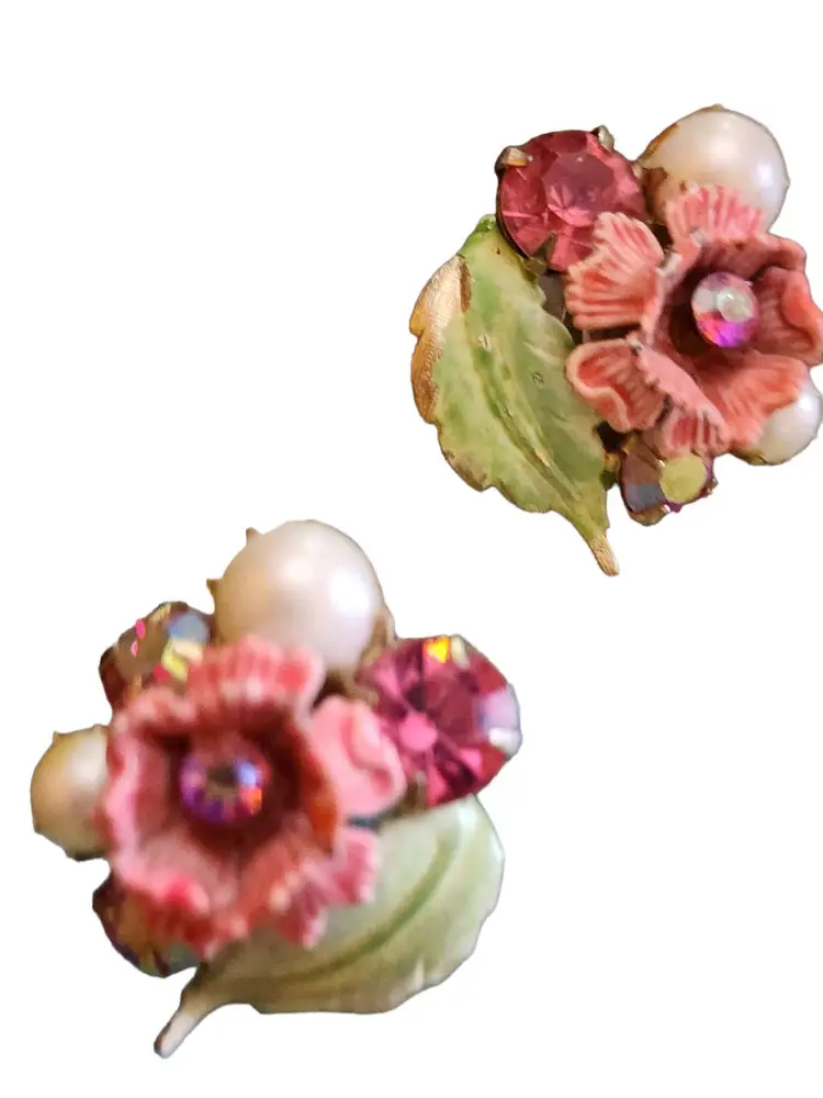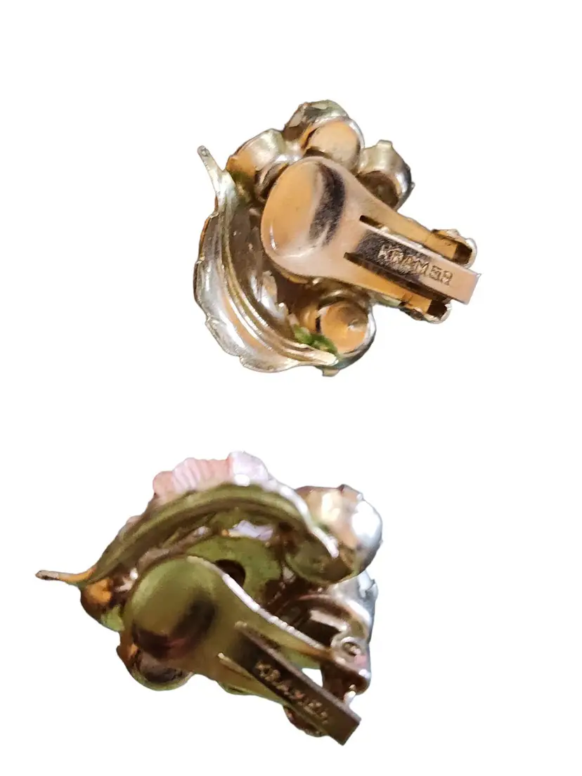 Size: 1'' Color: Pink, white, green and gold Condition: Good vintage Signed: Kramer Details: 1 leaf on 1 ear has some slight enamel loss but still very nice earrings