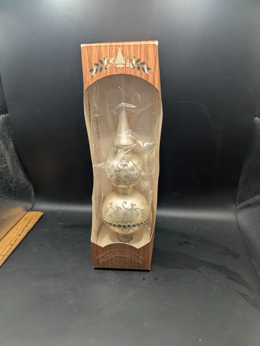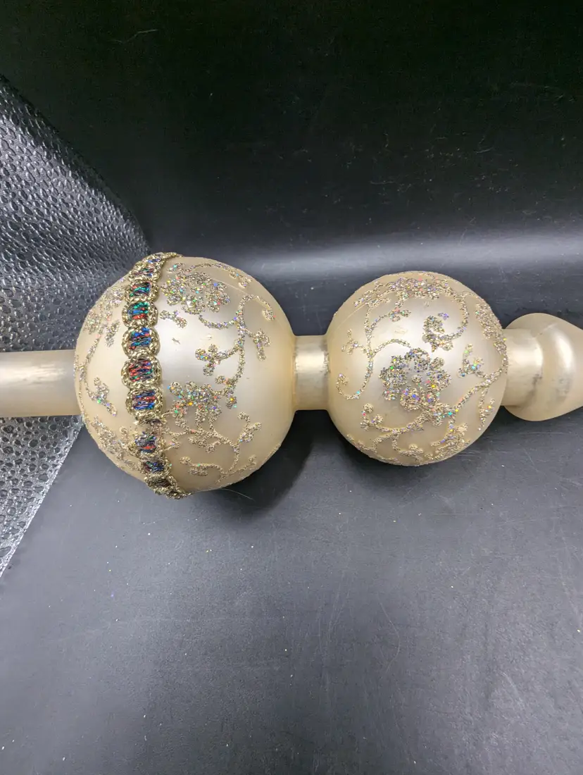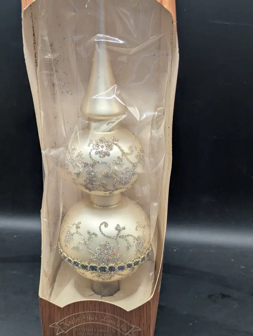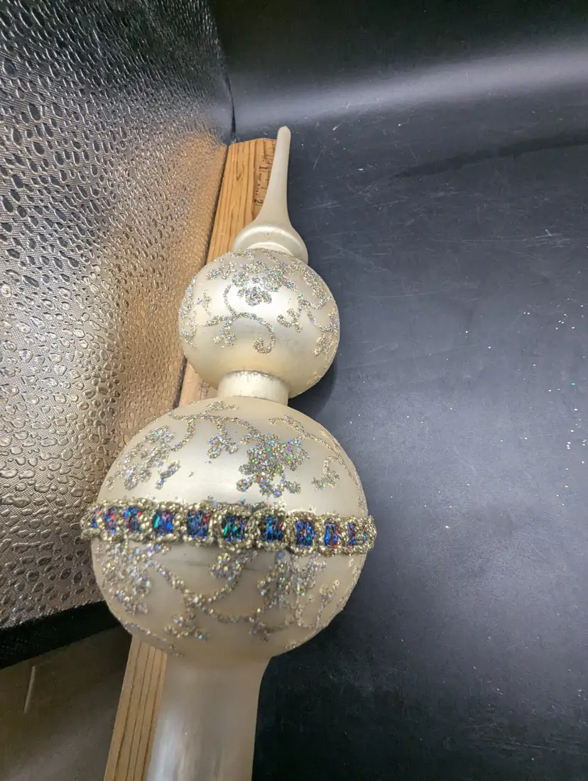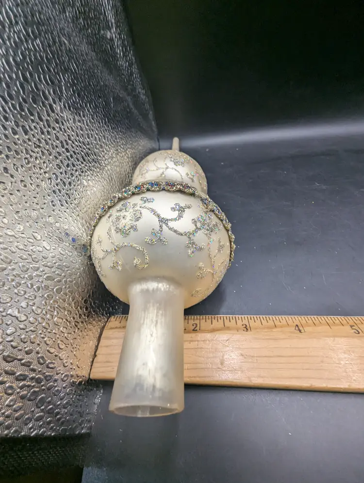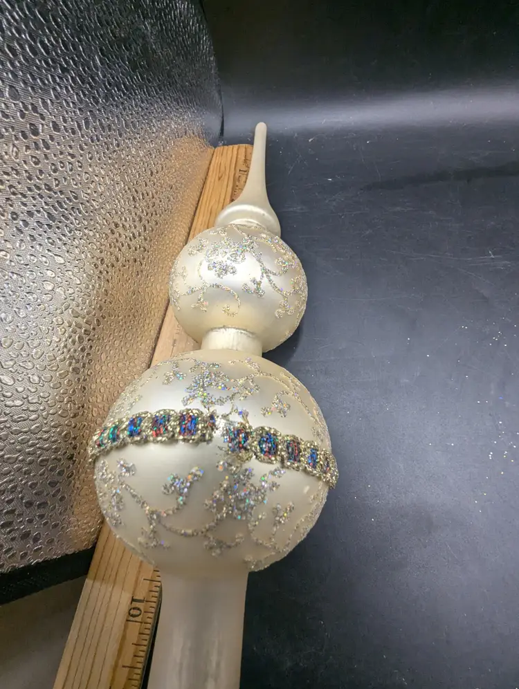 This is a stunning Vintage Krebs Glas Glass Lauscha Ivory Christmas Tree Topper 11" Decorated Glitter With Embellishments in Box. Please see all pictures for condition and measurements.
