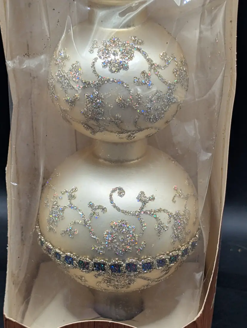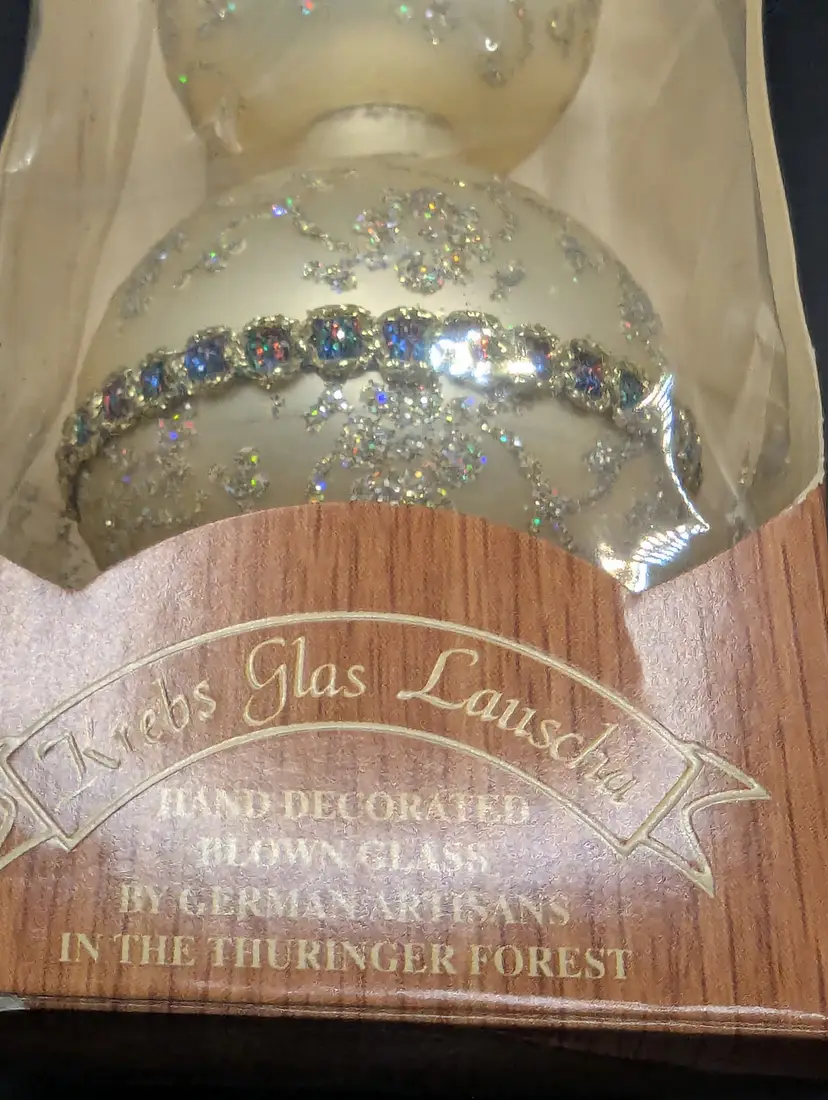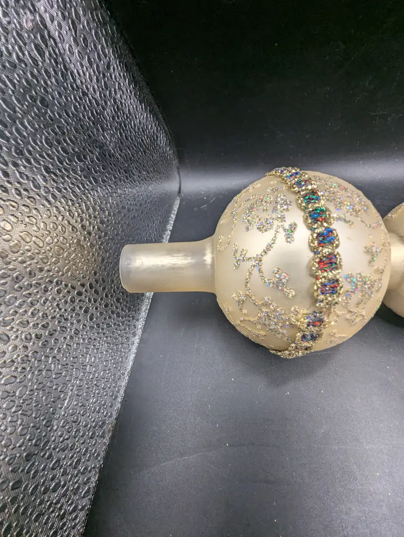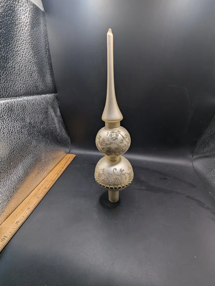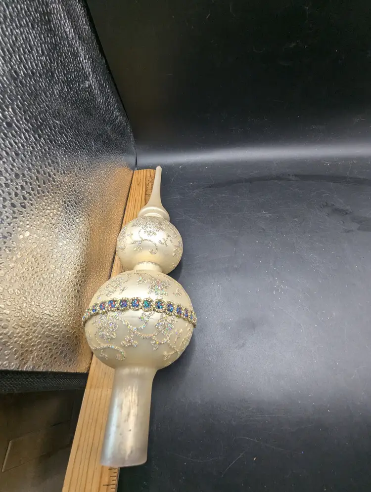 This is a stunning Vintage Krebs Glas Glass Lauscha Ivory Christmas Tree Topper 11" Decorated Glitter With Embellishments in Box. Please see all pictures for condition and measurements.