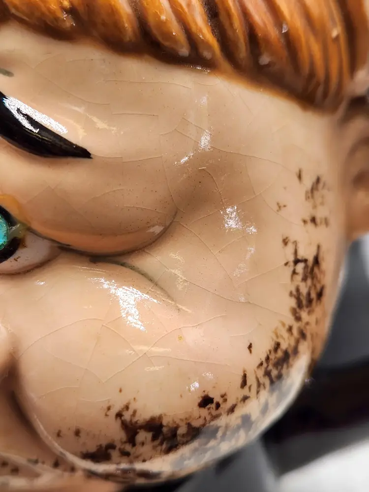 No chips or cracks, but it has crazing. Two different eye colors. I am not sure if it's original or not. This would be a display piece due to crazing. Please see the pictures.