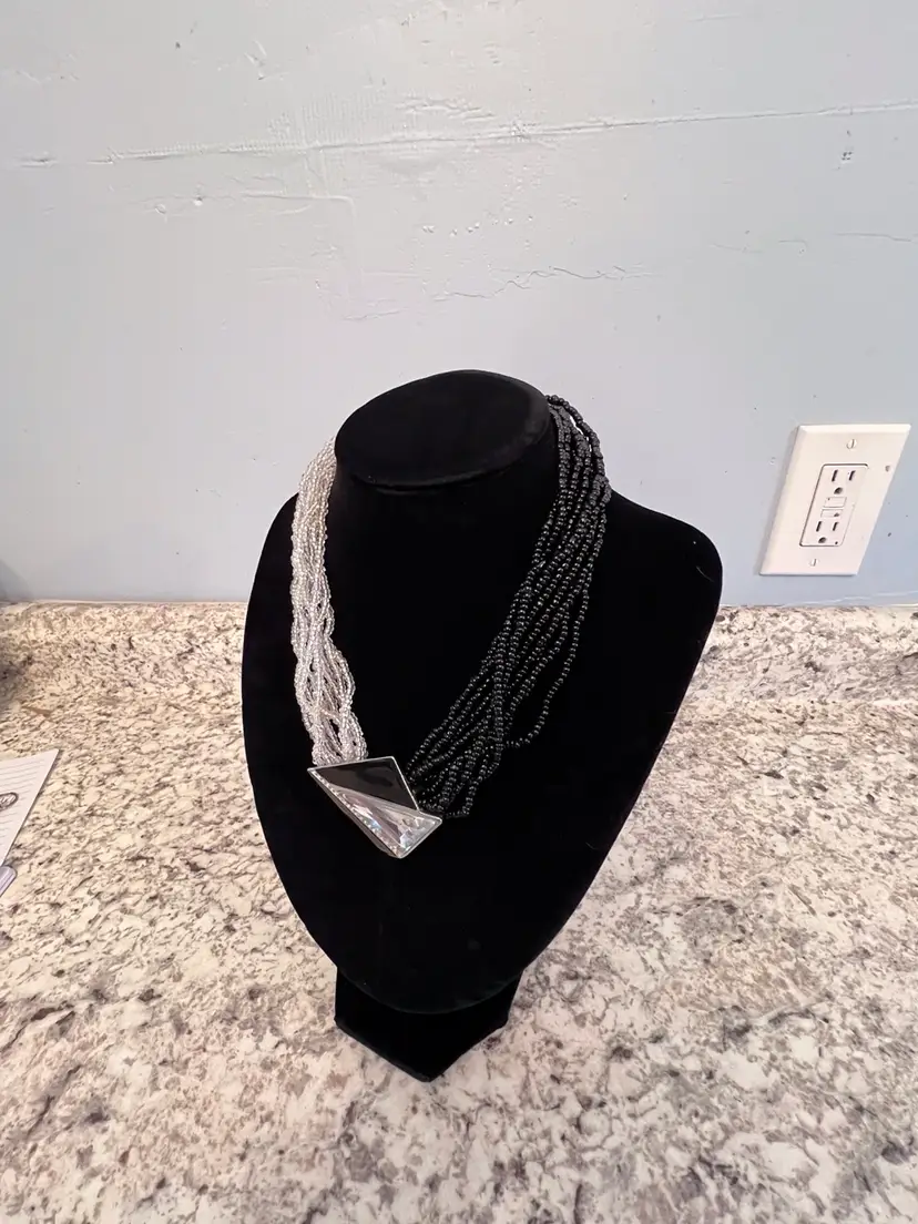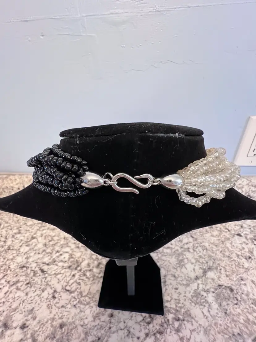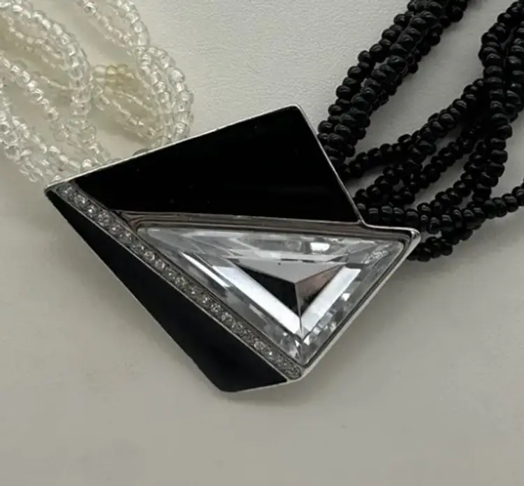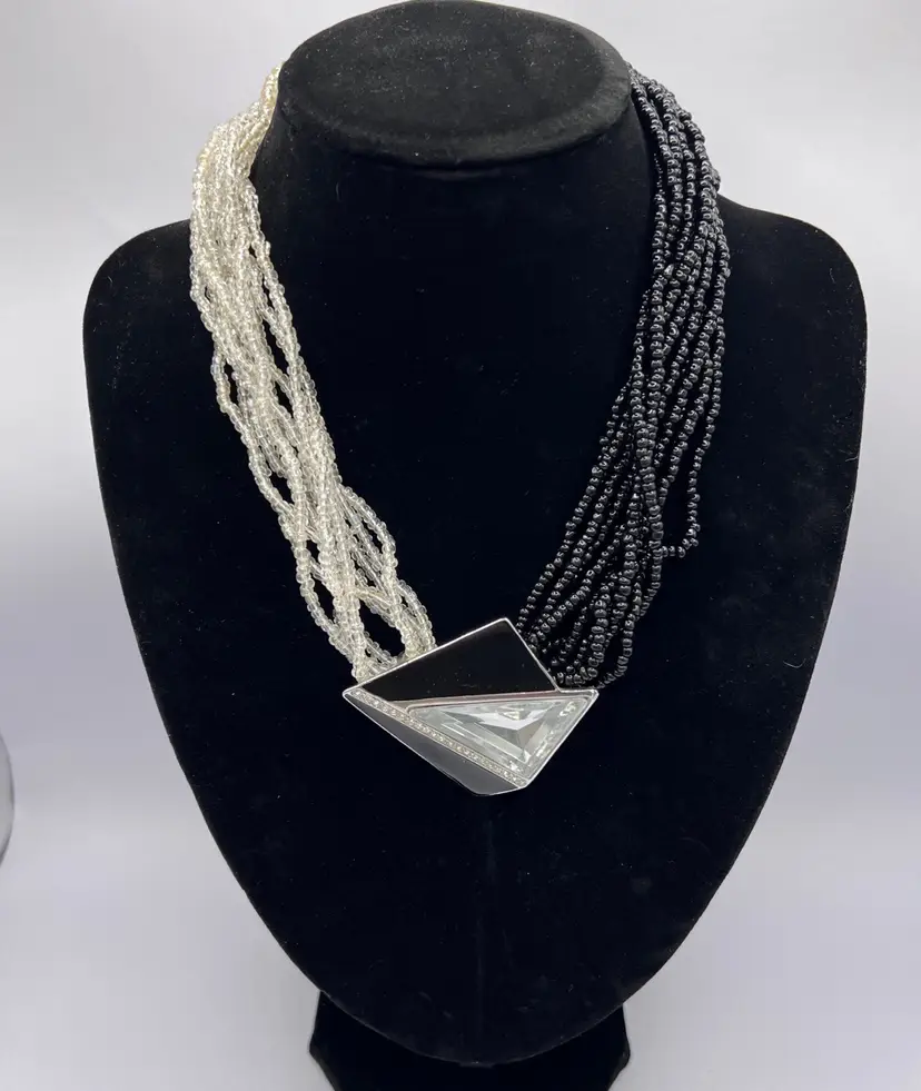 clear seed beads with triangle shape cabochon with clear stone. This necklace is in beautiful condition. Beads and clasp are intact. Please look at photos as they are a part of the description.