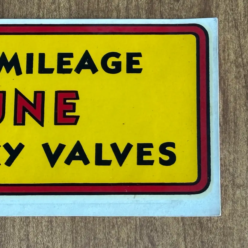 Vintage decal from Kwik-Way decalcomania, a vintage sticker promoting engine tuning for better mileage and prevention of sticky valves.