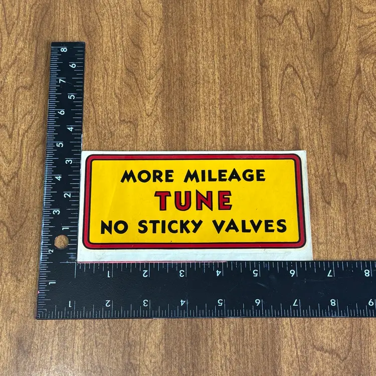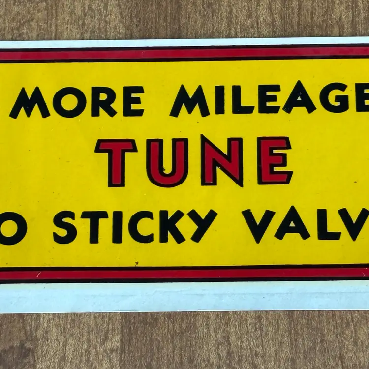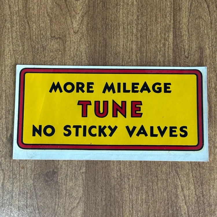 The phrase "MORE MILEAGE TUNE NO STICKY VALVES" suggests a focus on engine maintenance and performance, reflecting the automotive concerns of the time.