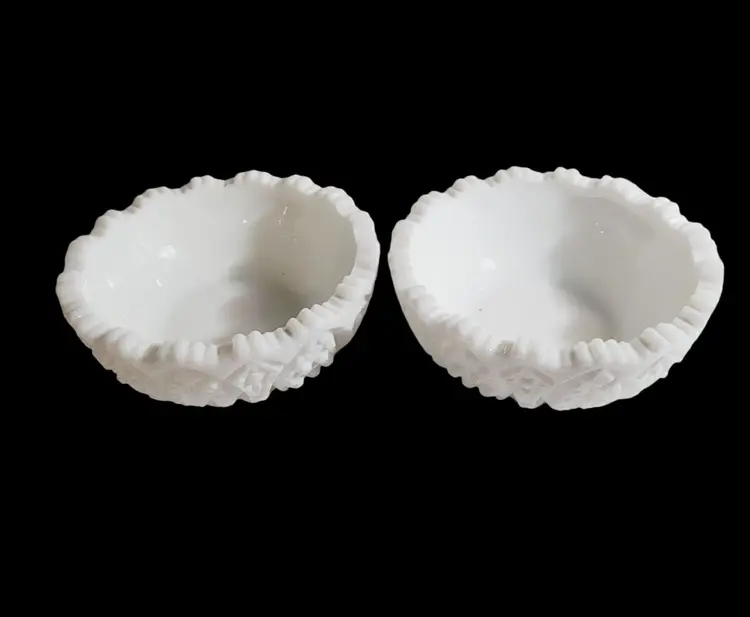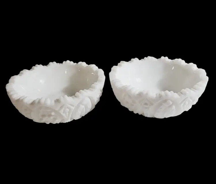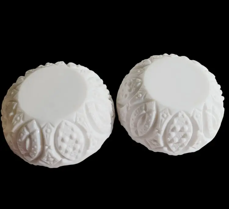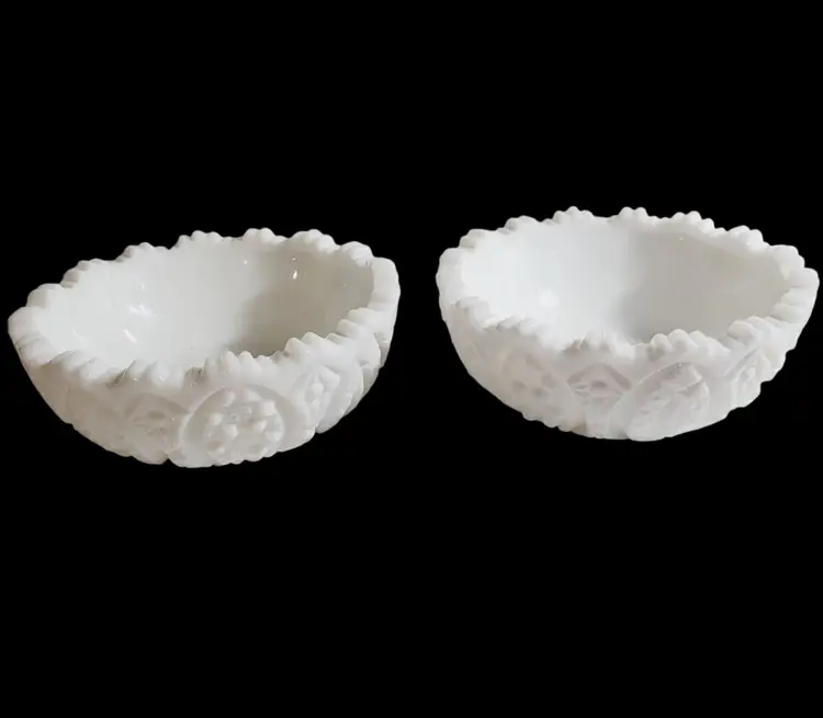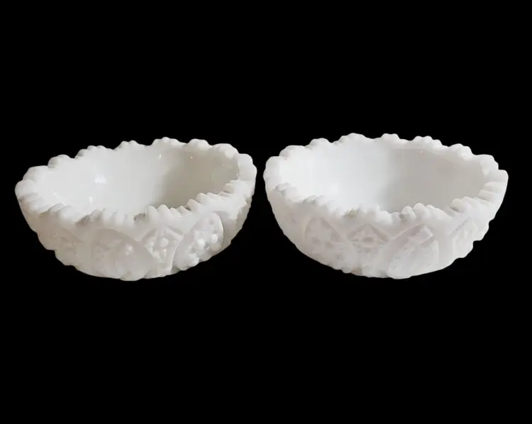This set of vintage L.E. Smith milk glass bowls boasts an elegant arch cane star pattern, reflecting the craftsmanship of a bygone era. Their intricate cut glass design adds a touch of sophistication to any collection of decorative or functional glassware. These bowls are ideal for showcasing treasured trinkets or serving nuts and candies.
