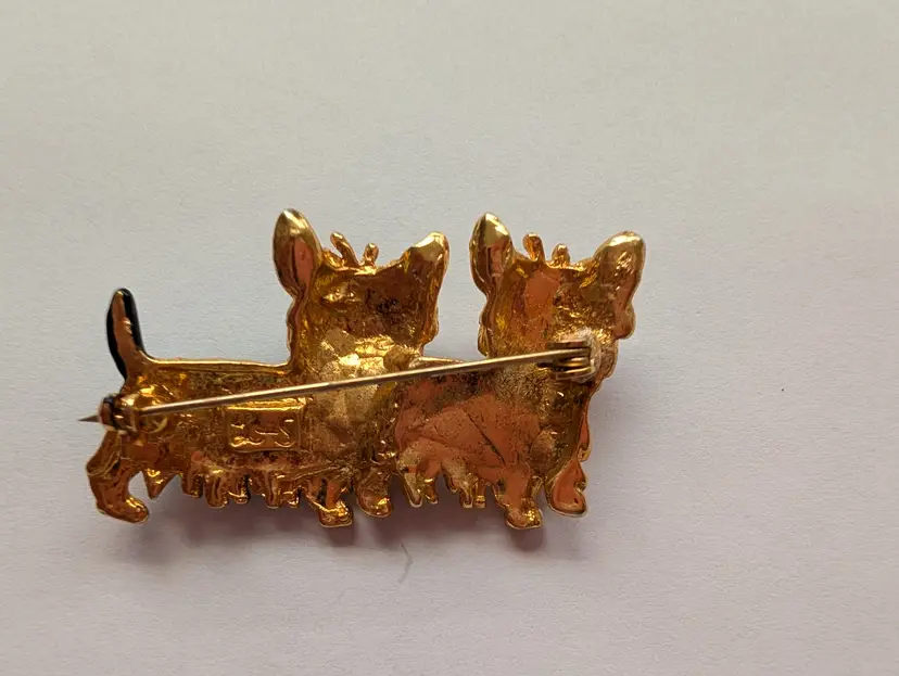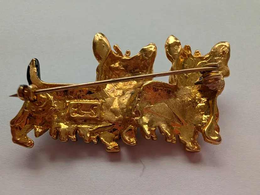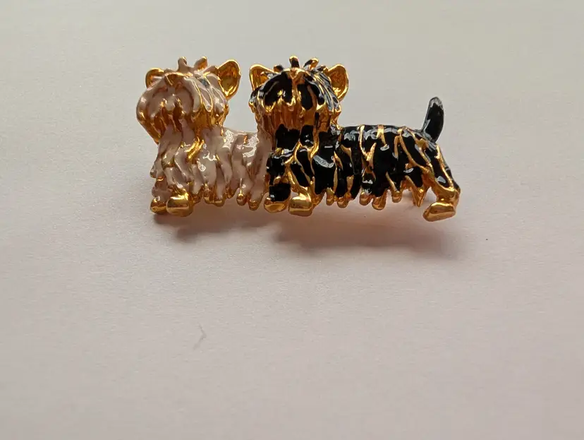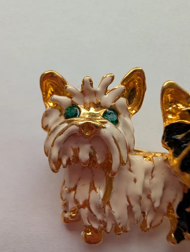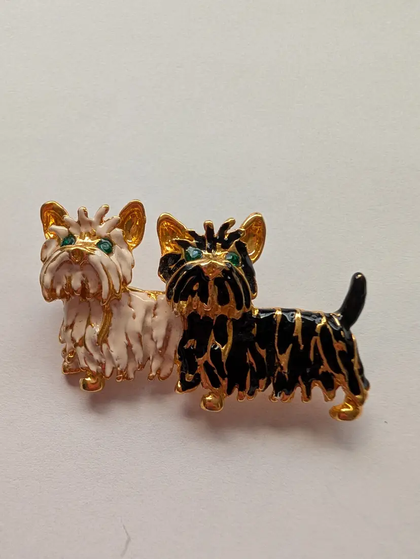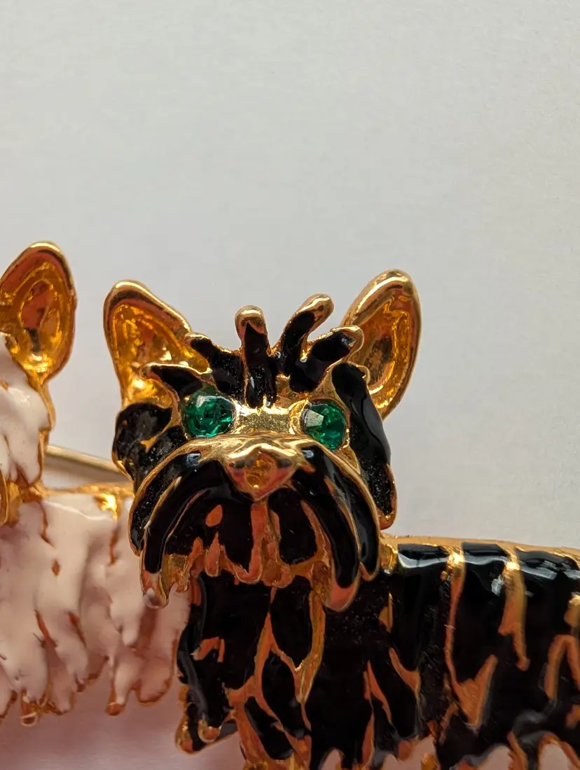 Cute pair of enameled scottie dogs pin. Black and White with green rhinestone eyes