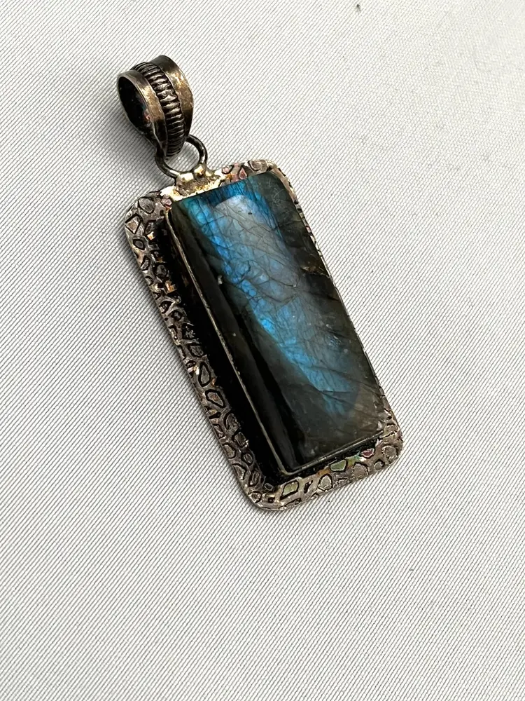 A gorgeous vintage Labradorite silver plated pendant. Approximately 2 inches long and 5/8 inches wide. Uncleaned for your preference. For Protection and Healing. At $28 I will include a sterling silver necklace.