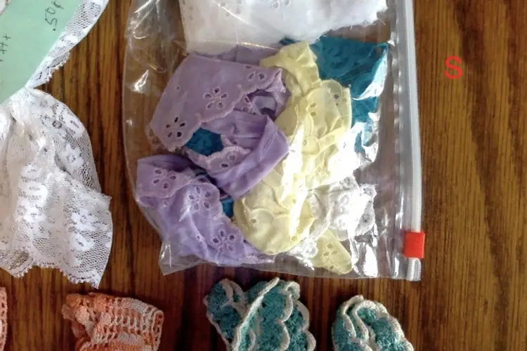 Vintage Lace: set of 6, Medium Width, approx. 7½ yds. $11. R: From 1980's, scalloped trim, polyester, white color, 2in. wide and 4feet long. S: From 1990's eyelet trim, cotton eyelet blend, asst. colors, 1½ in. wide. and 5feet long total. W: From 1930's crochet trim, closed loop-not cut, cotton, peach color, 2in. wide and 1yd. long. X: From 1930's crochet trim, closed loop-not cut, cotton, peach/tangerine/white color, 2in. wide and 34in. long. Y: From 1930's crochet trim, closed loop-not cut, cotton, mint green/cream color, 1in. wide and 40in. long. Z: From 1930's crochet trim, closed loop-not cut, cotton, mint green/cream color, 1in. wide and 40in. long. Please see my other listings. Multiple purchase discounts. Monitor 8PM nightly. (not 24/7)