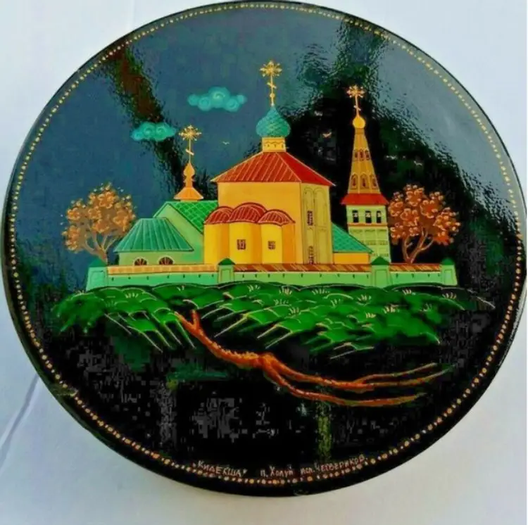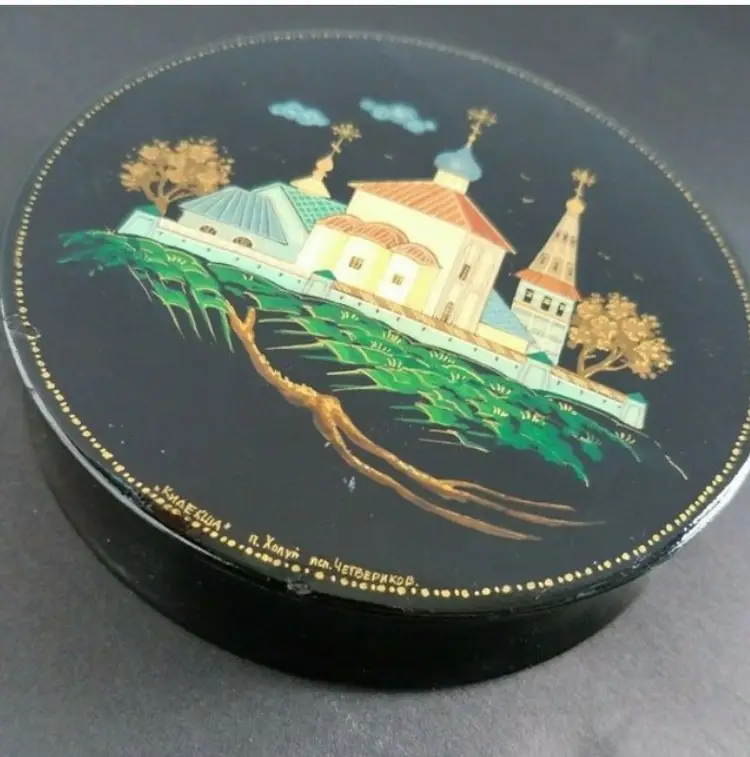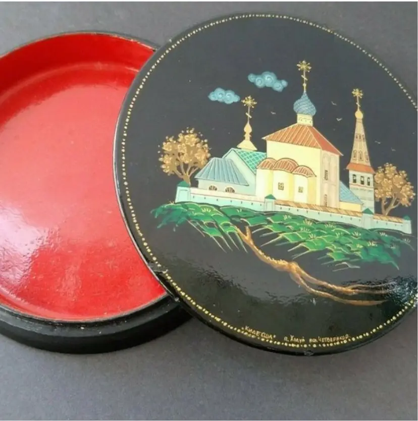 Vintage Lacquered Round Wood Trinket Box Hand Painted USSR Kideksha