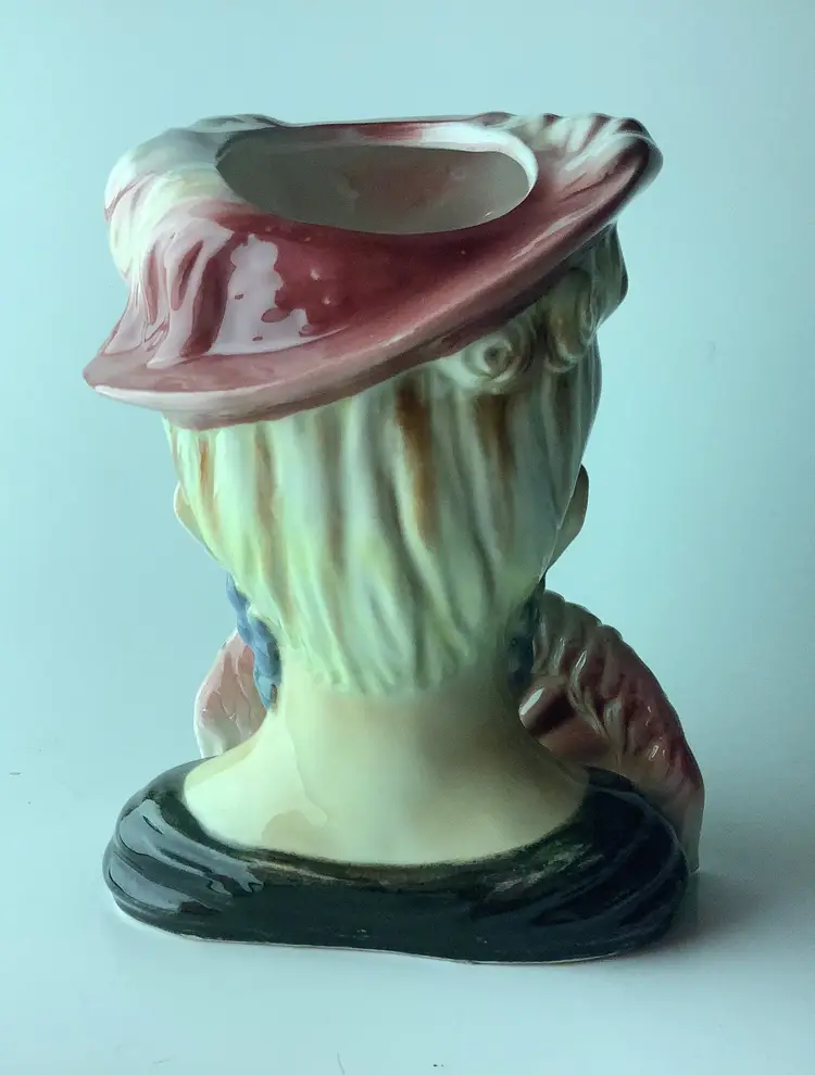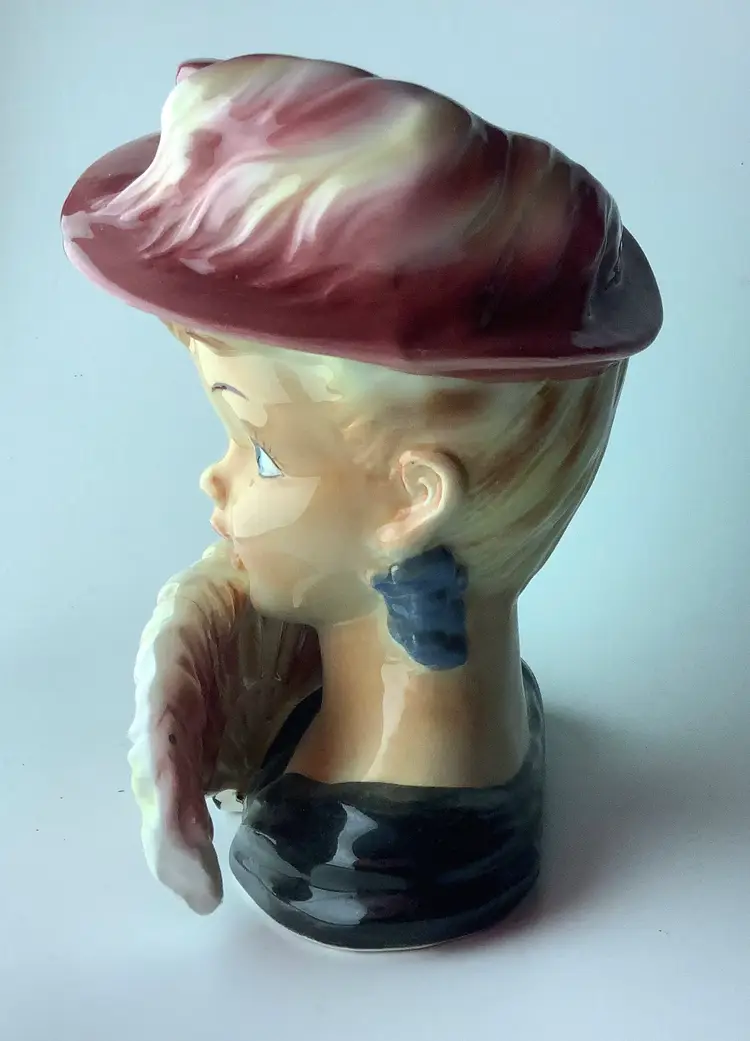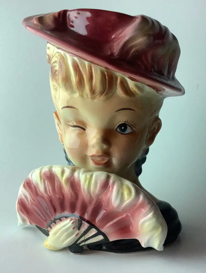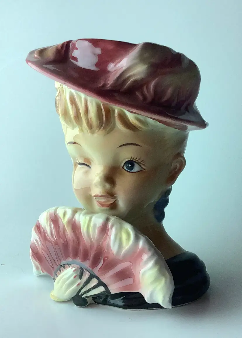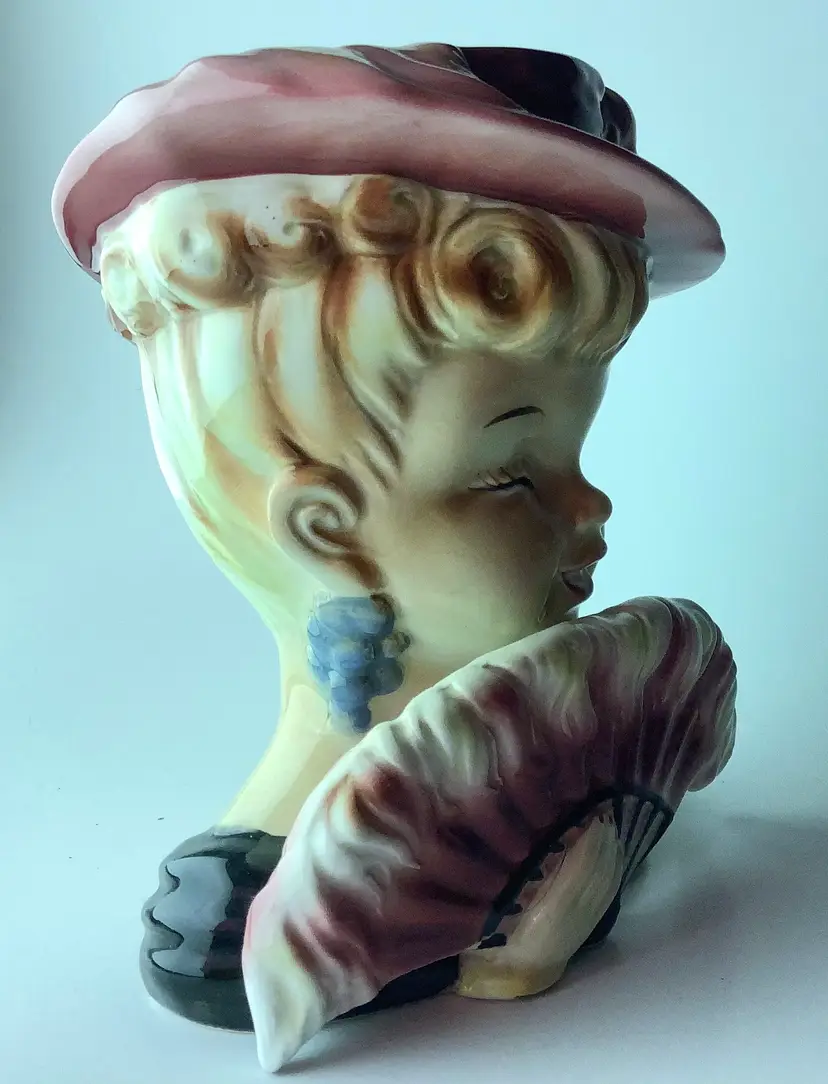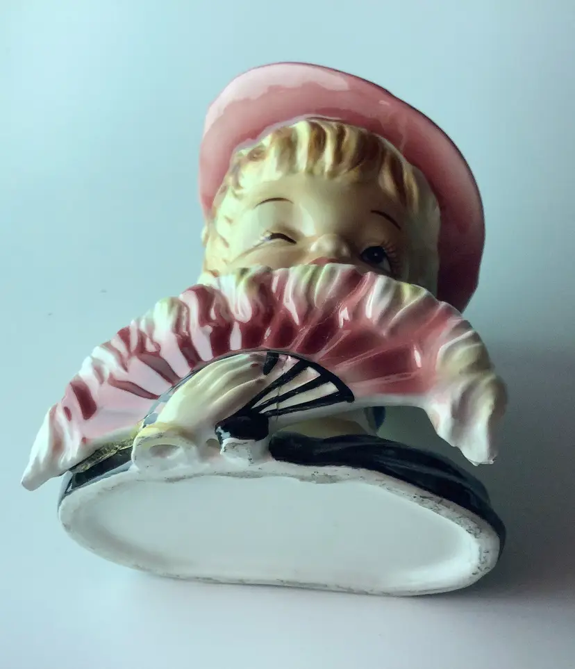 This lady is so beautiful with her precious expression. She measures 5.5” tall. Please see photos…there is a crack in the fan. Really hard to see, especially on a shelf from any distance. I ship 3 day UPS and Pack carefully with bubble wrap and double boxing. Thanks!