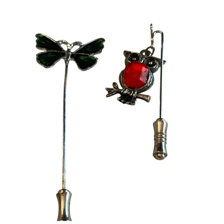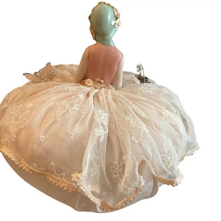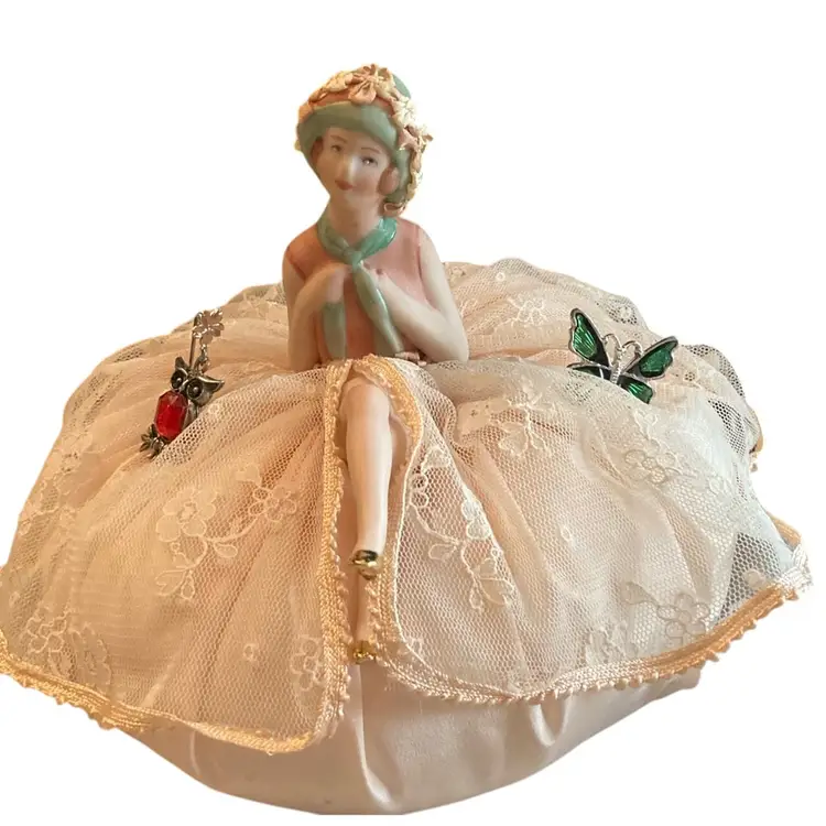 5” x 5 1/2 bisque? lady sitting on a puffy cushion. Included a butterfly and an owl stick pin.
