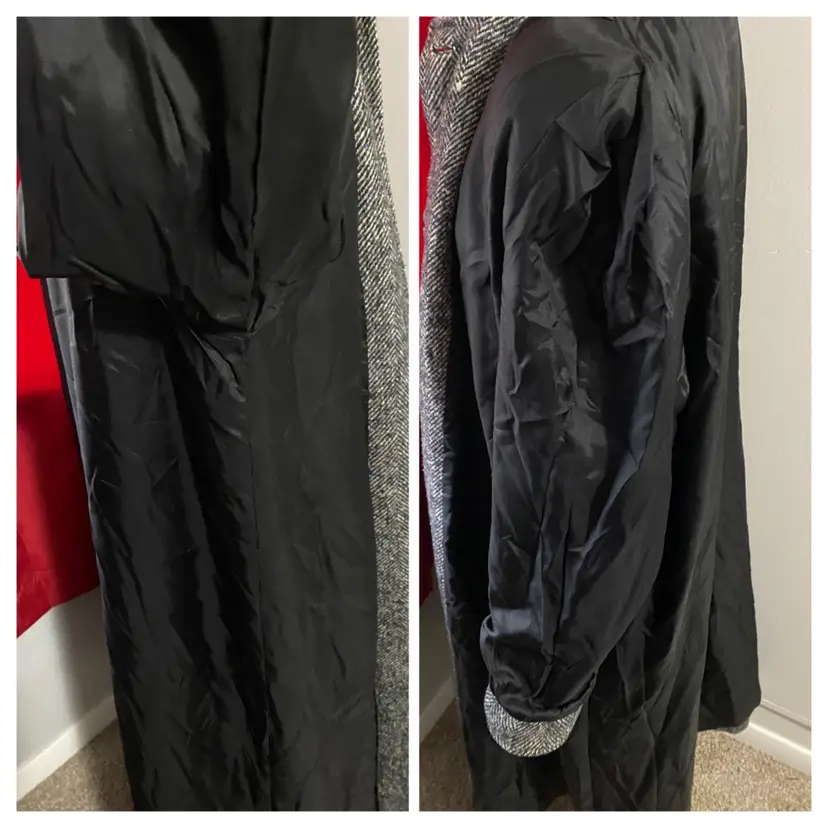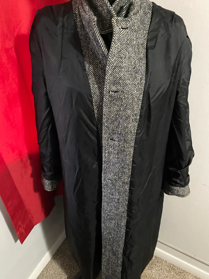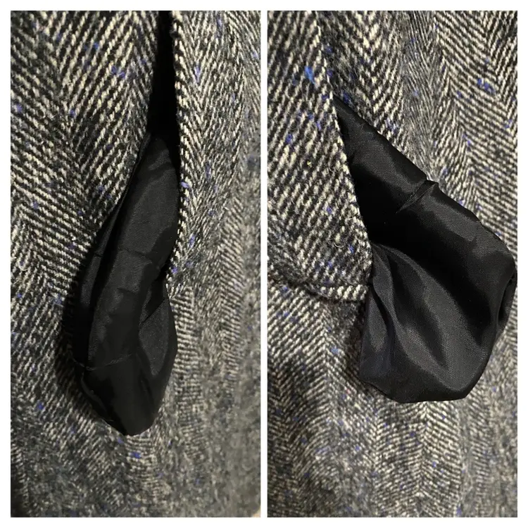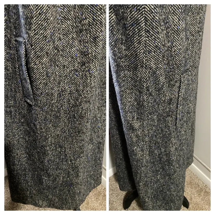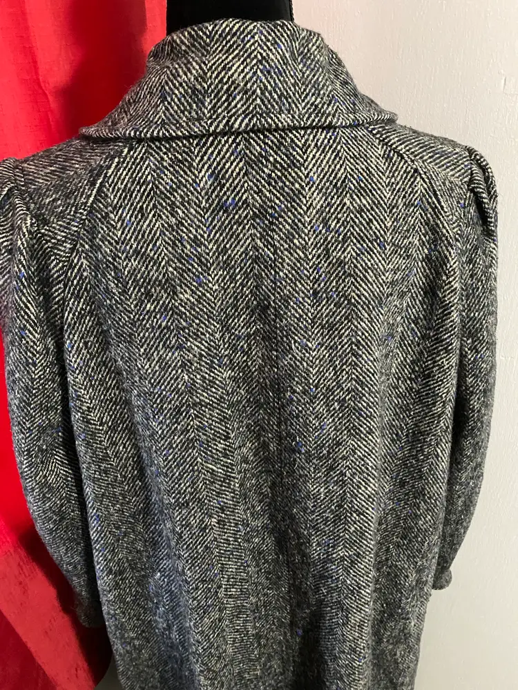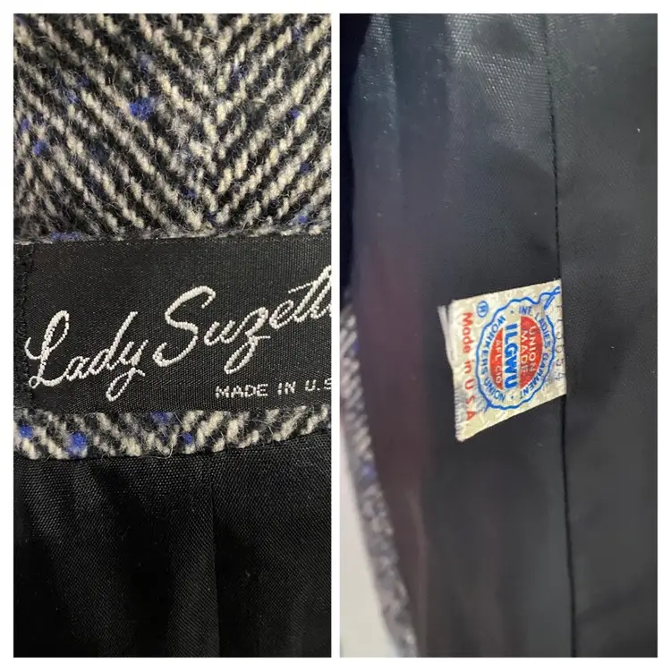 Brand/Maker- Lady Suzette Size- No Label Please see measurements below - would be approx a modern XL Color- Black, Blue and Gray Condition description- No rips, stains or tears. No missing buttons. Has common pilling throughout outside. Liner in very good condition. Fabric- No label but consistent with Wool Made in- USA