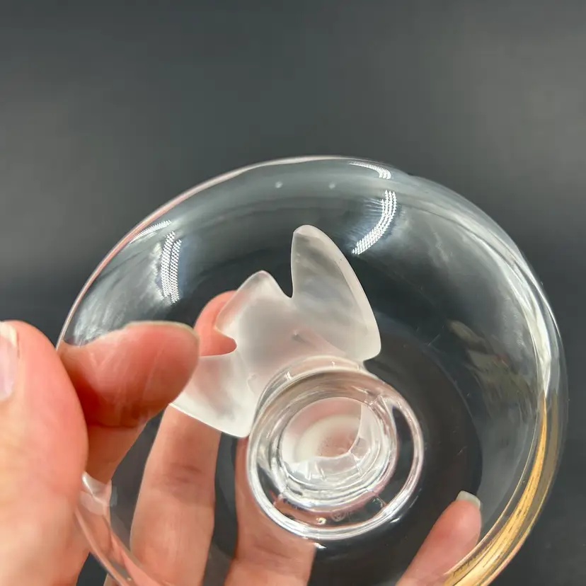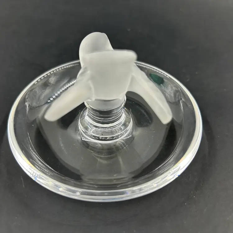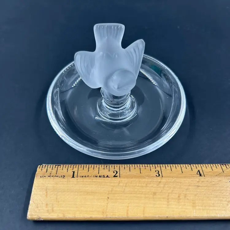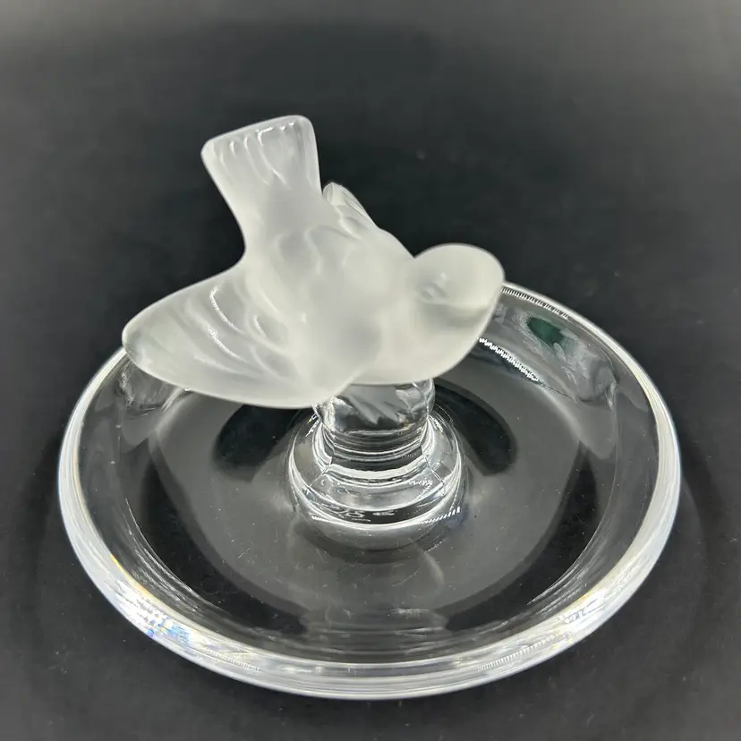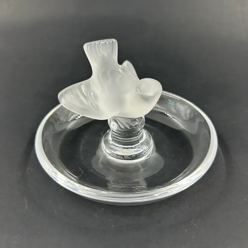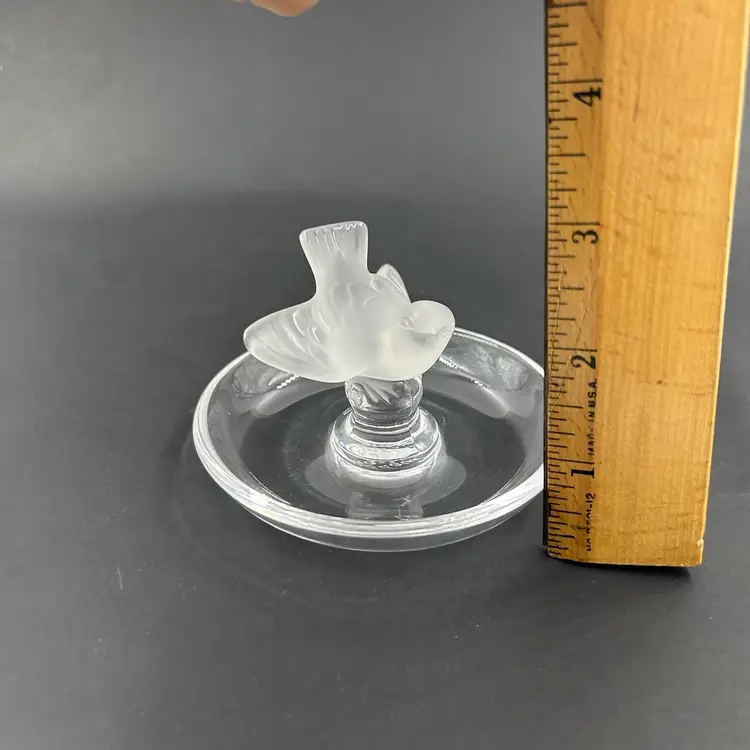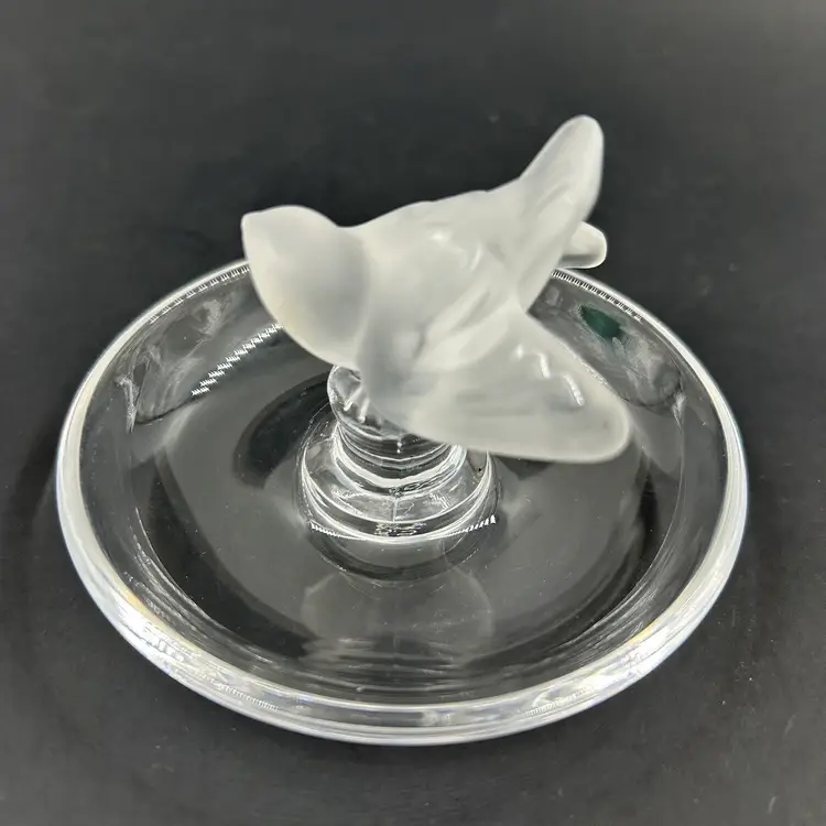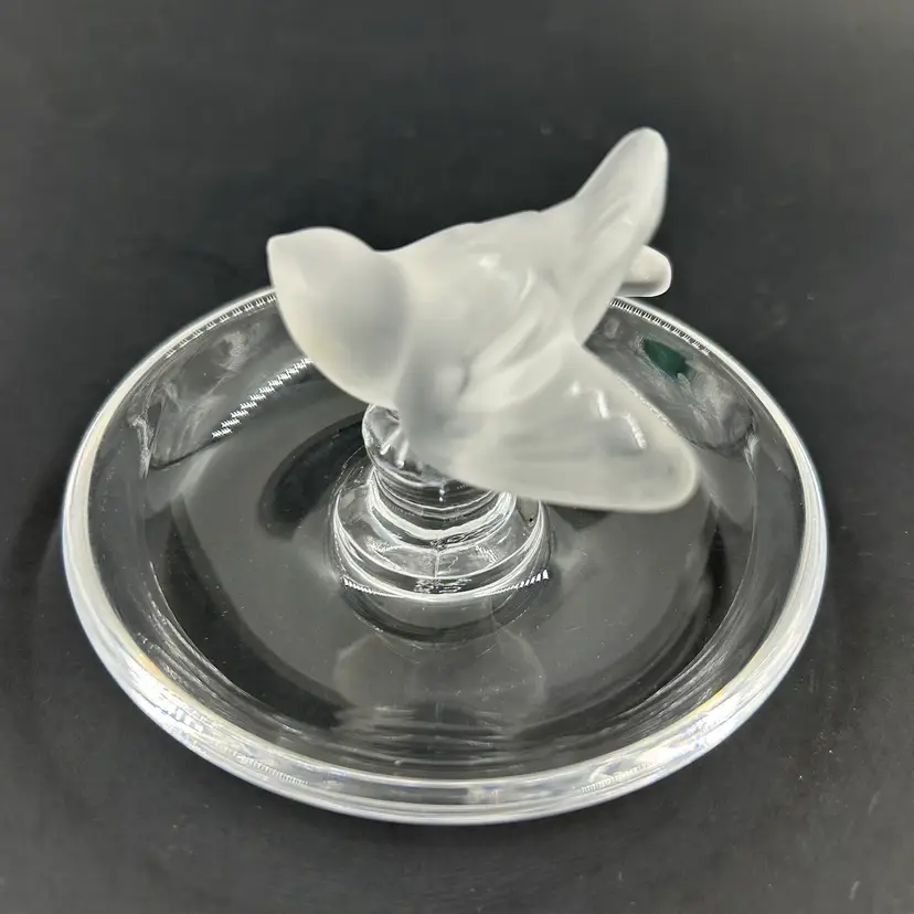 Vintage Lalique Crystal Ring Dish With A Frosted Bird Figure. Signed Lalique France On The Bottom. 4” W 2.75” T. Item has 2 little white dots on the dish. No chips or cracks. Light surface scratches on the bottom.