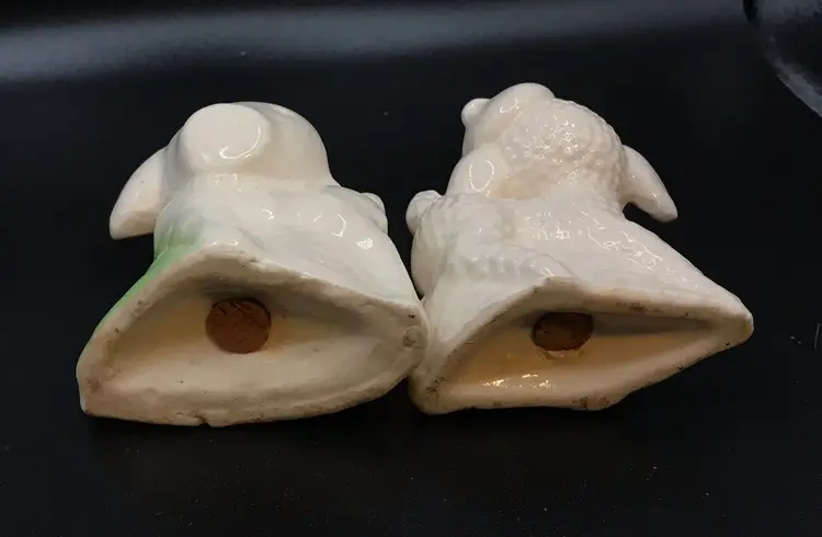 vintage lamb salt and pepper shakers. No chips or cracks. Have cork stoppers. Measures 2-3/4" x 2-1/2".