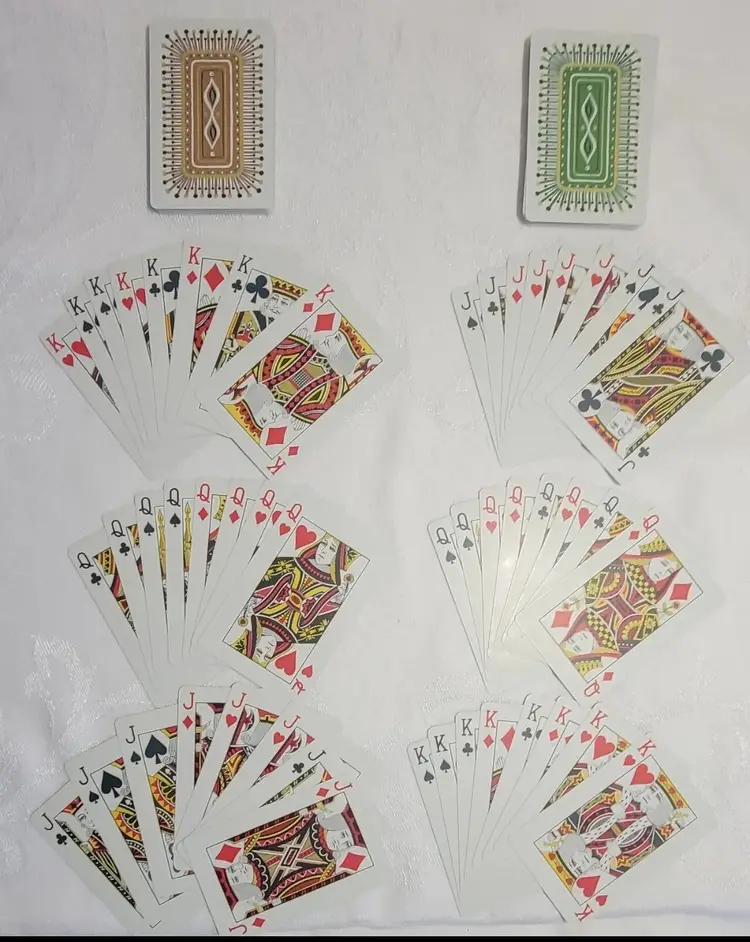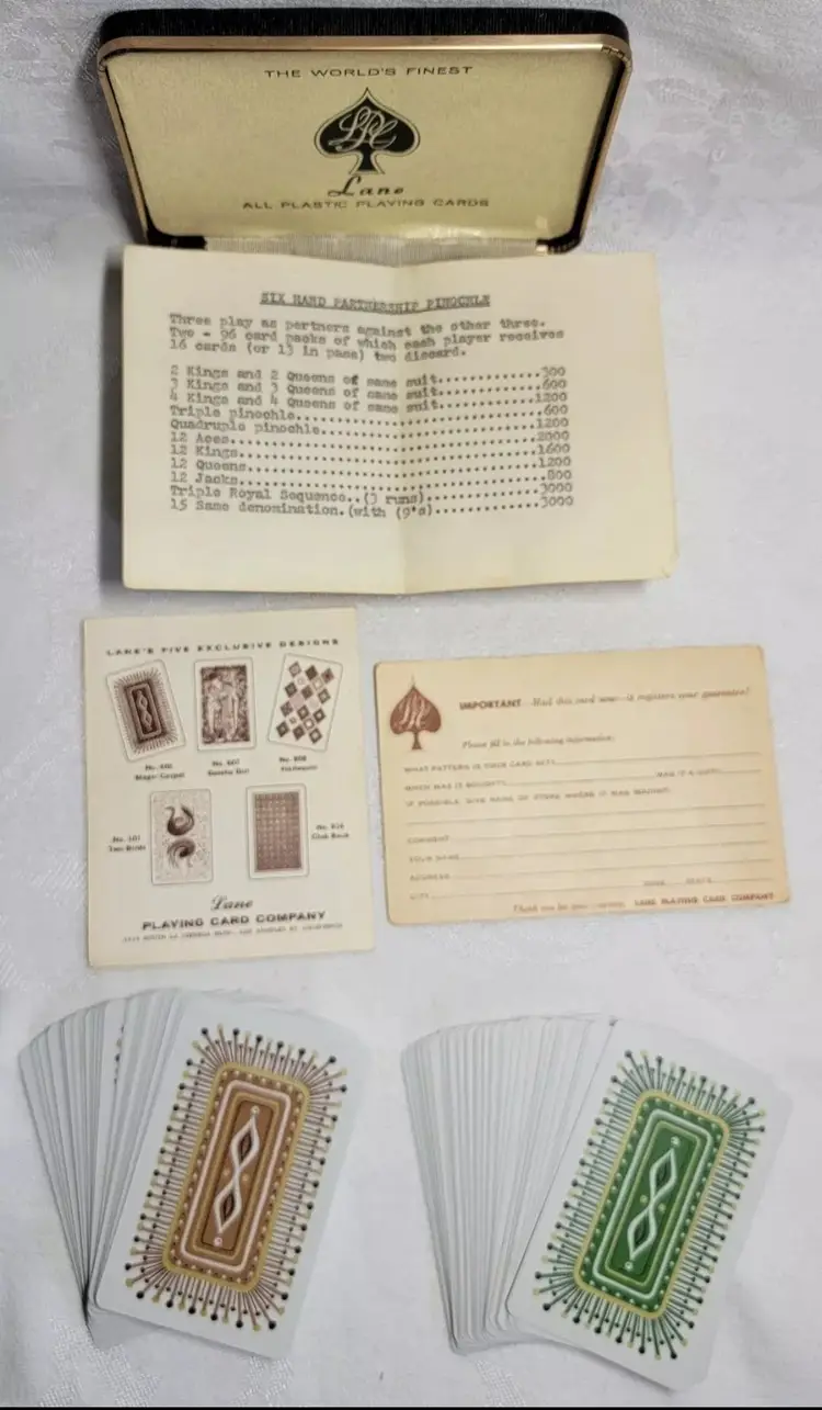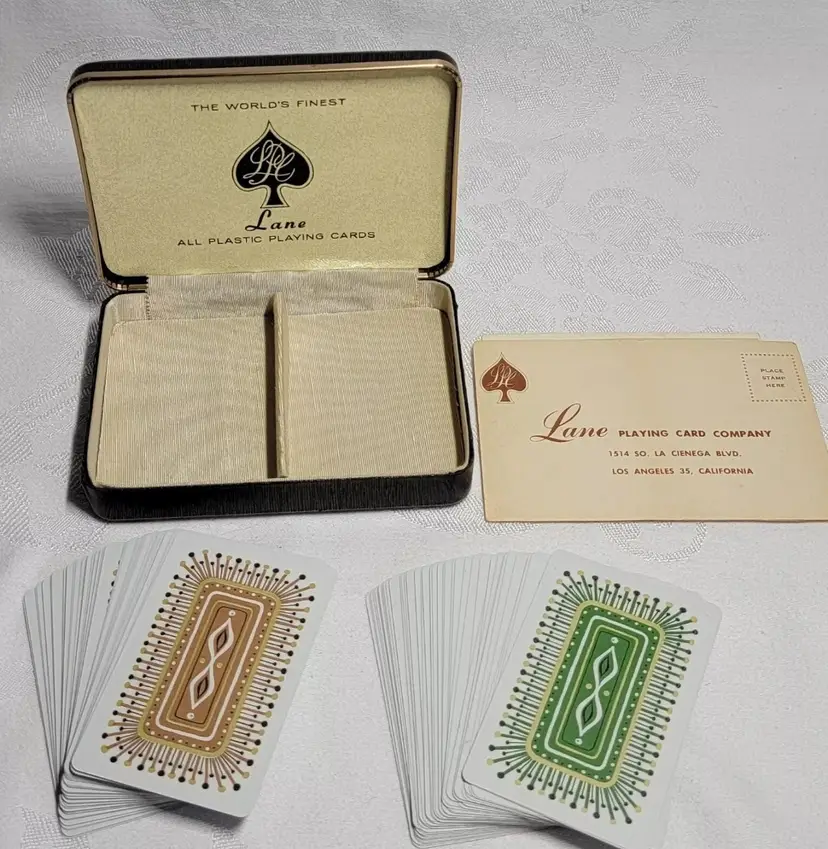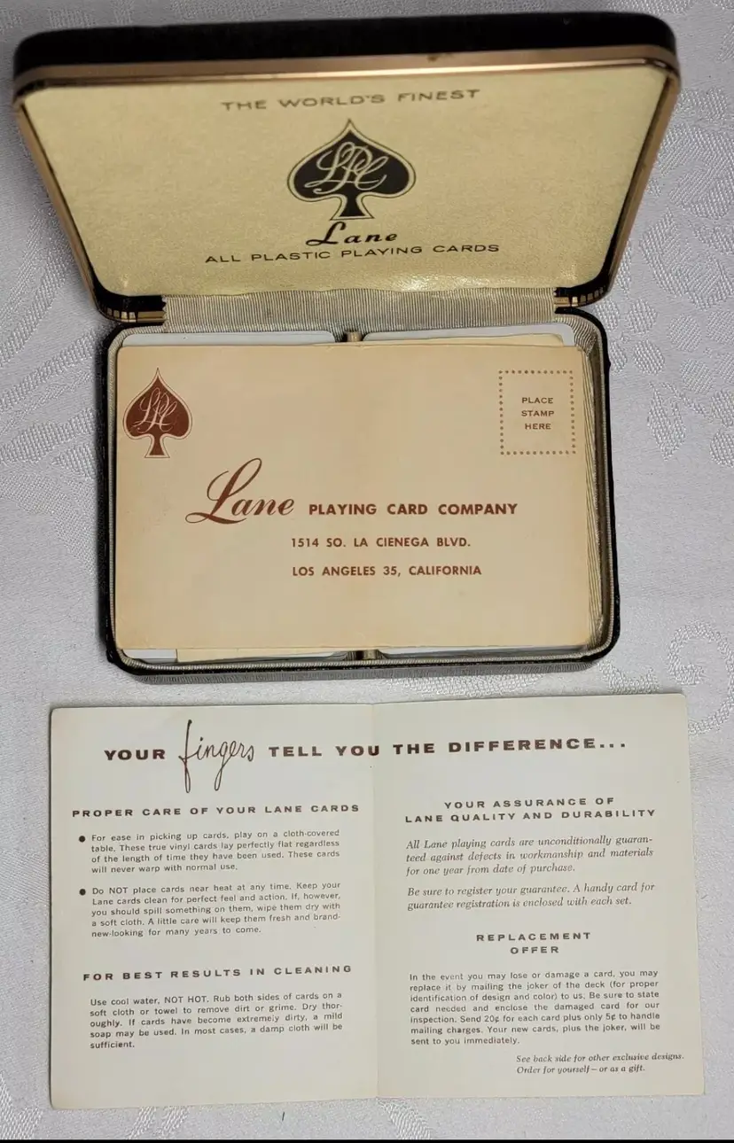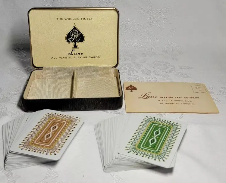 The two decks come in a convenient storage box that keeps them safe and organized. These playing cards were made before 1970, adding to their vintage charm. They are in good condition, ready to be used and enjoyed. Put a bit of history in your hands with these Lane Magic Carpet design playing cards. Playing cards are for playing Pinnacle.