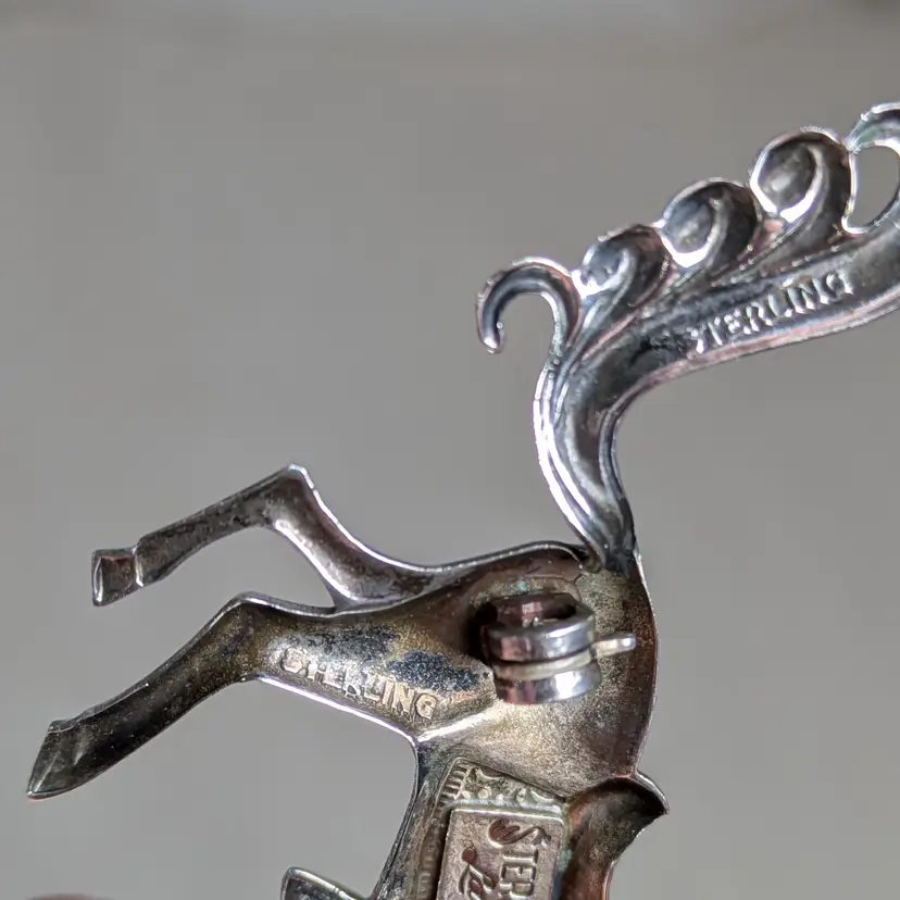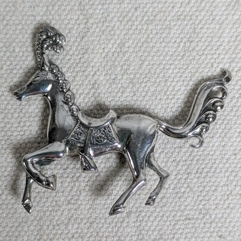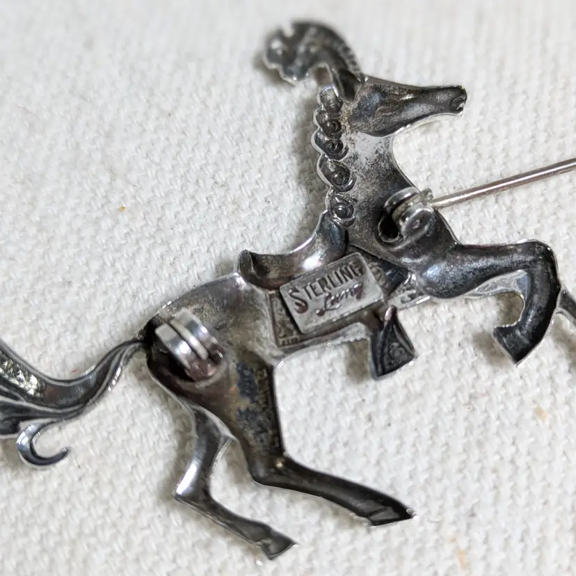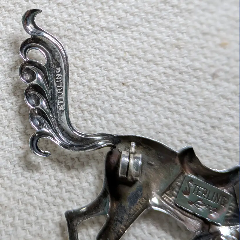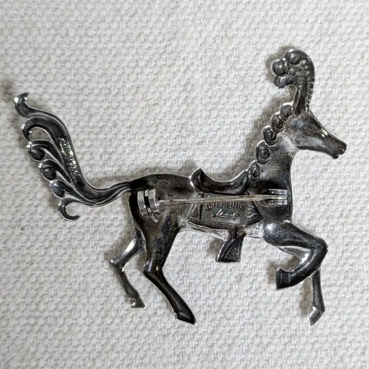 Vintage 1950s sterling silver carnival or circus horse brooch by Long Jewelers. Front of brooch has been polished, but she could definitely use a touch up with some silver cream. The back has not been polished. Rollover clasp. Stamped sterling 3 times on the back and Lang for Lang Jewelers. Lang was active in the Providence RI area from 1946-1970s. Sterling silver tested.