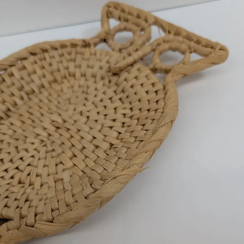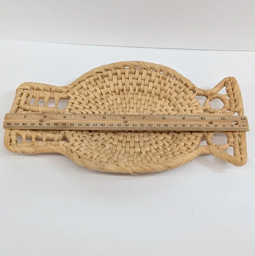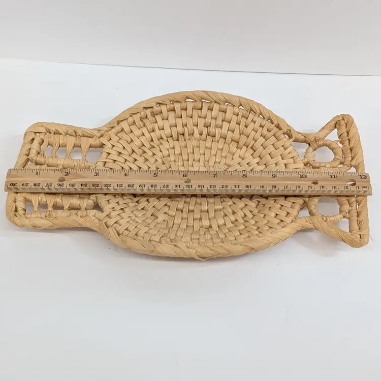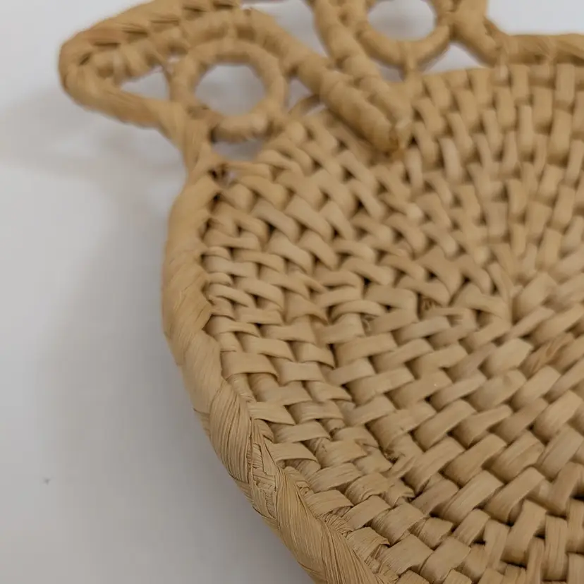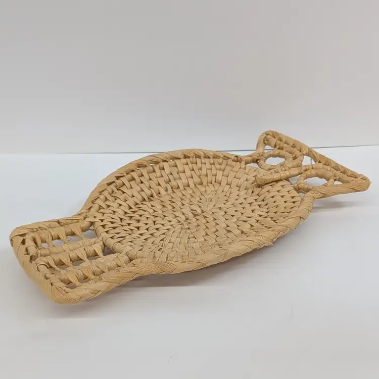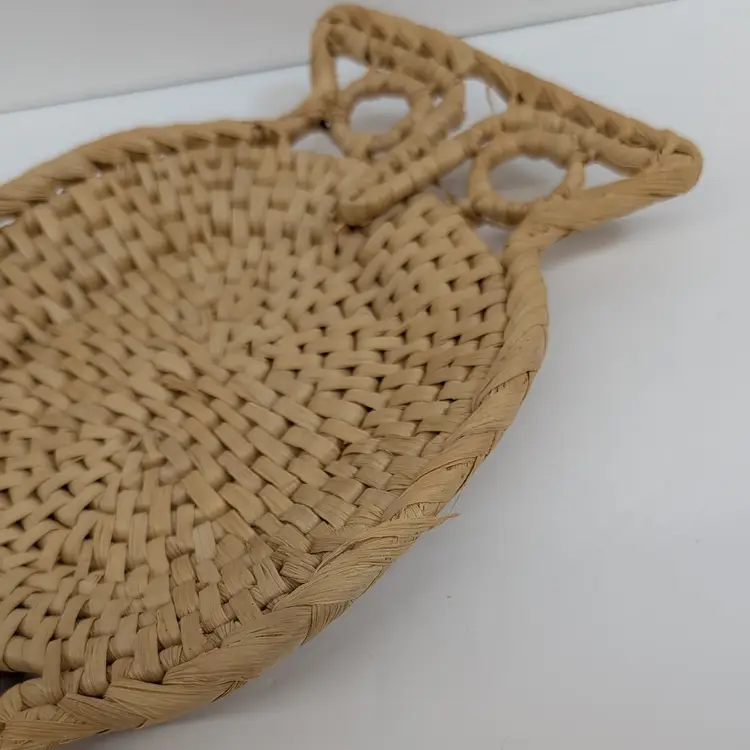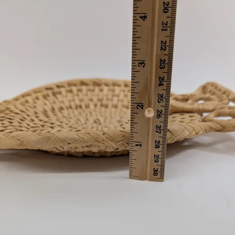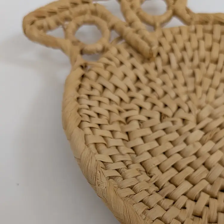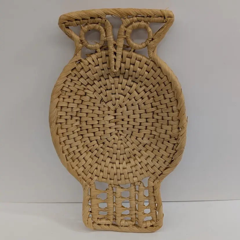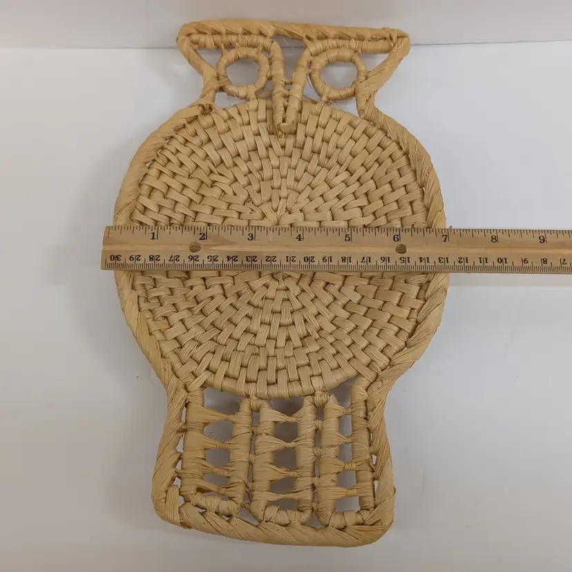 Cute, shallow owl basket that can be hung on the wall or used to hold items. In used, vintage condition with a couple areas of the rattan that are splitting (see pictures). Measurements ~ 7 x 12 x 1.25"
