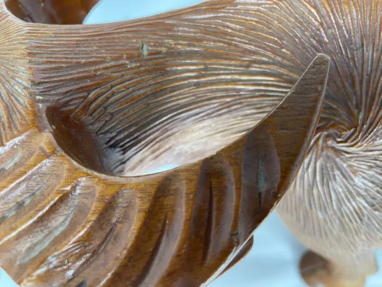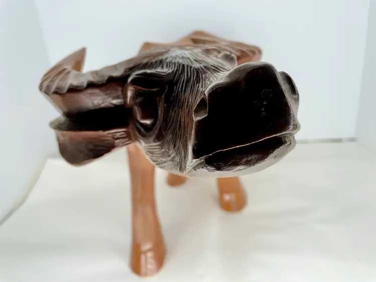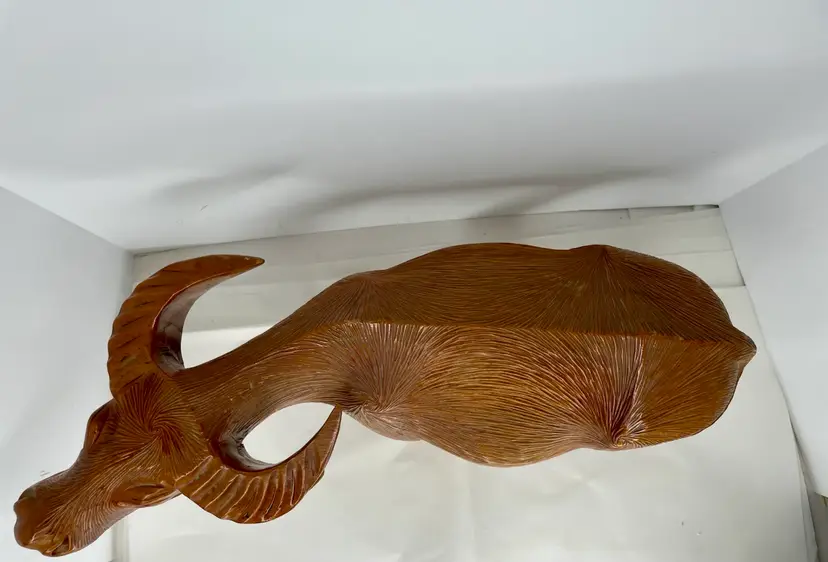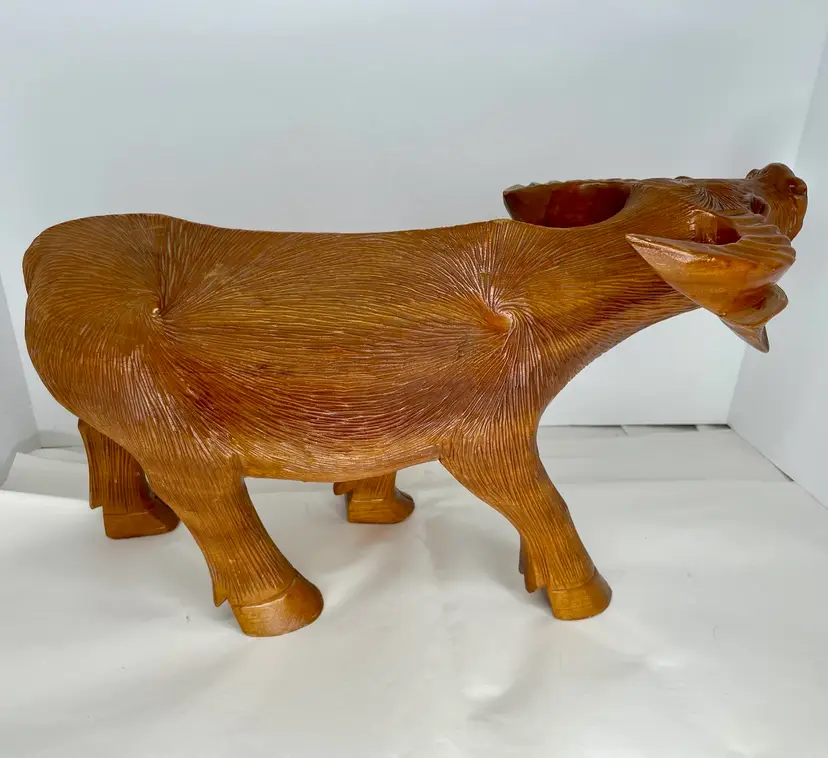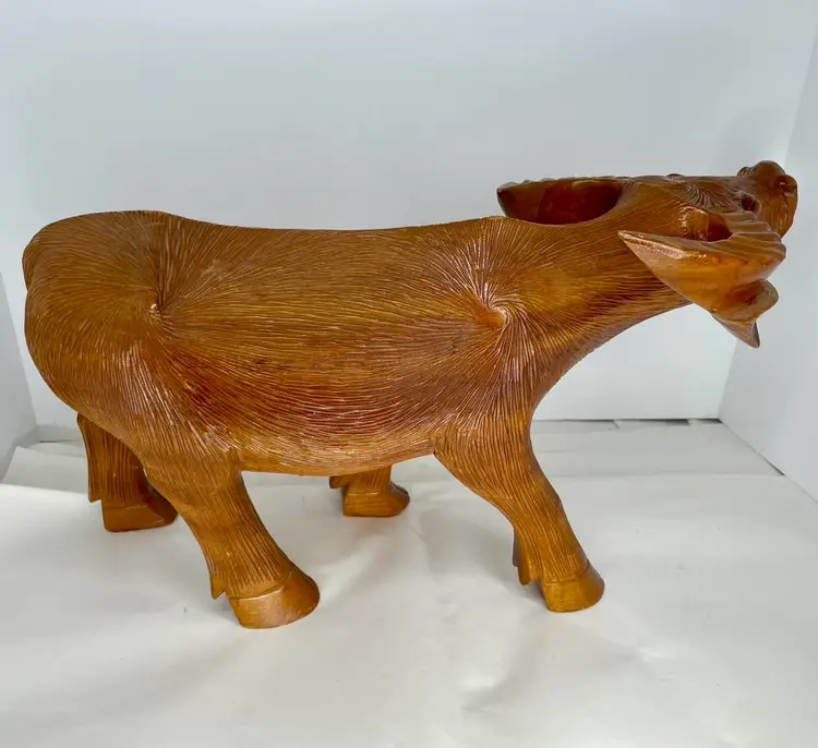 This Vintage Large 17 X 9 X 6 Carved Wooden Water Buffalo Ox Bull Wood Statue stamped by DVS is a beautifully crafted piece that can add an artistic touch to any room. Handmade with attention to detail, this statue features a realistic and anatomically correct depiction of a water buffalo. The polished finish and eclectic style make it perfect for all occasions, and its large size makes it a striking statement piece for adult collectors who appreciate unique wildlife sculptures. This original piece is a unique addition to any art, wild animal, or animal-themed decor.