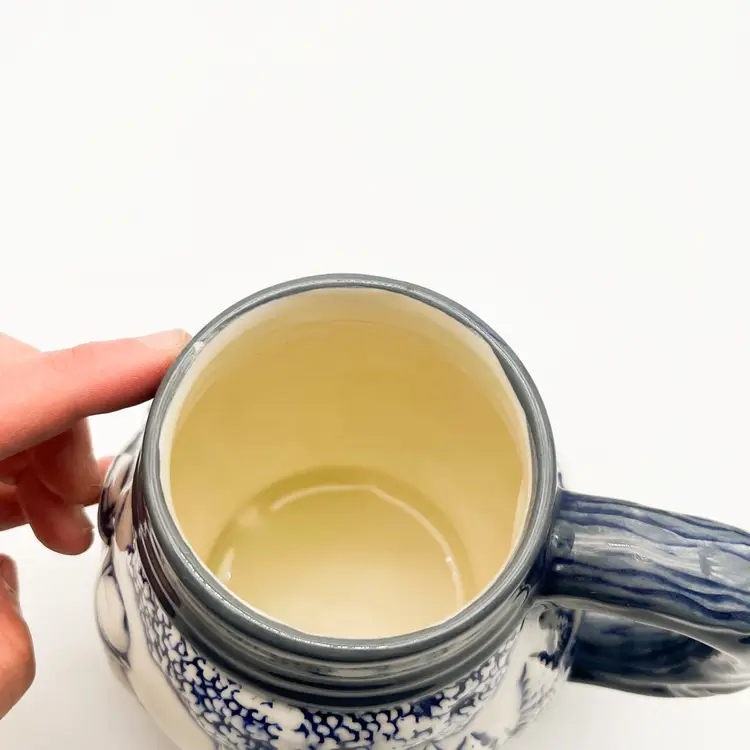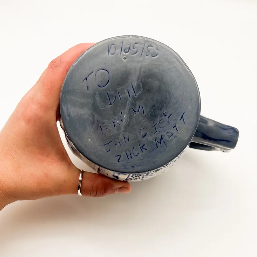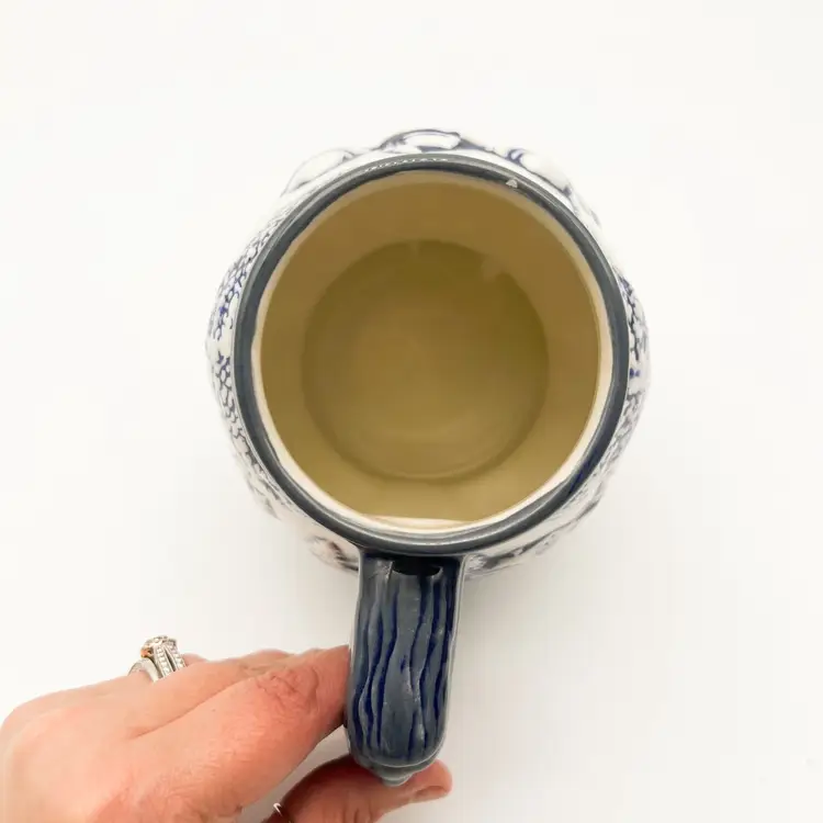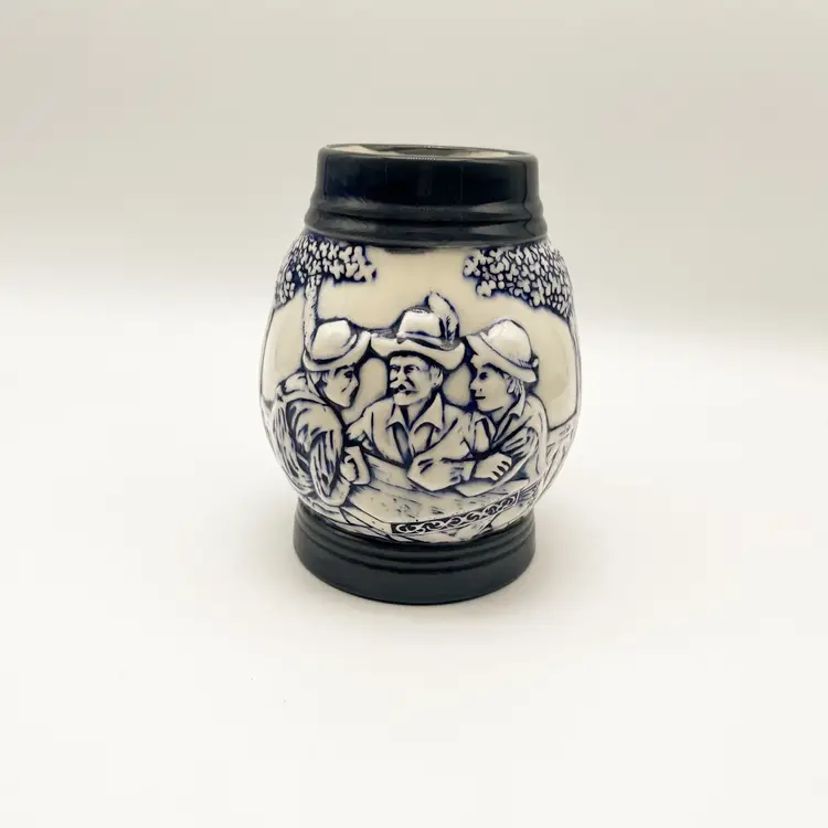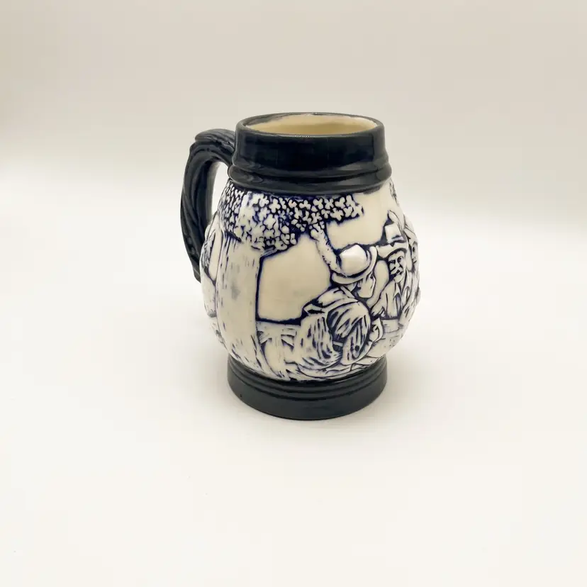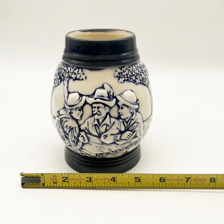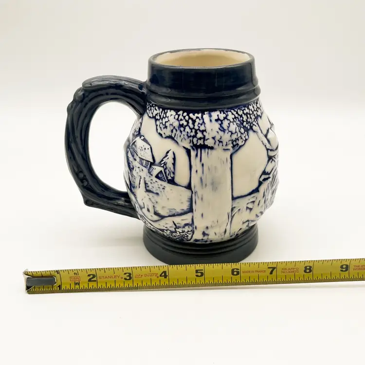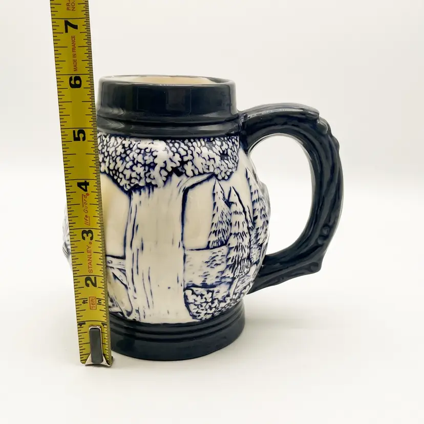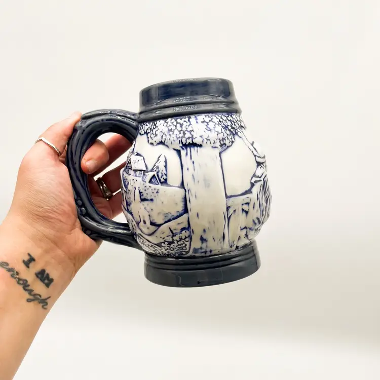 Vintage Large Ceramic Beer Stein Mug Blue White 1980s Handled Big Size Drinkware Condition: Tiny flea bite to glaze on rim