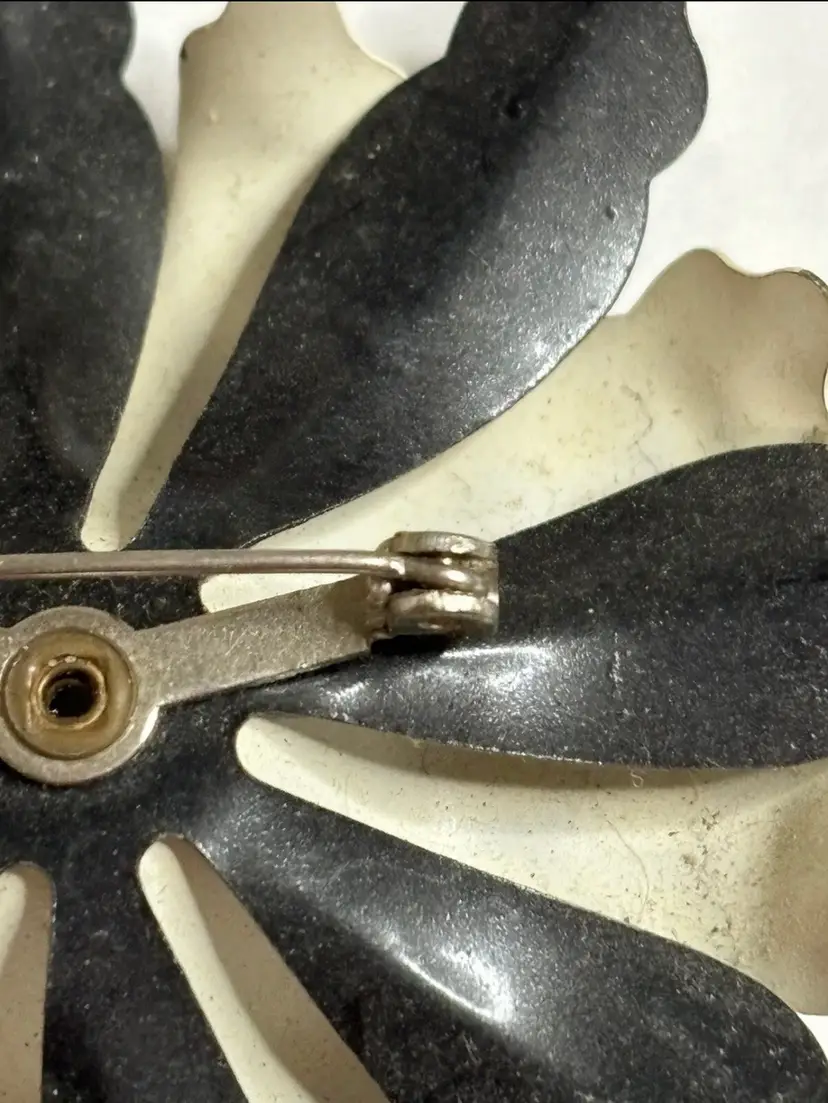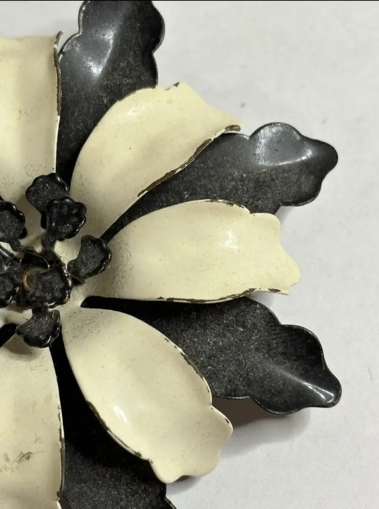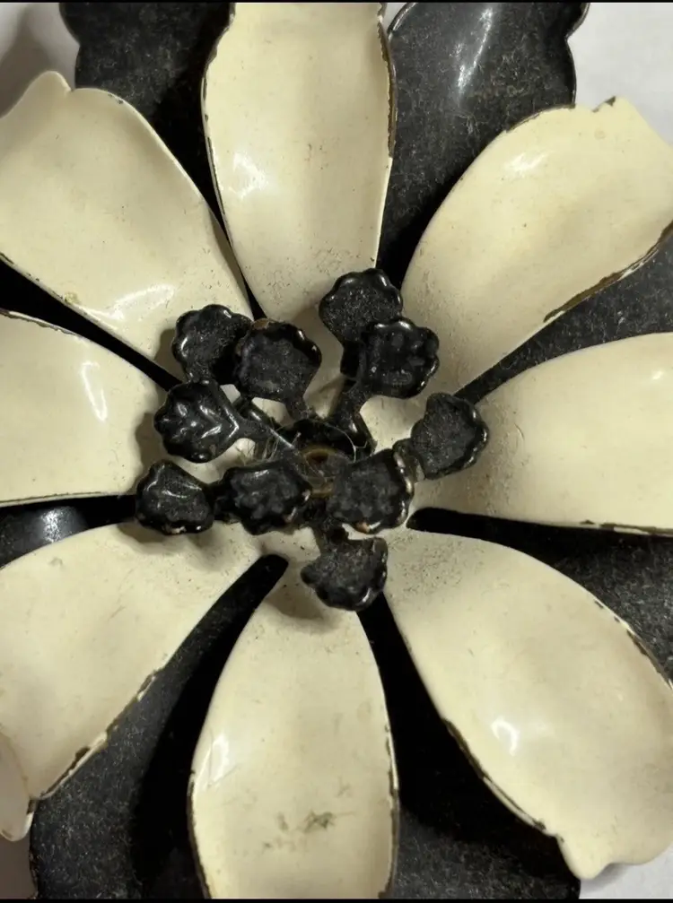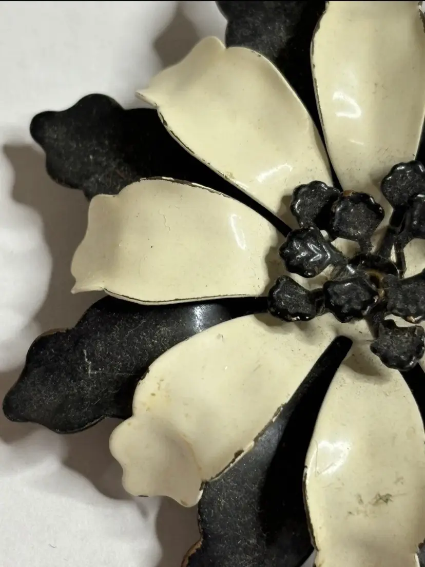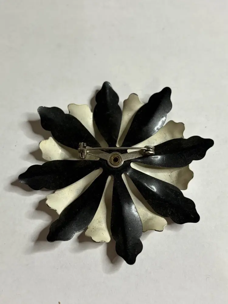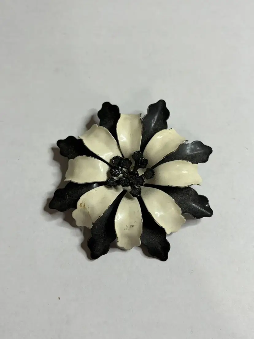 This vintage brooch pin features a beautiful black and white flower design, perfect for adding a touch of elegance to any outfit. The piece is made from high-quality enamel material, ensuring durability and long-lasting use.