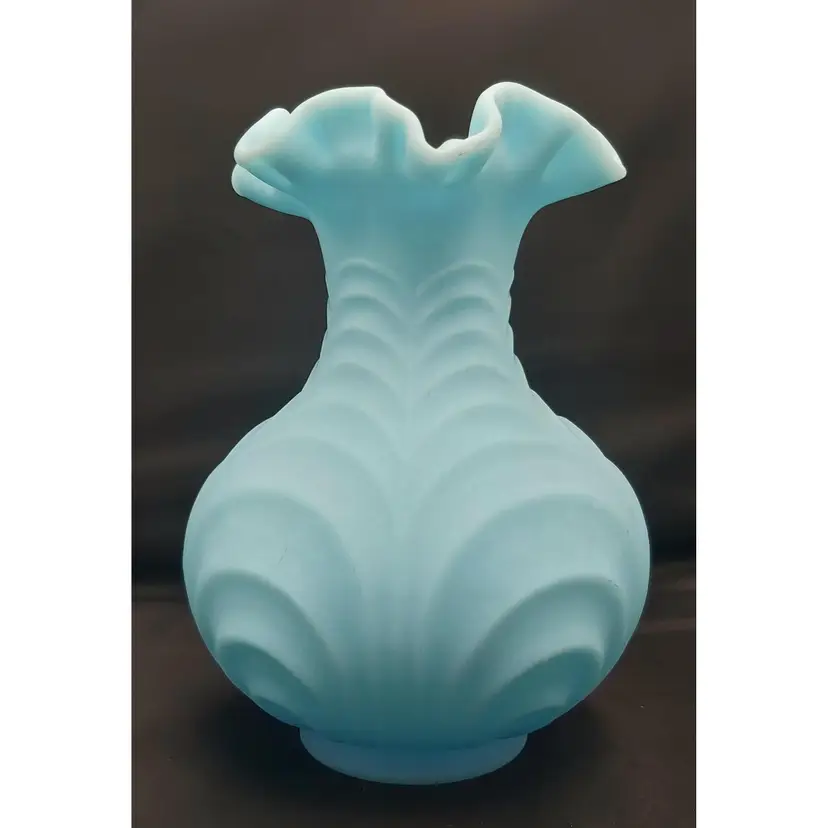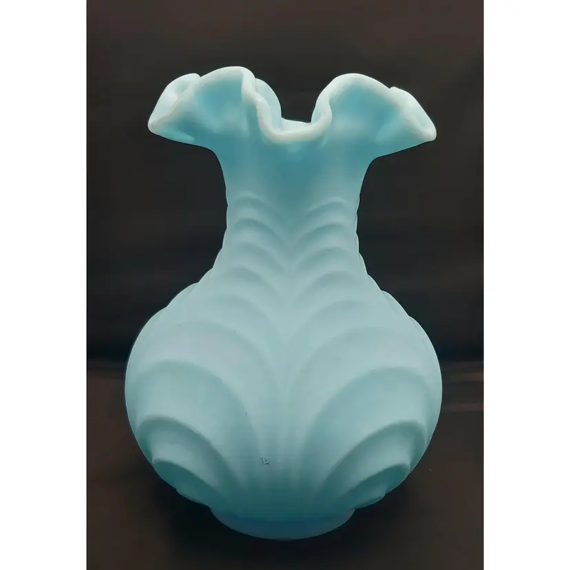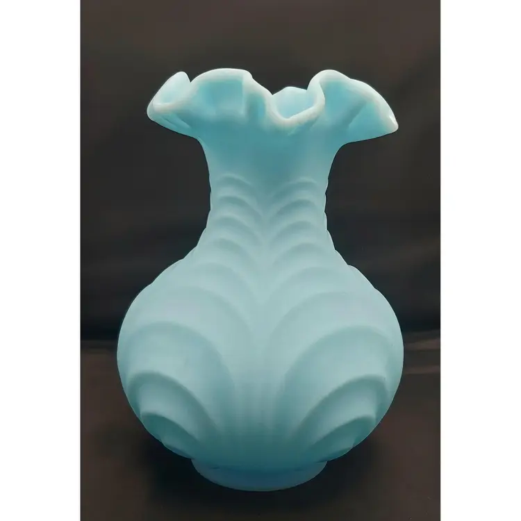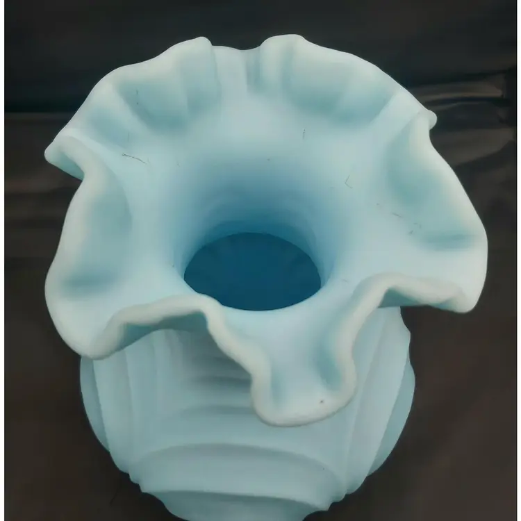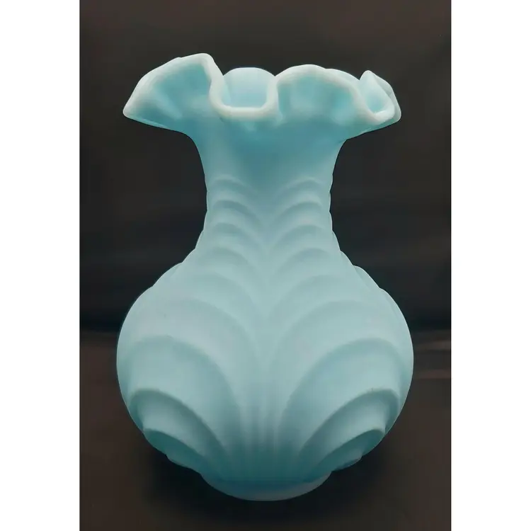 Large Fenton Blue Custard Satin Glass Vase in the Drapery Pattern with a fluted rim. No chips or cracks. See pictures for details. Measures 8" high x 6" wide bowl x 2 1/2" wide neck x 3" wide base.