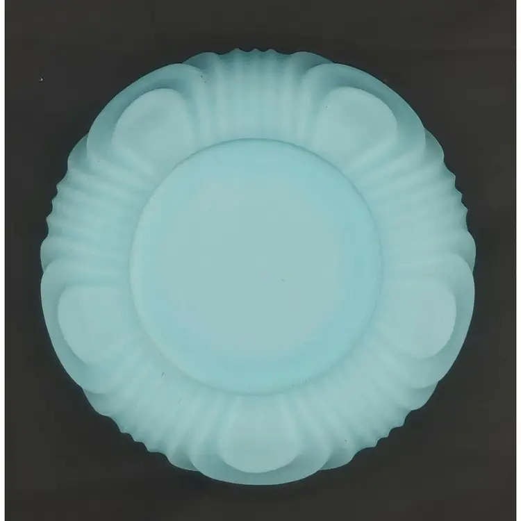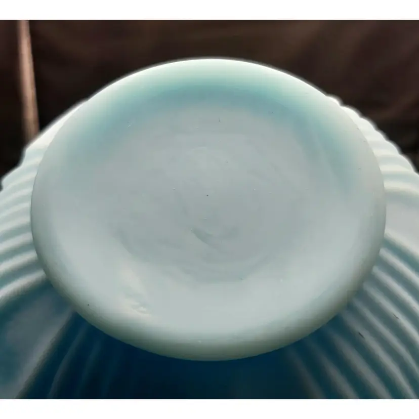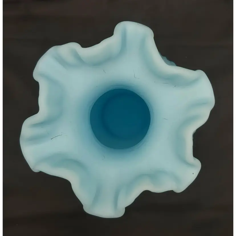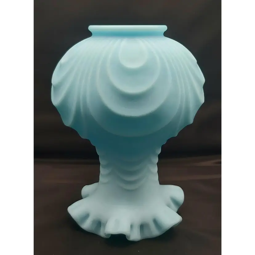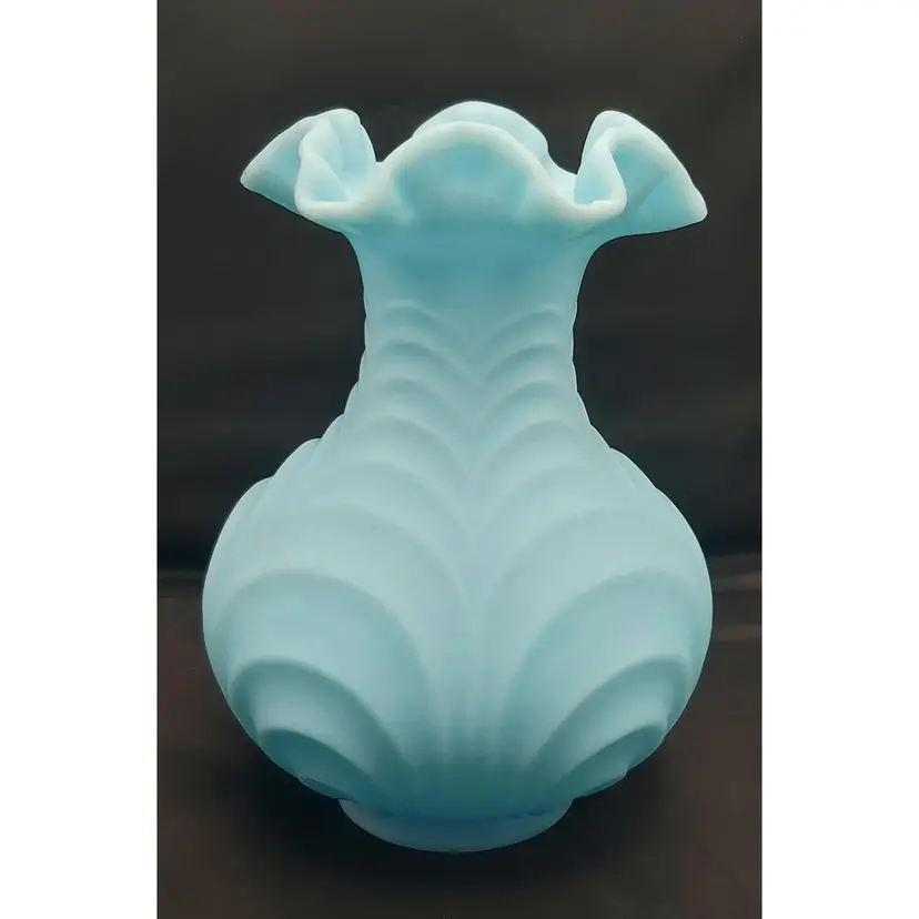 Large Fenton Blue Custard Satin Glass Vase in the Drapery Pattern with a fluted rim. No chips or cracks. See pictures for details. Measures 8" high x 6" wide bowl x 2 1/2" wide neck x 3" wide base.