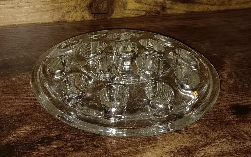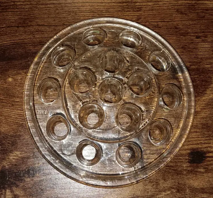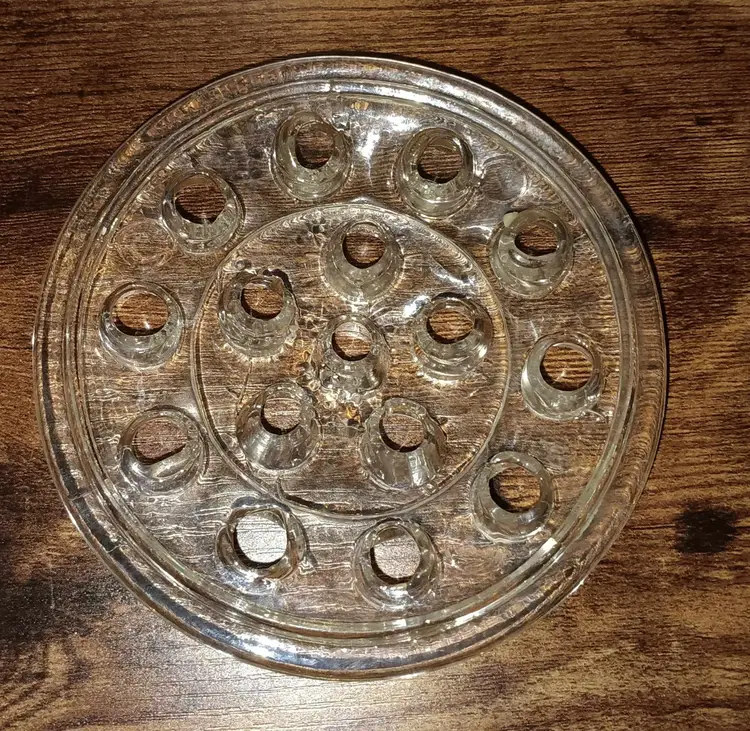 Vintage large glass flower frog. It helps keep the flowers even in the bottom of the vase. In good condition with no damages. It measures 5 inches across.