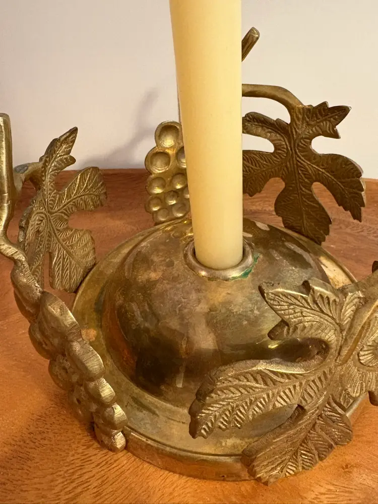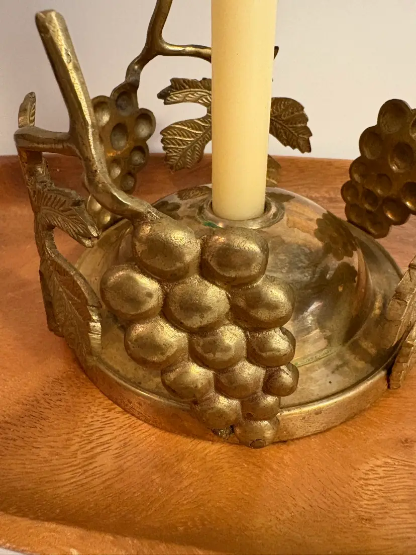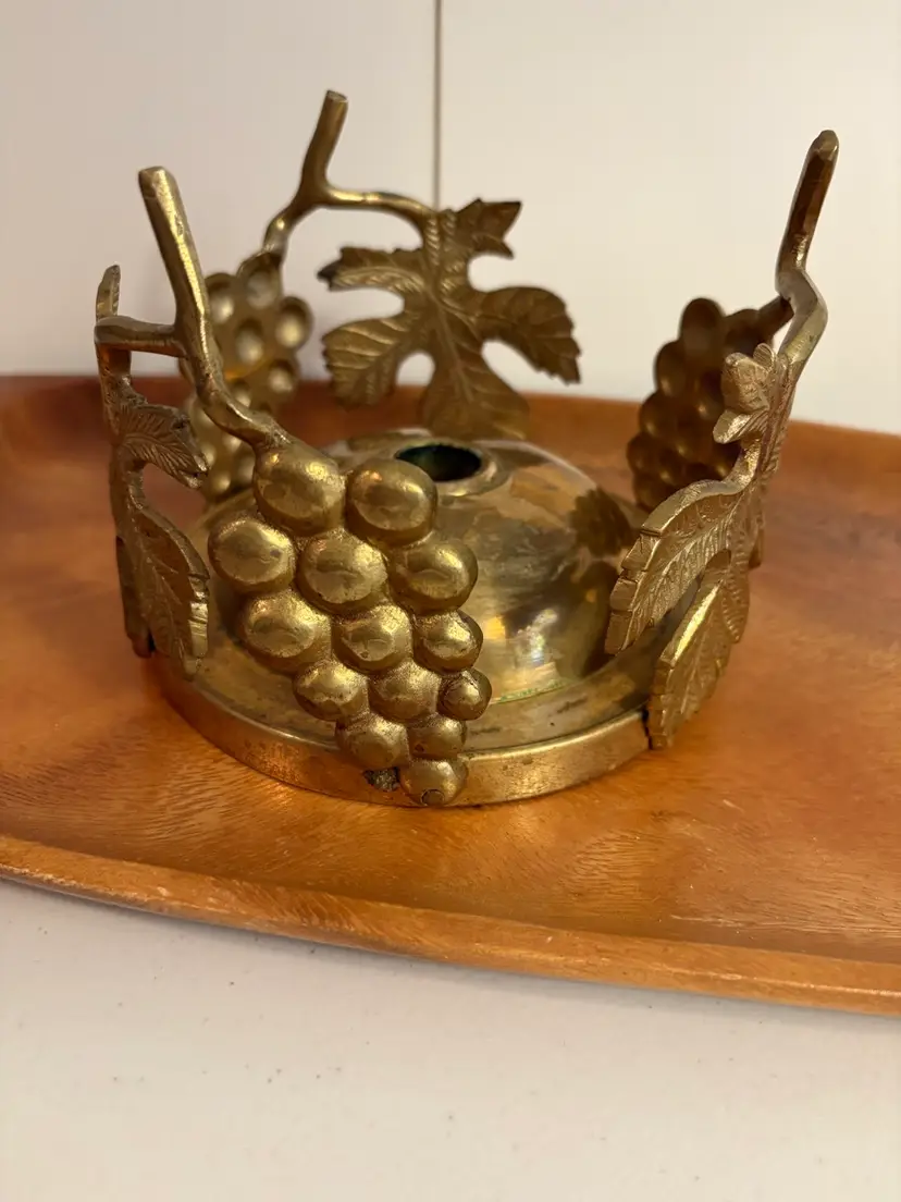 Add some charm to any room with this beautiful brass round centerpiece candle holder. The intricate design features grapes and leaves, making it a perfect addition to any occasion
