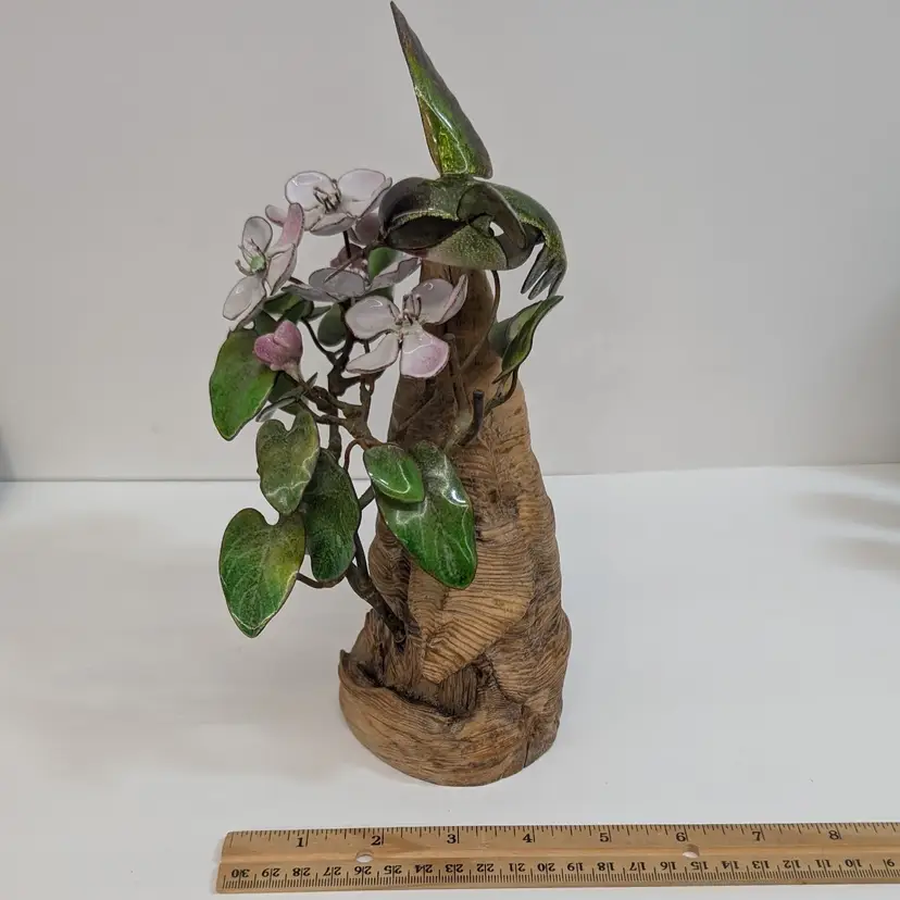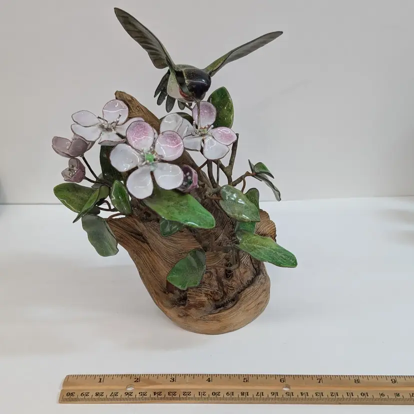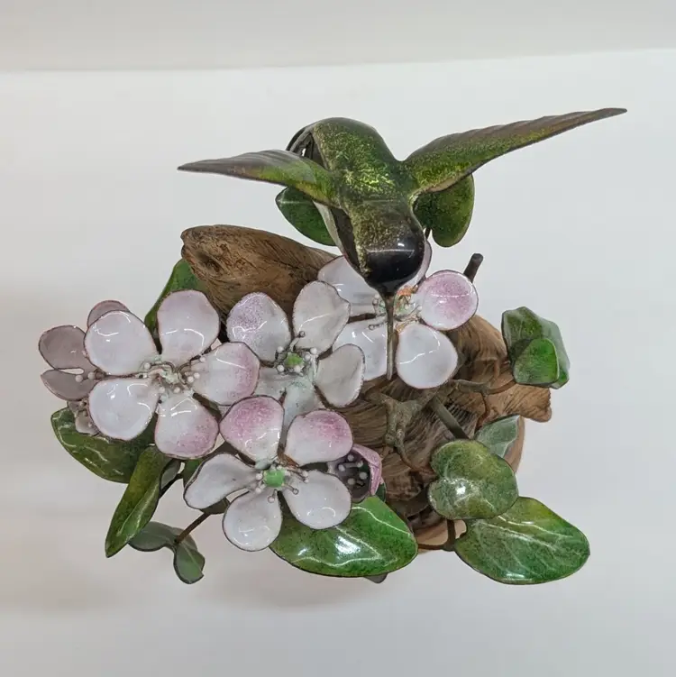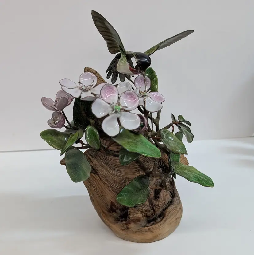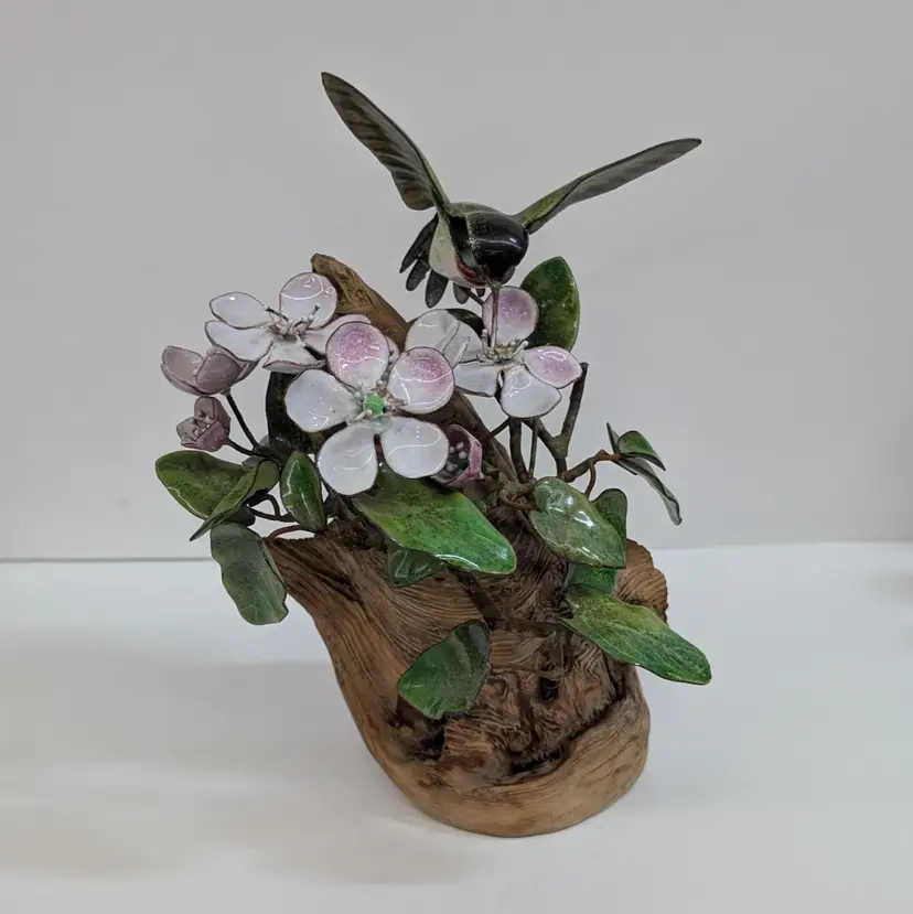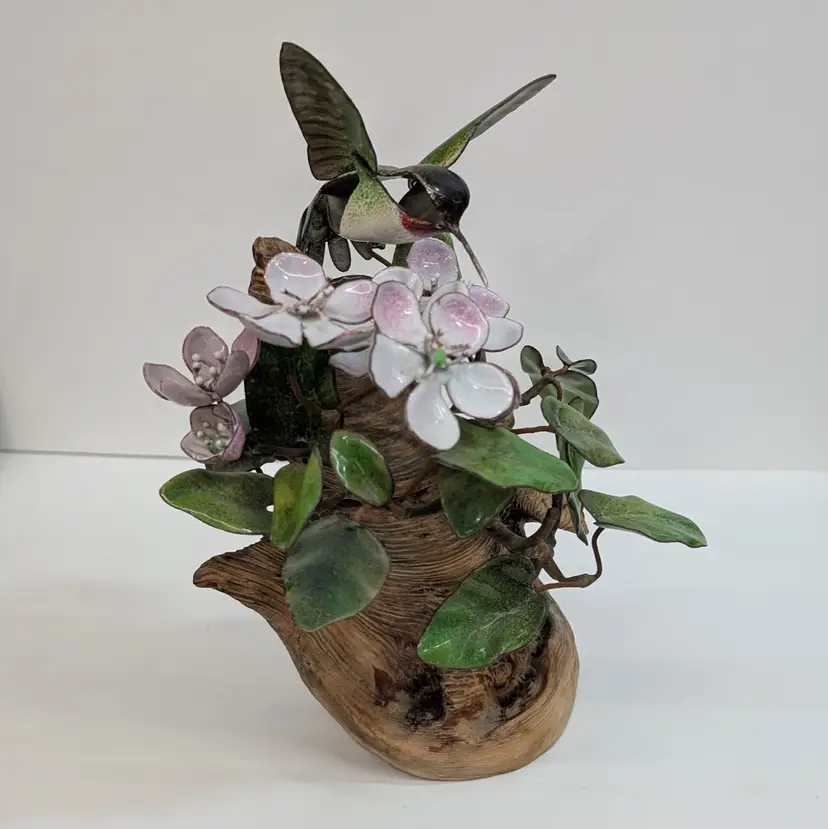 Gorgeous, enamel on copper artwork from Norman Brumm. This large sculpture features a ruby-throated hummingbird and what looks to be pink apple blossoms on a tall wood knot base. It has great colors and movement. In nice, vintage condition with a little enamel wear on a couple of the flower centers and the back tail of the hummingbird (see pictures). Stamped BRUMM on the base. Measurements ~ 6.5 x 5 x 9"