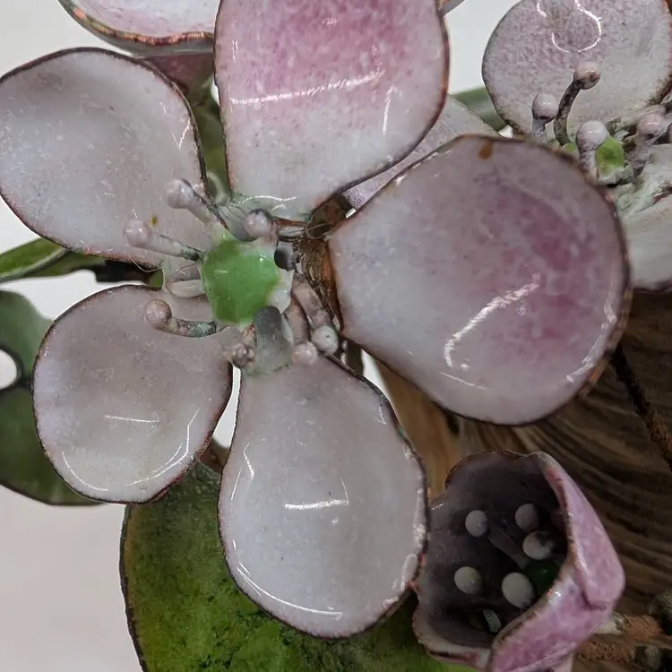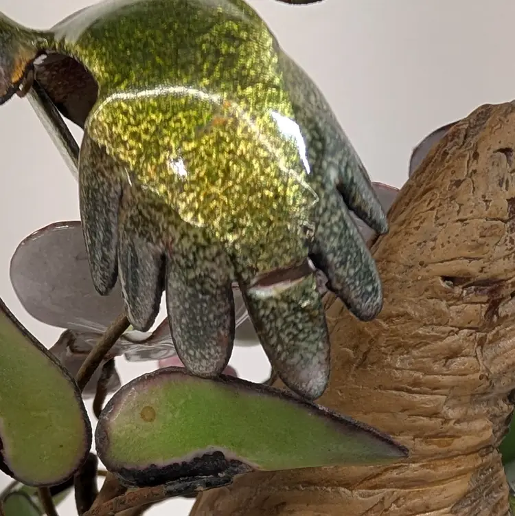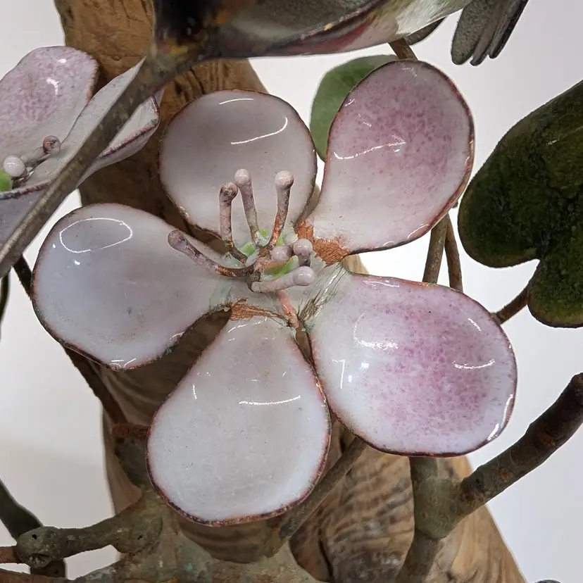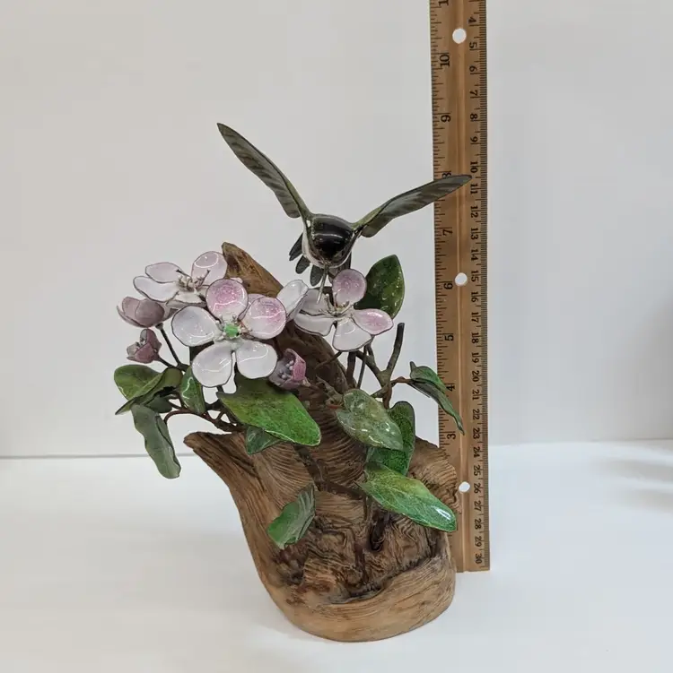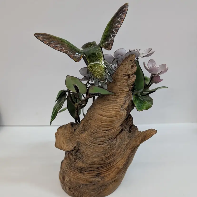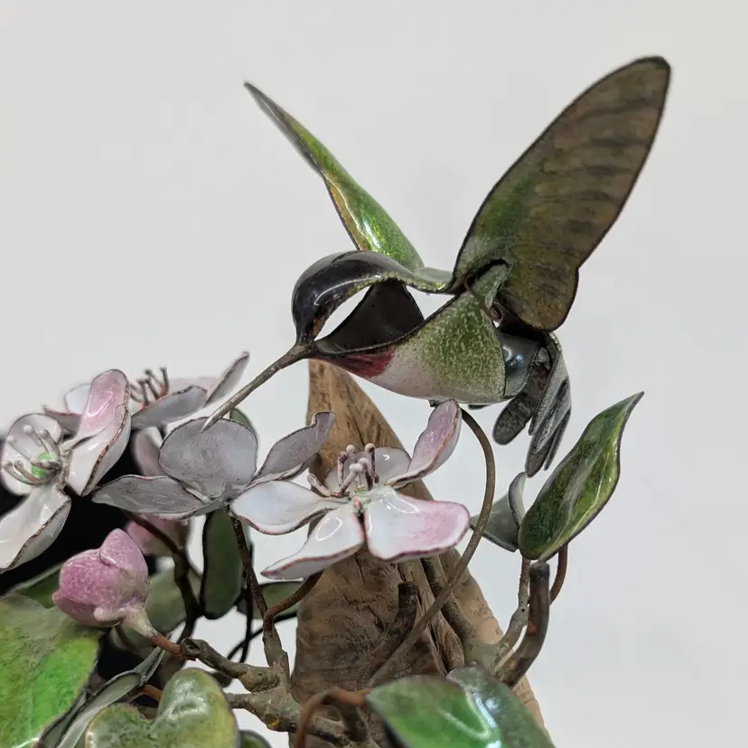Gorgeous, enamel on copper artwork from Norman Brumm. This large sculpture features a ruby-throated hummingbird and what looks to be pink apple blossoms on a tall wood knot base. It has great colors and movement. In nice, vintage condition with a little enamel wear on a couple of the flower centers and the back tail of the hummingbird (see pictures). Stamped BRUMM on the base. Measurements ~ 6.5 x 5 x 9"