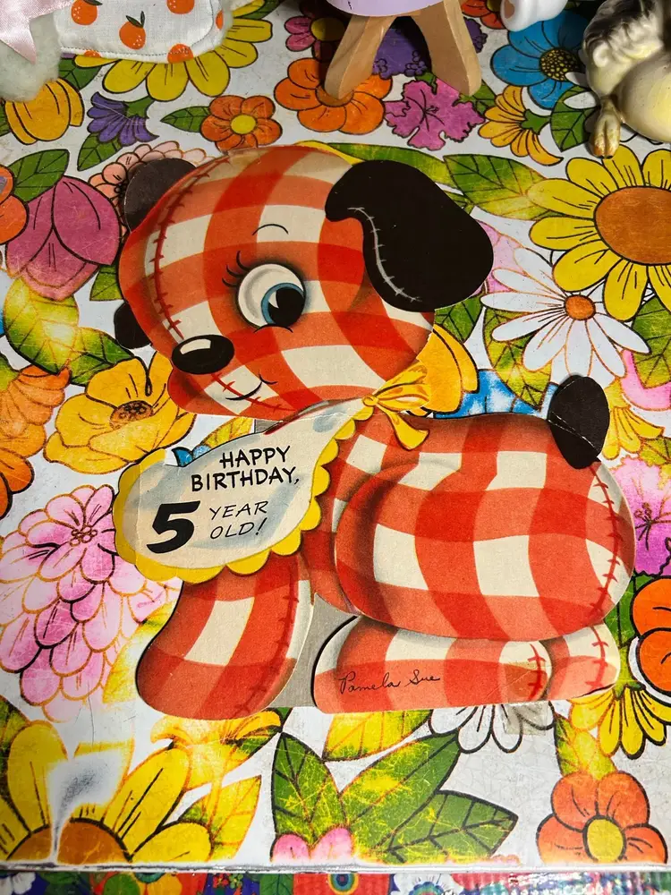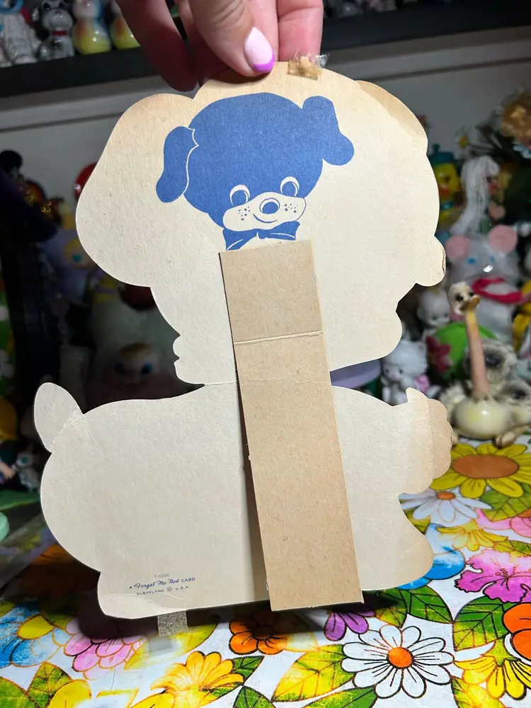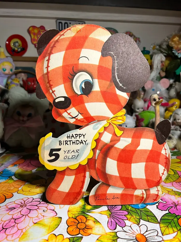 For sale! Vintage Large Plaid Kitschy Puppy Stand Up Greeting Card! Some wear. Old tape. 8.5 inches tall