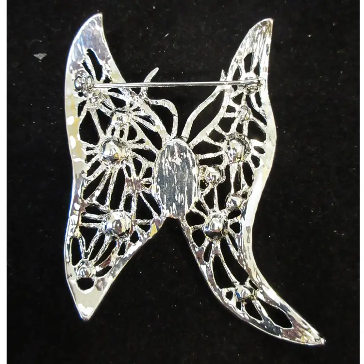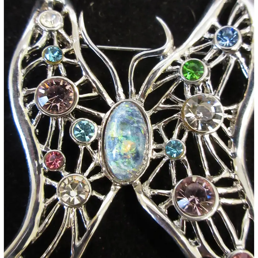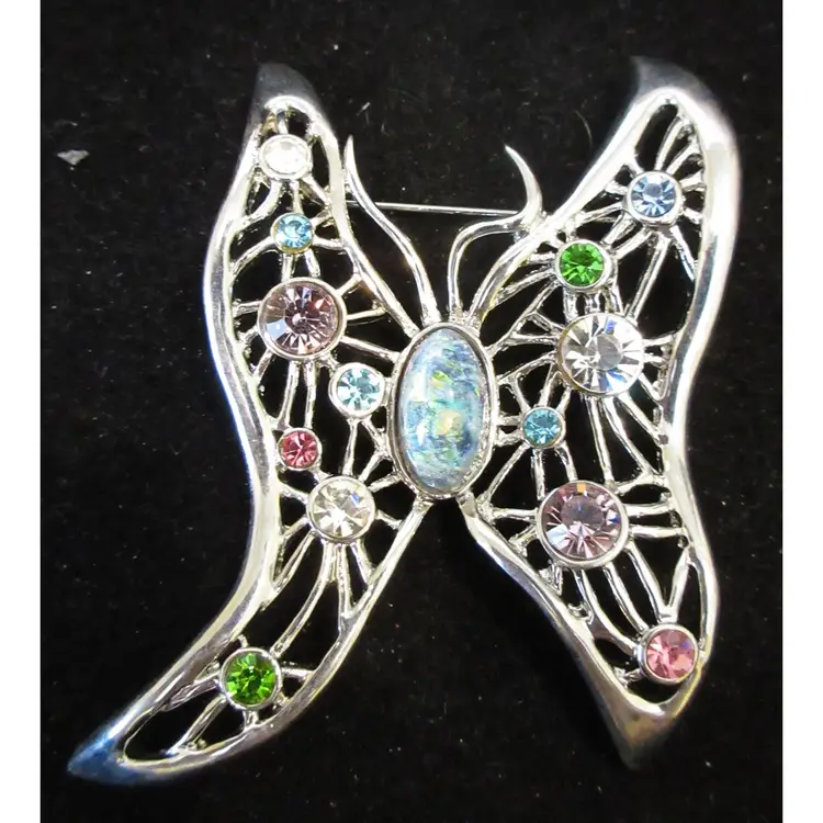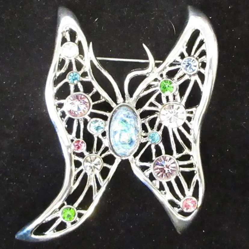 This is a BEAUTIFUL silver tone metal brooch in the shape of a stylized butterfly. The brooch is pretty large and chunky, with a height of 2.75 inches and a width of 2 inches. It is covered in rhinestones of many colors (pink, green, blue, red, clear), all bezel set, and an oval clear glass cabochon in the center. The cabochon covers a blue swirl design underneath. The effect is AMAZING! This butterfly has a pin back with a sliding C closure.