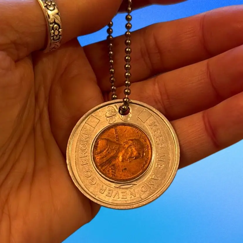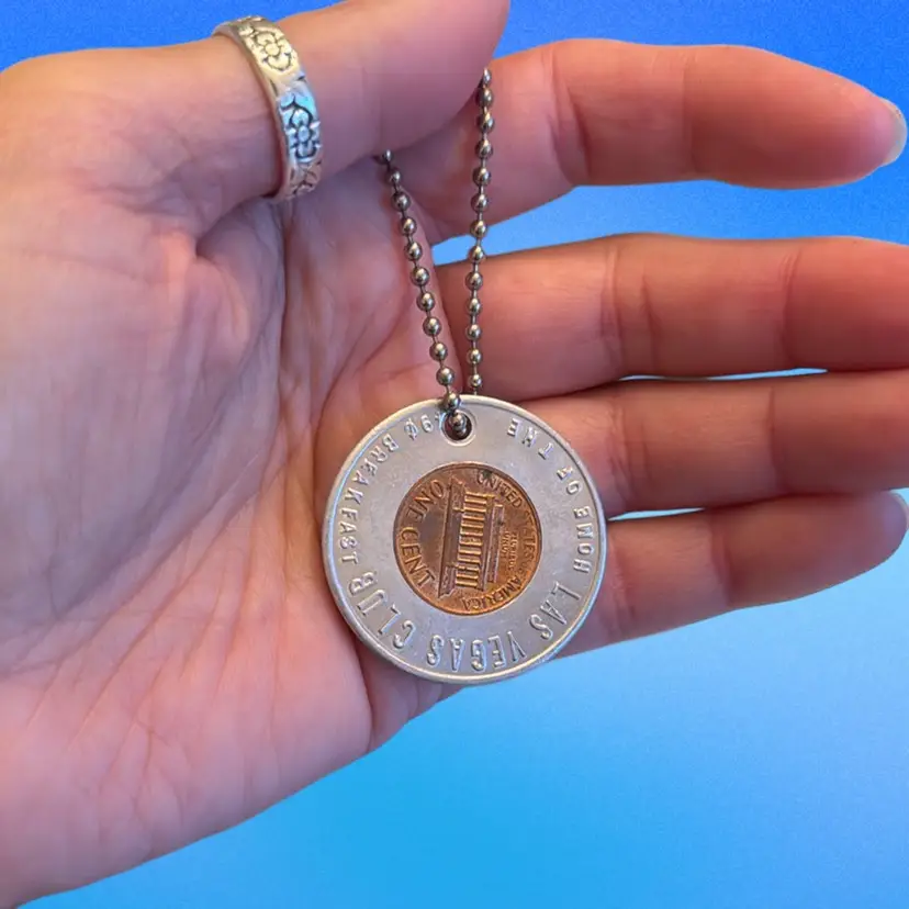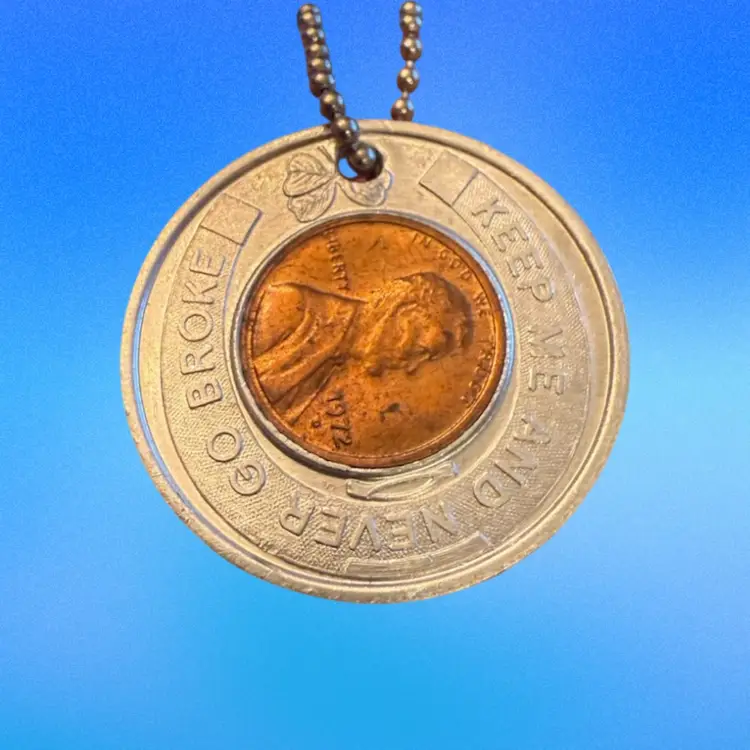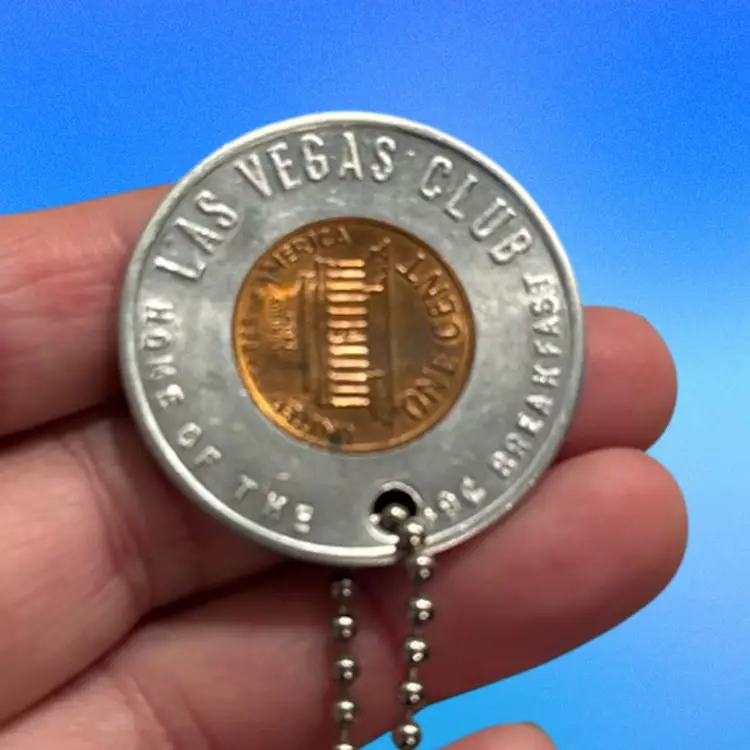 This is a vintage 1972 Las Vegas Club Home of the .75 Cent Breakfast Lucky Penny Advertising Key Chain. “ It says “ KEEP ME AN NEVER GO BROKE.” Great vintage condition.