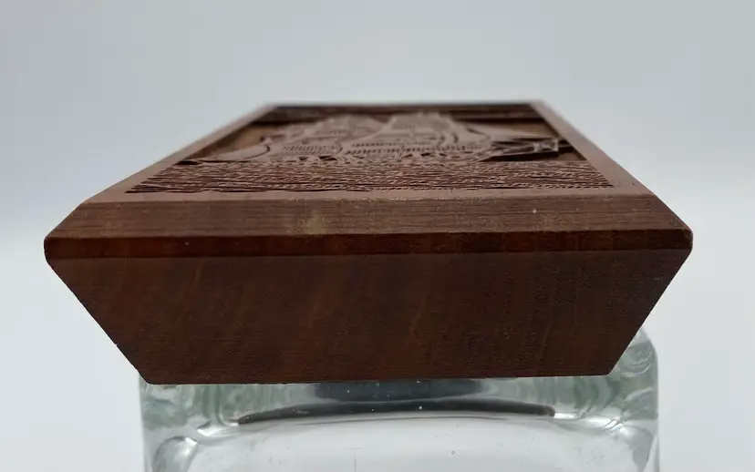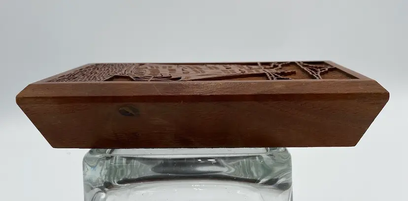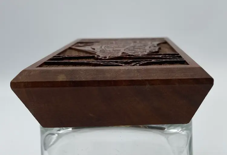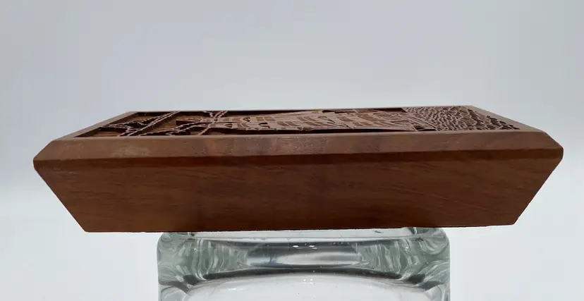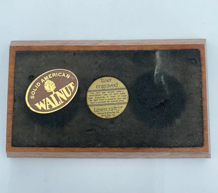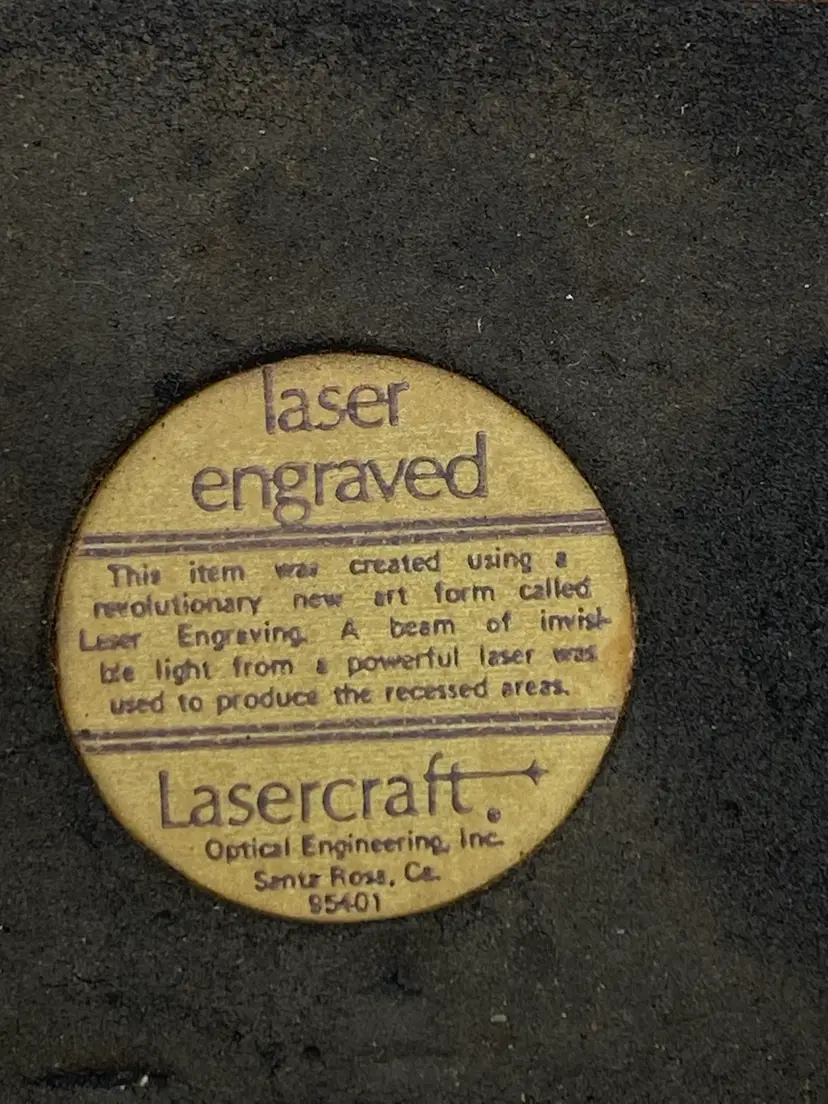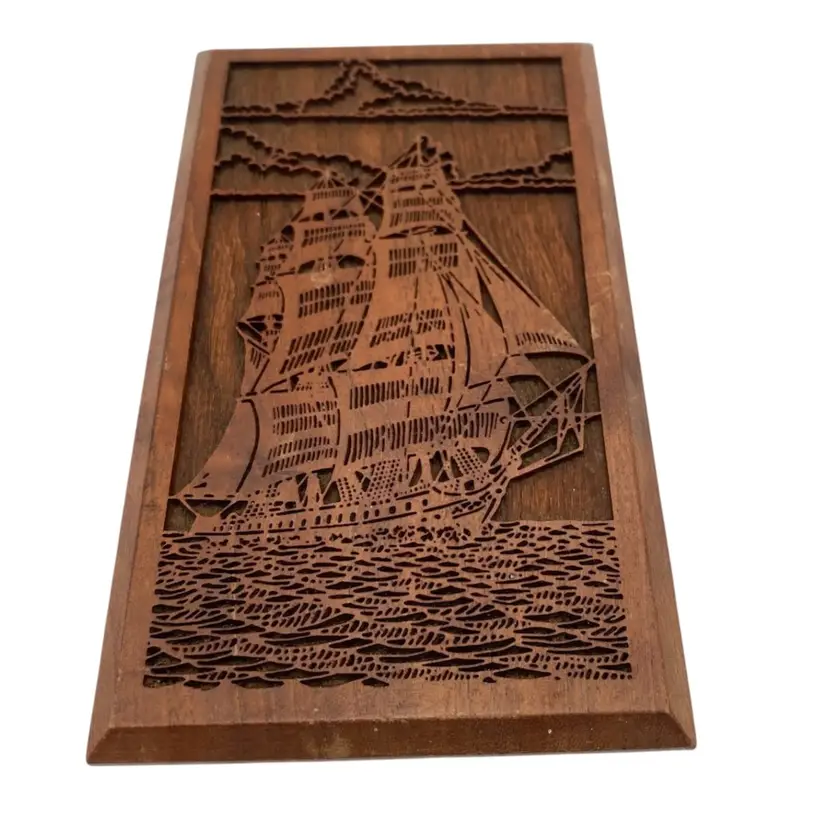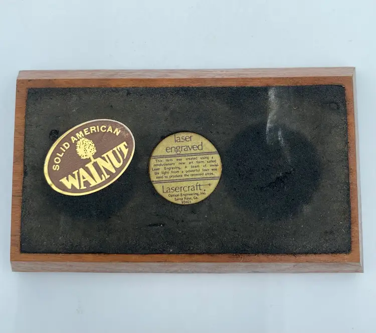 This vintage Lasercraft double-masted ship paperweight or art object is a unique and handmade decorative collectible made of American walnut wood. Featuring intricate laser engraving, this paperweight showcases the craftsmanship and quality of Lasercraft. The rich brown color and detailed design make it an interesting piece. It was created in Santa Rosa, California and comes with a label mounted on the bottom.