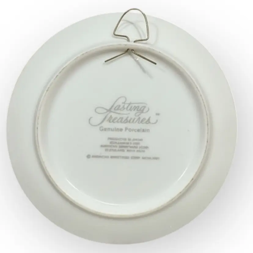 Vintage miniature porcelain collectible plate, made in Japan for the American Greetings Lasting Treasures line. Has a small wire hanger attached so it could be hung as a wall decoration, but could easily be removed too if you want to use as a trinket dish. Measures 4” in diameter and is trimmed in gold.