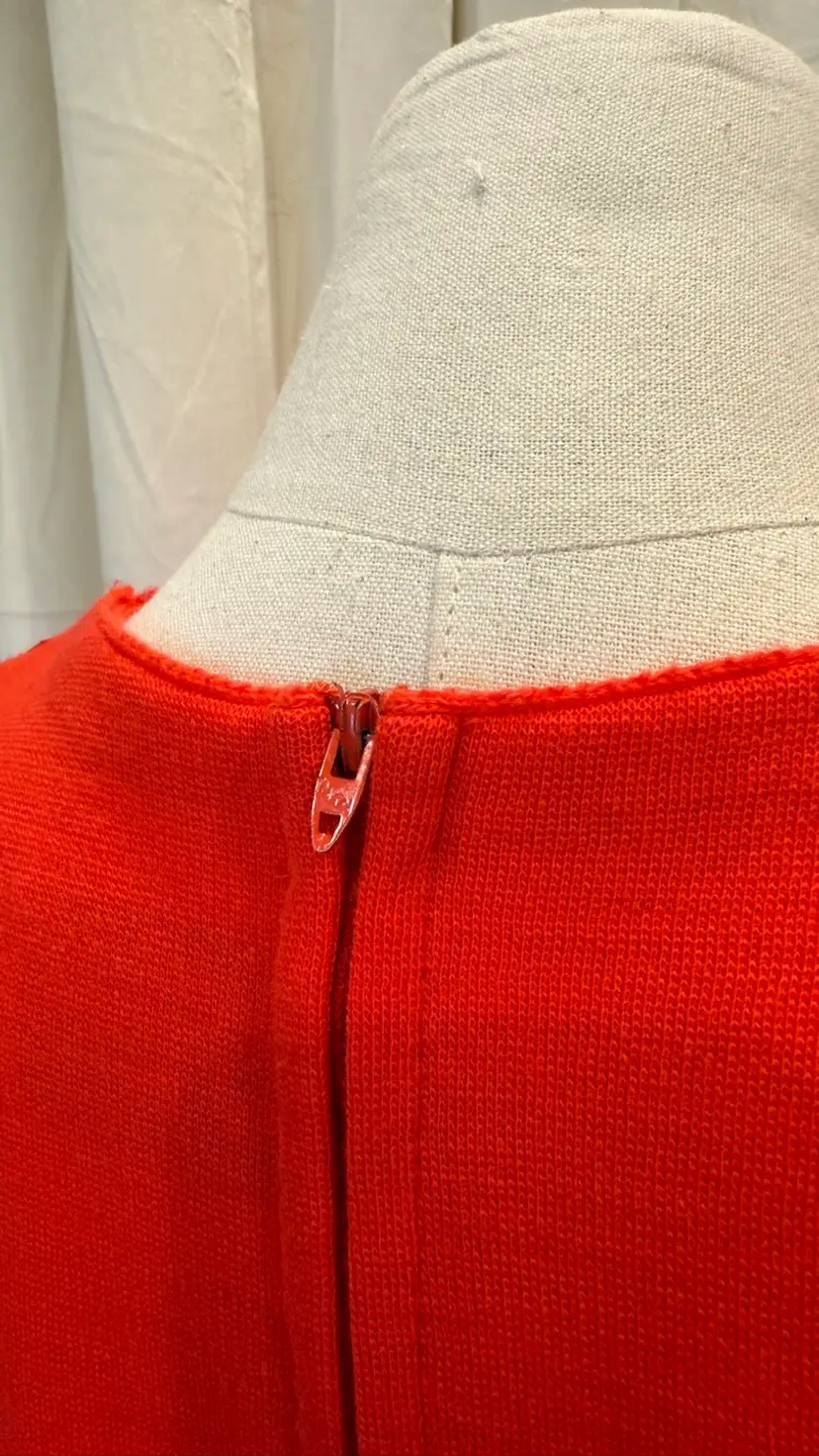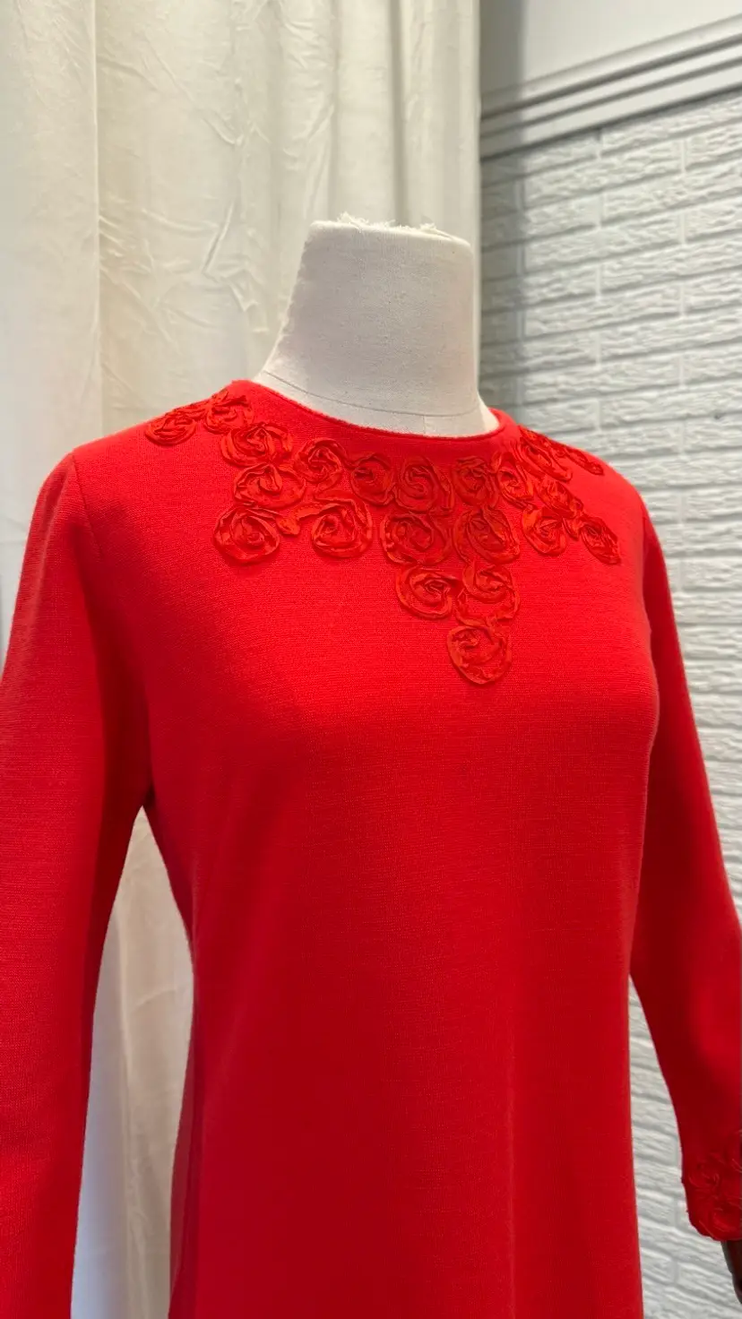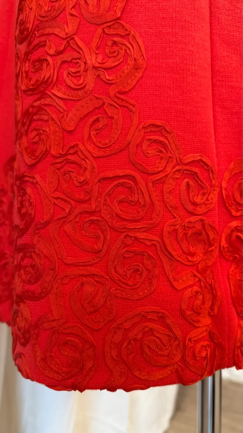 Excellent condition. Original red talon zipper is in excellent condition too. Red ribbon makes up a gorgeous rose rosette design. Apollo Knit brand.