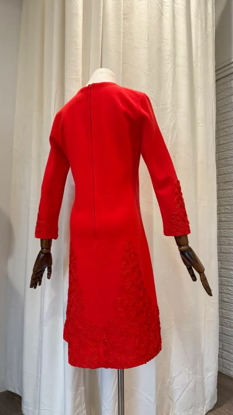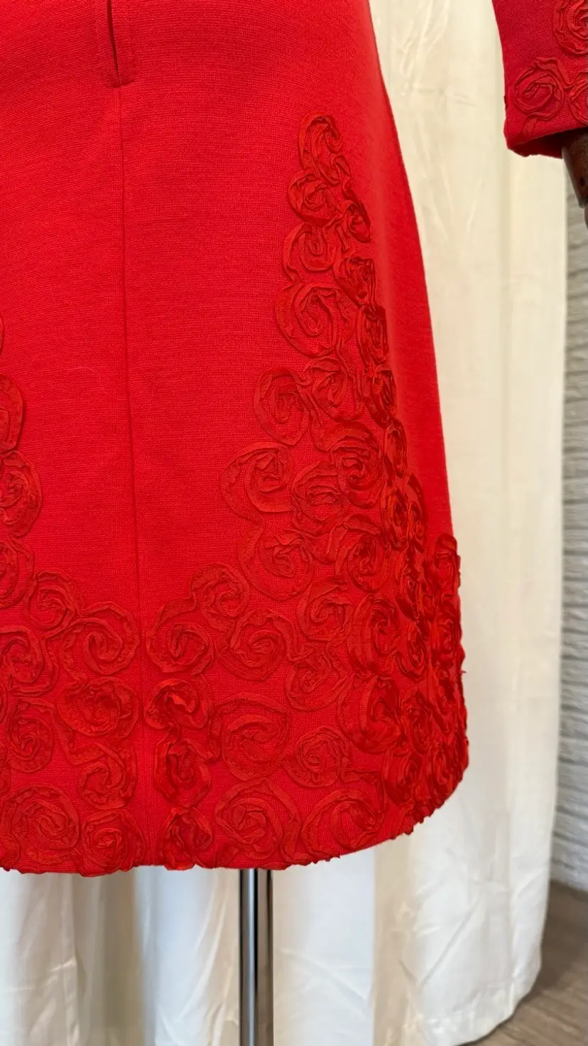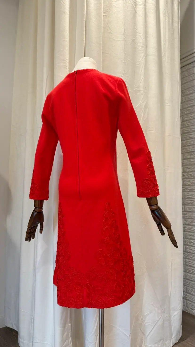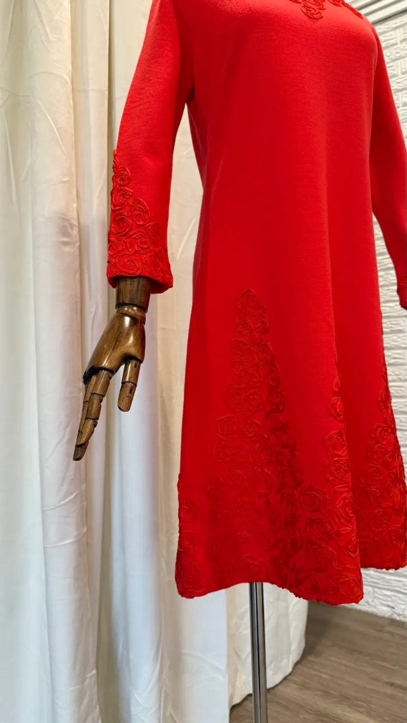 Excellent condition. Original red talon zipper is in excellent condition too. Red ribbon makes up a gorgeous rose rosette design. Apollo Knit brand.