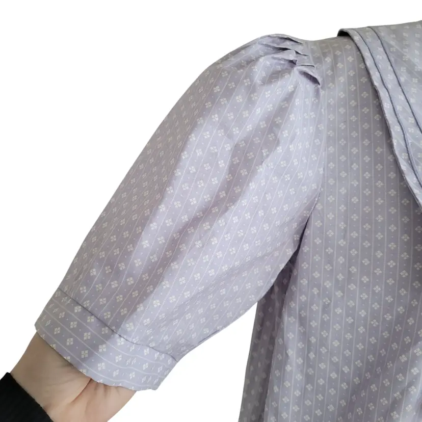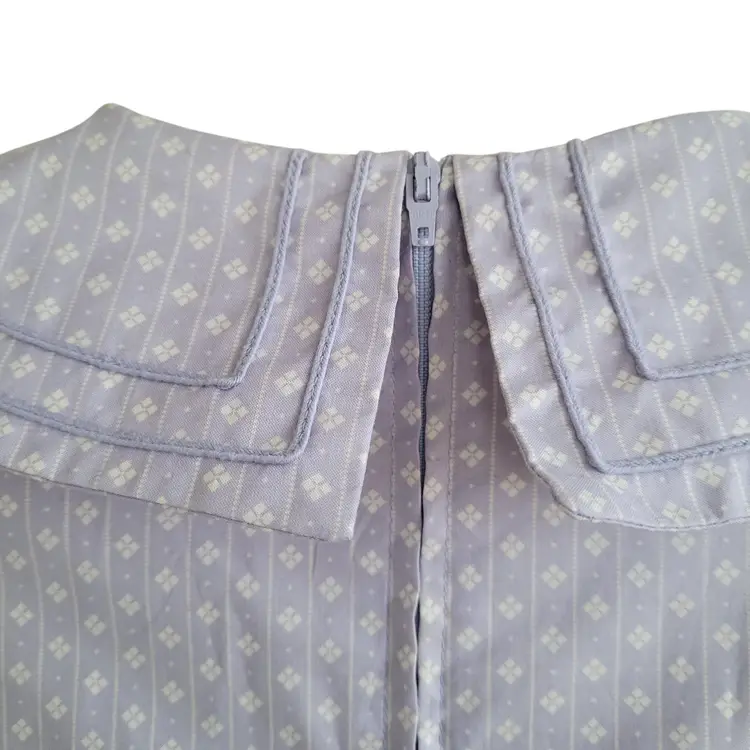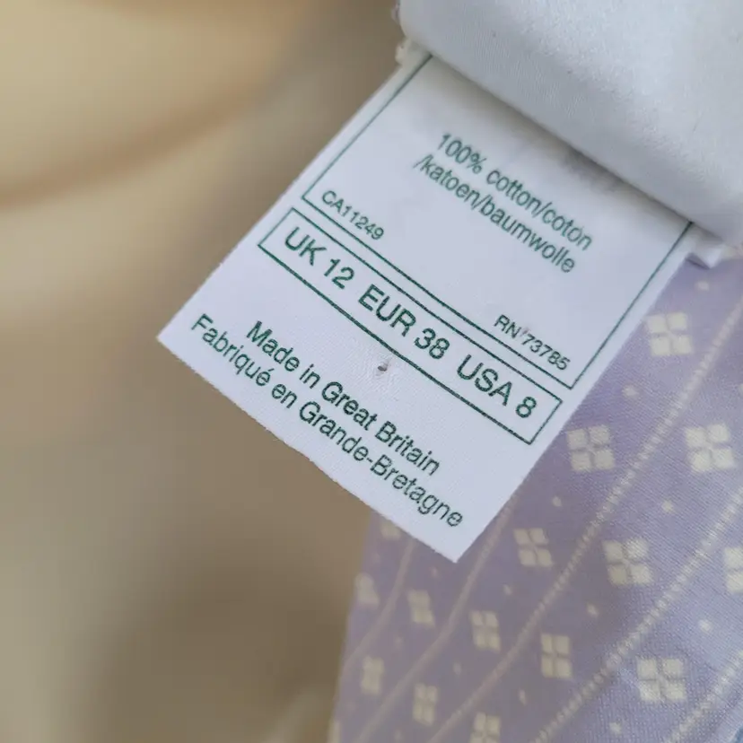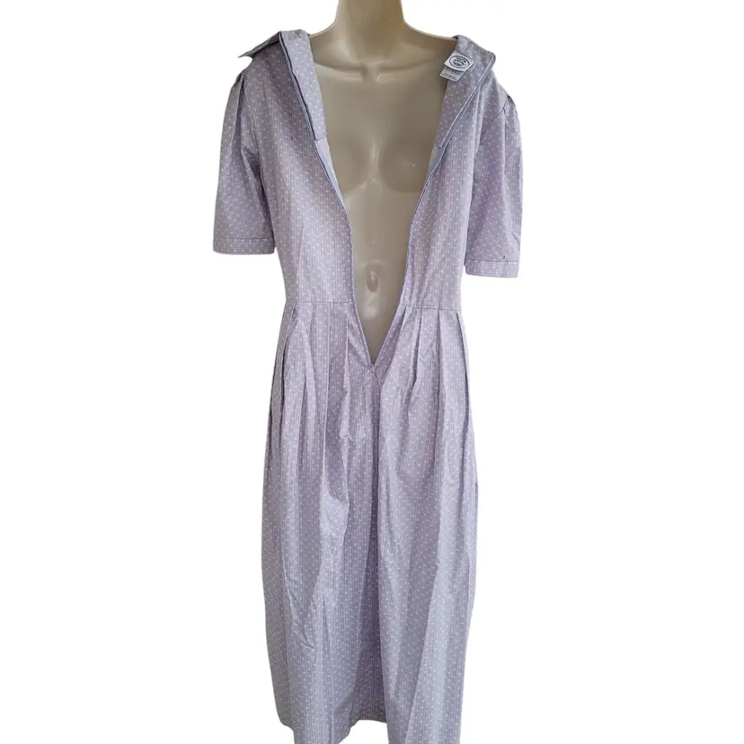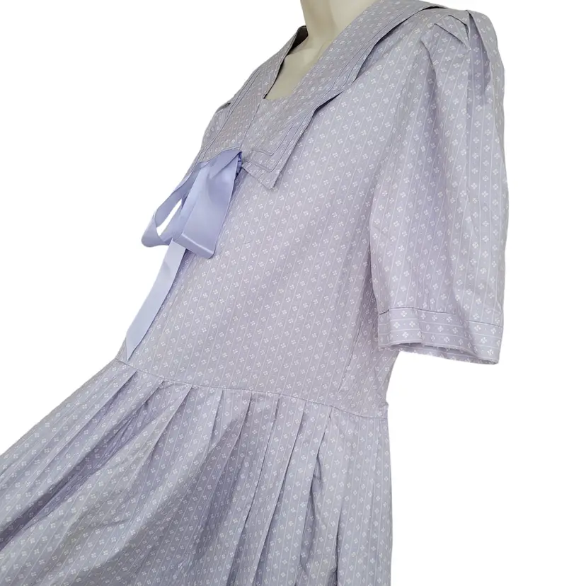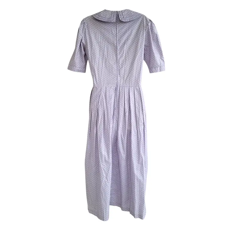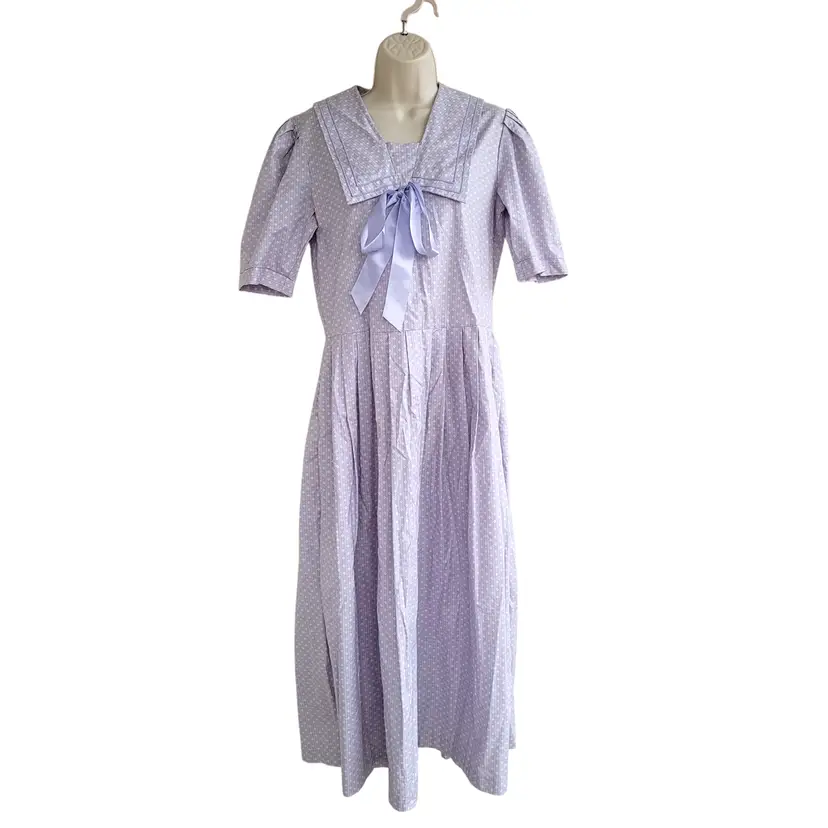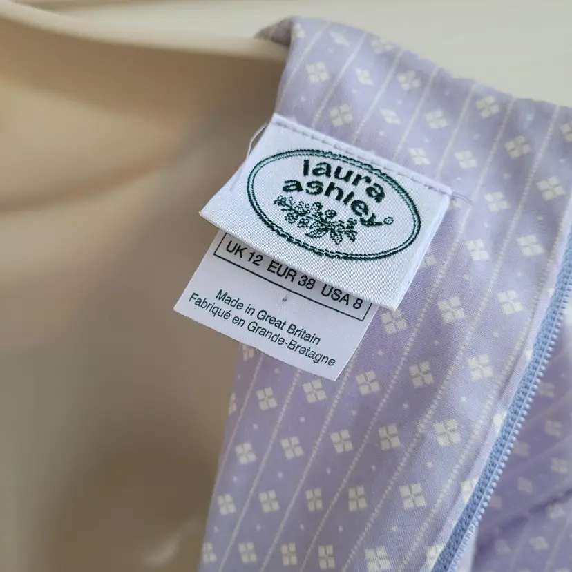 This is a beautiful vintage Laura Ashley dress made in Great Britain. Tagged a US size 8. It is a lilac color with a small white design. Dress is 100% Cotton. It is either warm washable or dry clean. Dress has puffy sleeves, and attached ribbon on the front, and a hidden zipper partially down the back.